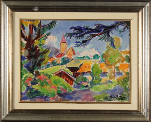 BELTRAME ALFREDO - Nato a Lipsia nel 1901. Morto a Milano nel 1996. Dipinto olio su tela raff. ''PAESAGGIO CON CASE''. Firmato in basso a destra. In cornice. Mis. Lung. cm. 40 Alt. cm. 30 ca.