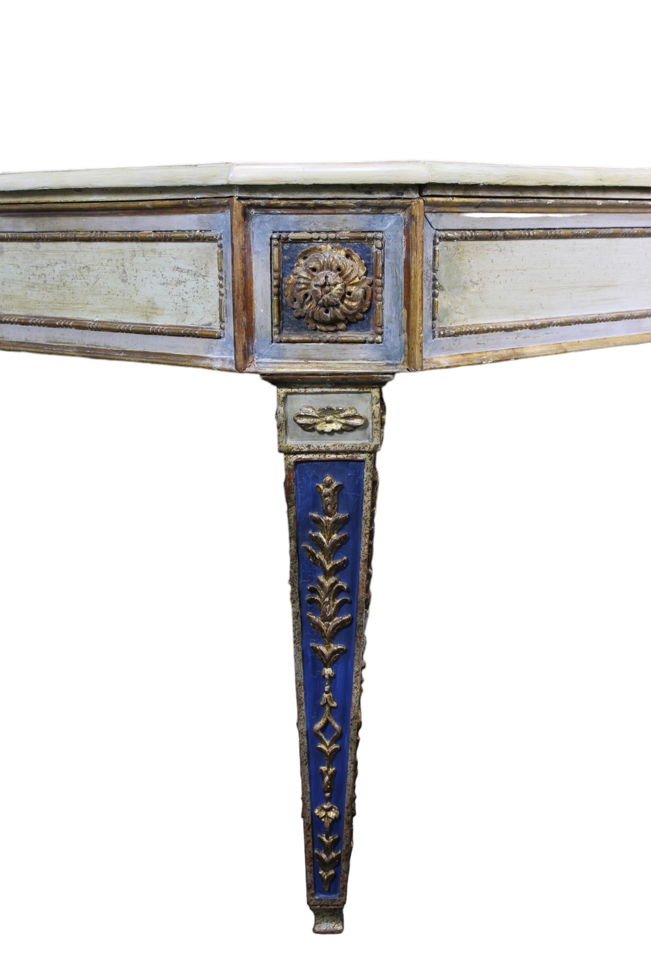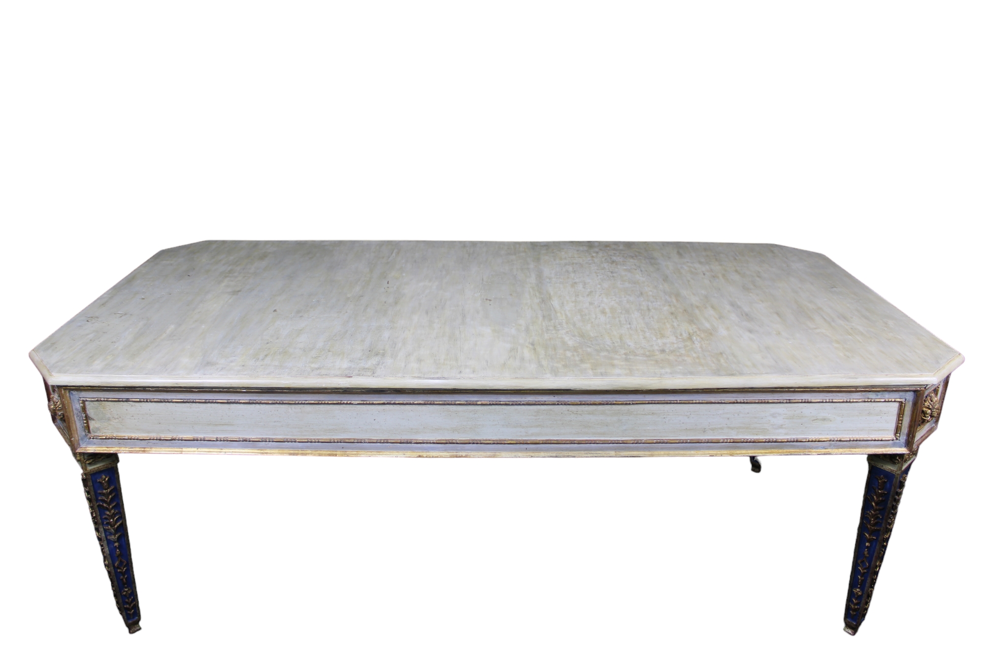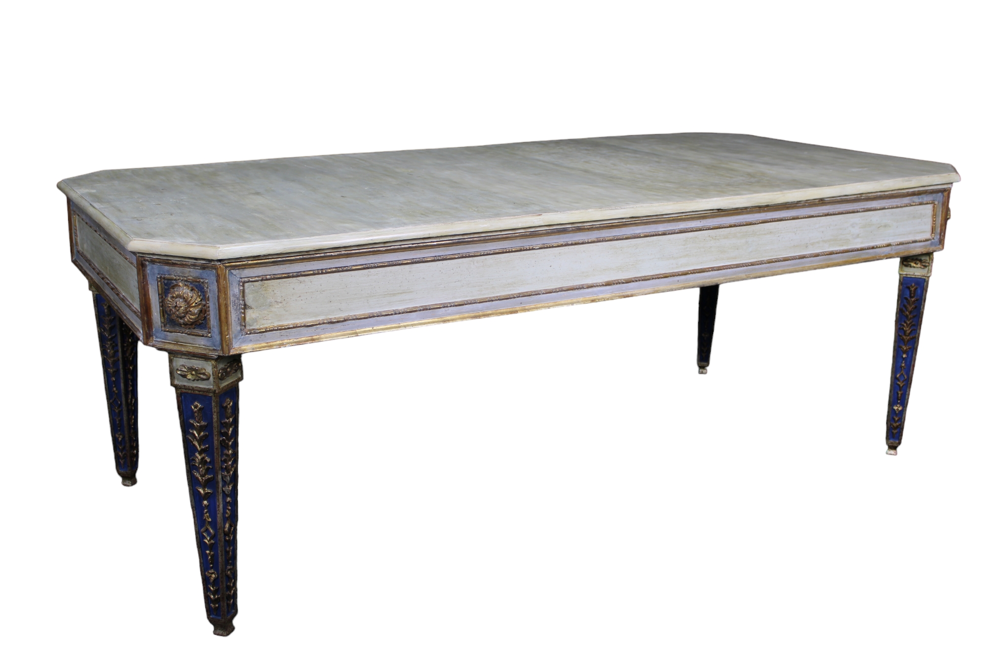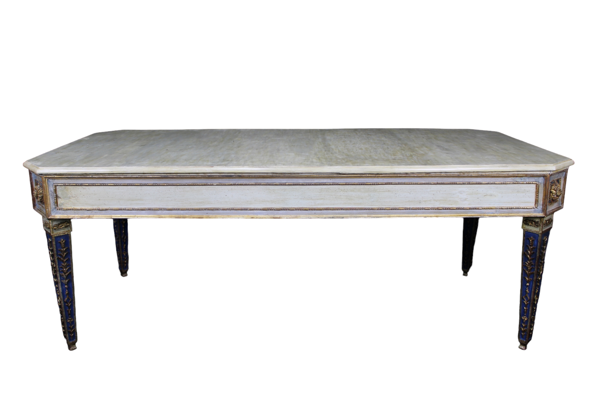 IMPORTANTE TAVOLO DA CENTRO DI GUSTO LUIGI XVI di forma rettangolare a quattro gambe in legno laccato a tre colori e dorato ad argento e mecca piano in legno laccato vecchi restauri alla laccatura e usure del tempo Sicilia XIX Secolo h cm 84,5 x 224 x 112