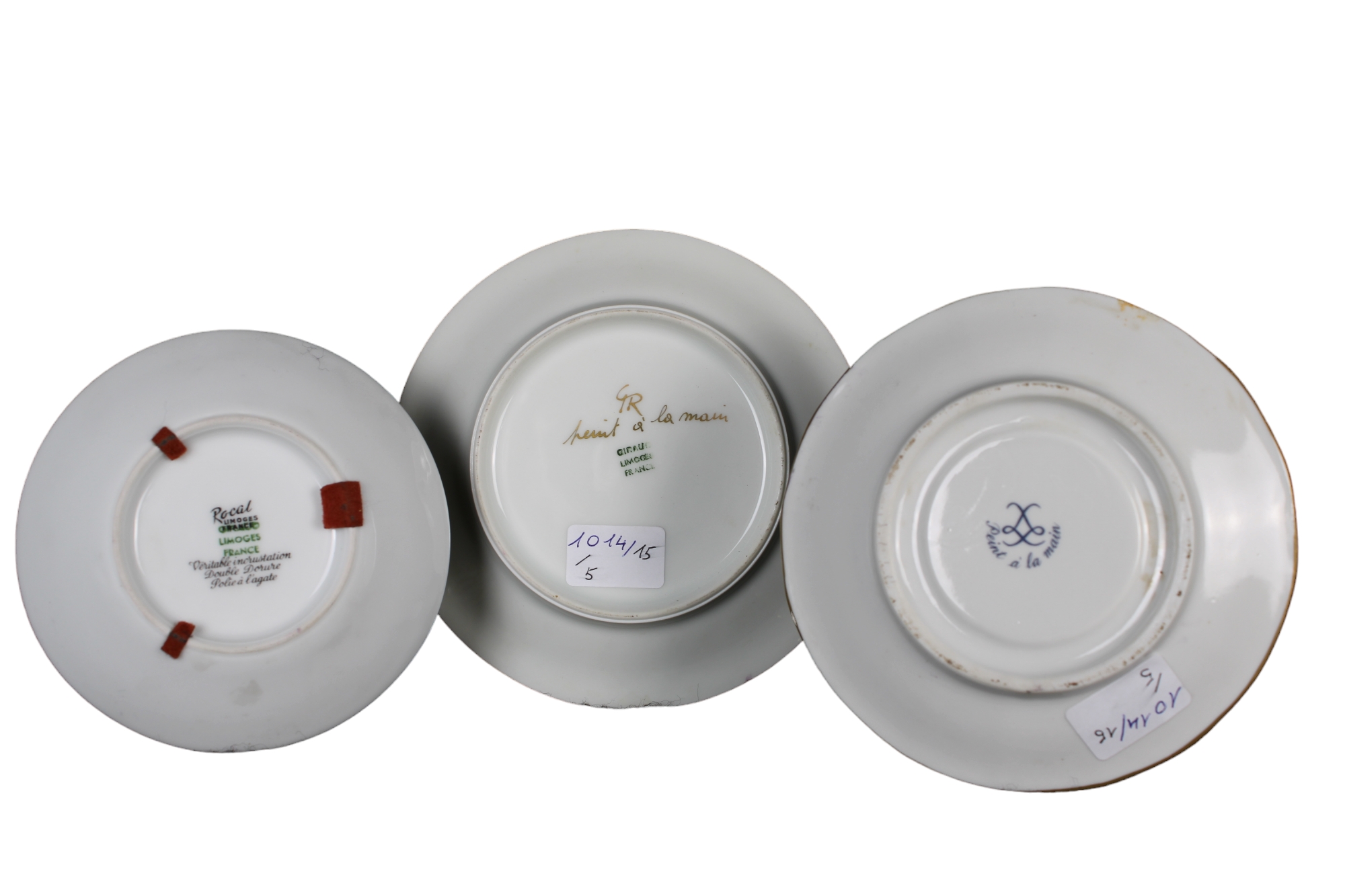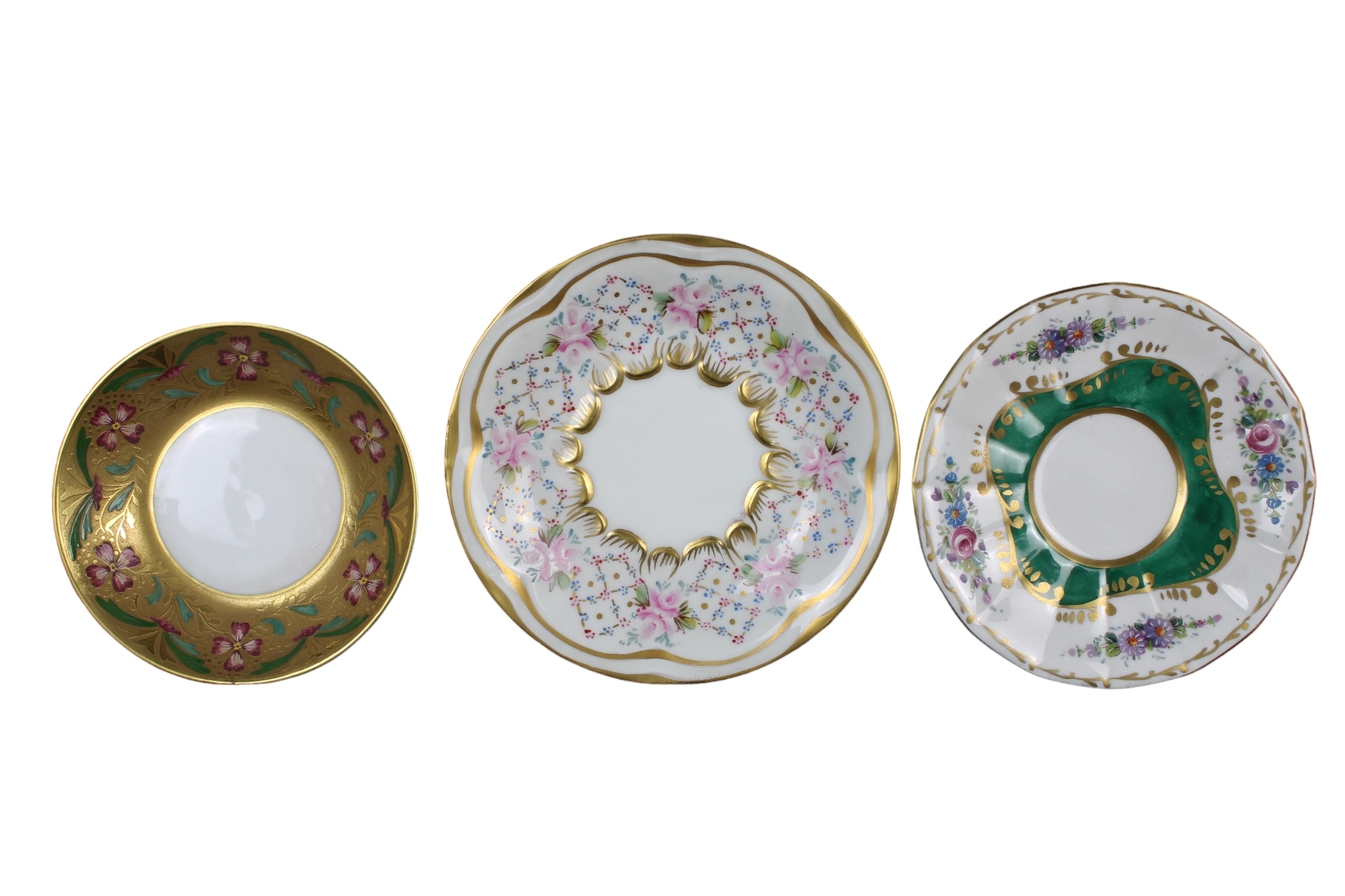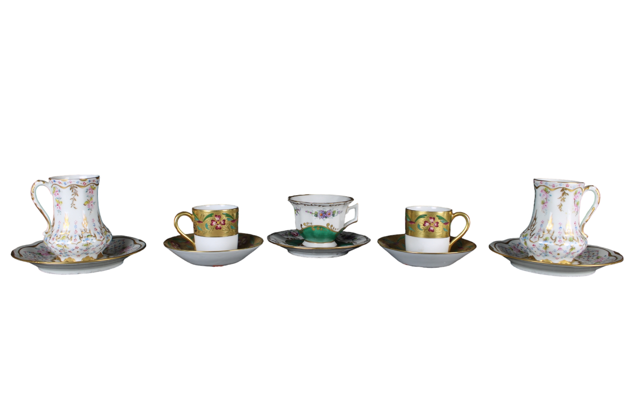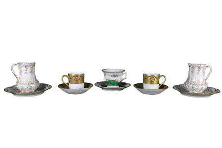 5 TAZZE CON PIATTINI in porcellana e lumeggiature in oro manifatture ed epoche diverse misure varie
