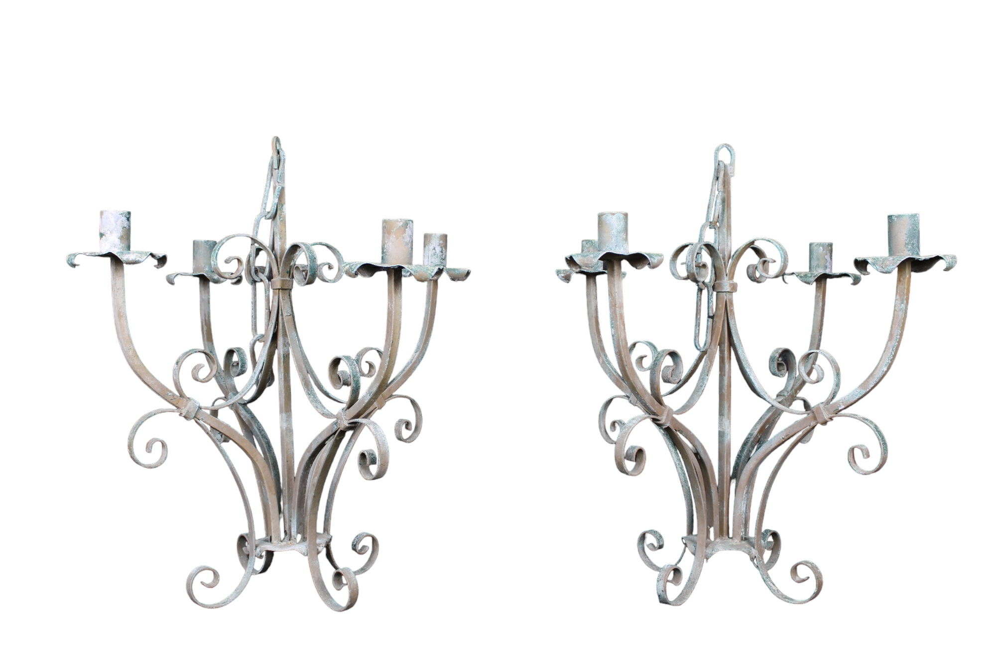 COPPIA DI CURIOSI LAMPADARI in ferro battuto a 4 bracci Sicilia primi 900 h cm 76 x 73 x 73