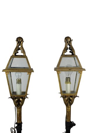 COPPIA DI LANTERNE DA BASTONE in metallo dorato Sicilia primi 900 h cm 74 x 23,5 x 23,5