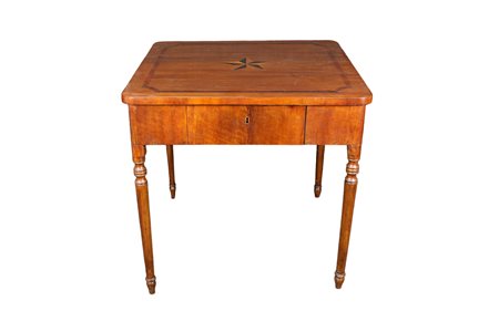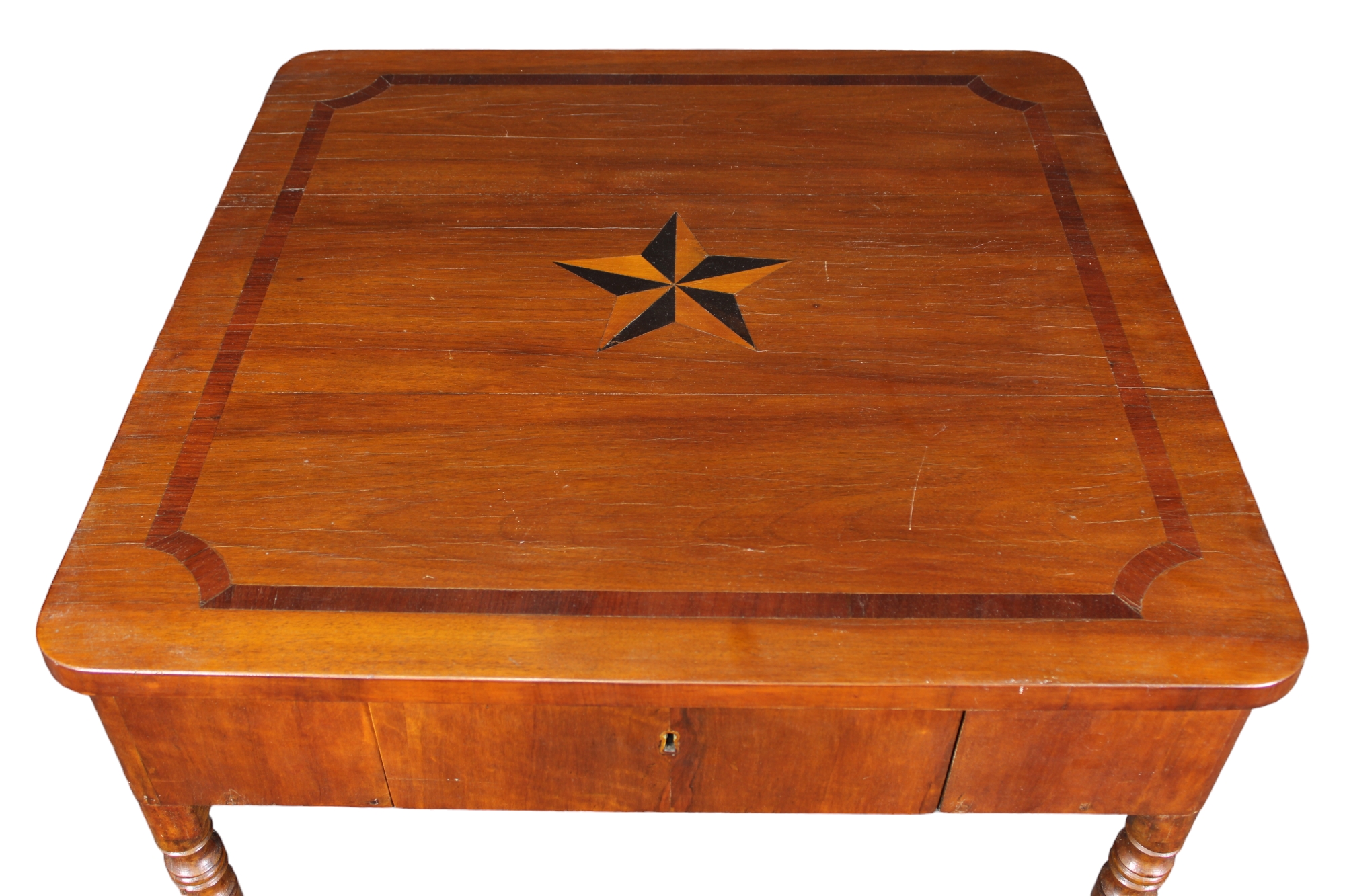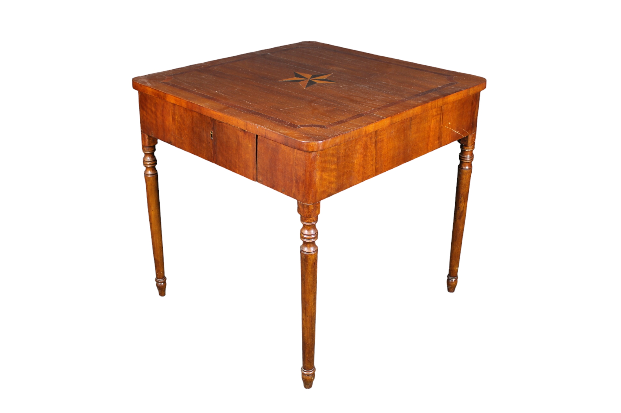 TAVOLO DA GIOCO in legno di noce con piano intarsiato in varie essenze di legno con cassetto Sicilia XIX secolo h cm 75 x 77 x 77