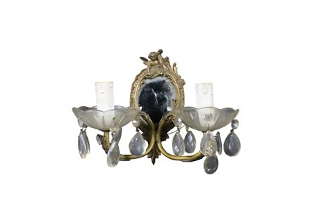 COPPIA DI APPLIQUES A DUE BRACCI in ottone con specchierina raffigurante angeli coppe e pendenti in vetro Sicilia primi 900 h cm 20 x 24 x 13
