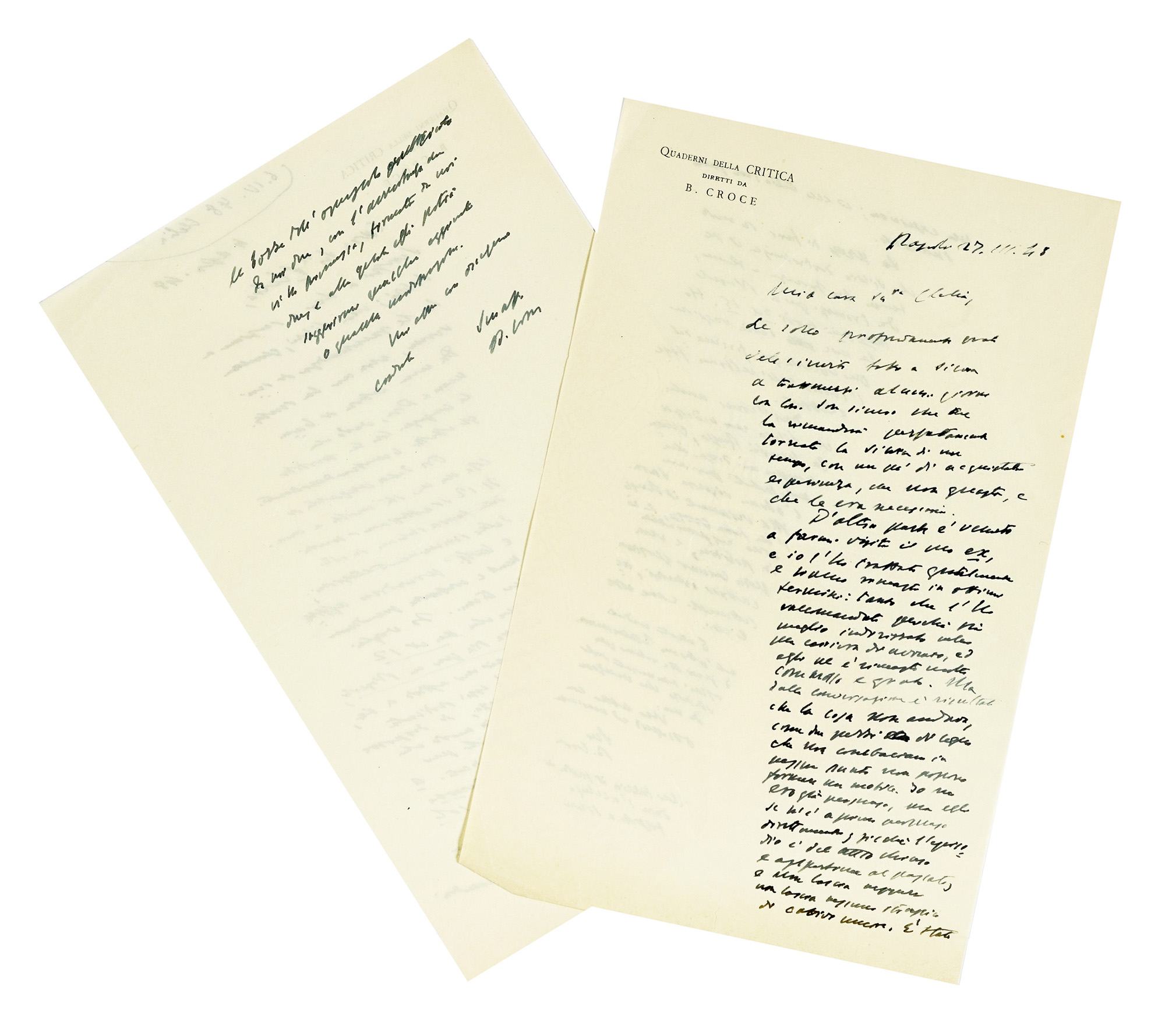 Manoscritti a inchiostro nero. Alcune buste conservate. Nel lotto anche 3 lettere scritte dalla moglie di Croce con firma autografa del filosofo e alcune carte dattiloscritto. Dimensioni varie. (19)Lettere fittamente vergate. Alcune su carta intestata Quaderni della Critica diretti da B. Croce. Da studiare.