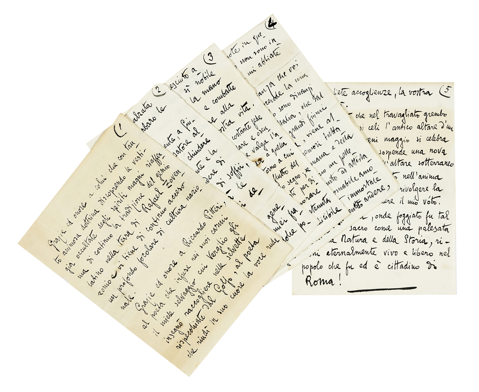 Manoscritto a inchiostro nero. 5 carte scritte al recto (numerate da d'Annunzio). Le carte n. 2 e n. 4 presentano un rinforzo al verso. Nella carta n. 3 è presente una bruciatura, volutamente realizzata per non permettere la lettura di alcune parole. Dimensioni: 220x165 mm. SI AGGIUNGE: Duse Eleonora. 1 telegramma. (2)Testo letto da d'Annunzio l'11 maggio 1902 all'Hotel de la Ville di Trieste - dove il poeta alloggiava con Eleonora Duse – in occasione di un banchetto organizzato in loro onore e promosso, tra gli altri, da Giulio Caprin e Riccardo Pitteri. Il testo venne pubblicato da Il Piccolo e l'autografo regalato da d'Annunzio la sera stessa a Francesco Salata che alcuni anni più tardi verrà nominato Segretario Generale per gli Affari Civili. Incipit: Grazie e onore a colui che con tanto animosa dottrina discoprendo le vestigia occultate dagli spiriti magni riafferma di continuo la tradizione del genio latino [...]. Explicit: Che l'idioma, onde foggiato fu tal verso a noi sacro come una palesata legge della Natura e della Storia, risuoni eternalmente vivo e libero nel popolo che fu ed è cittadino di Roma!