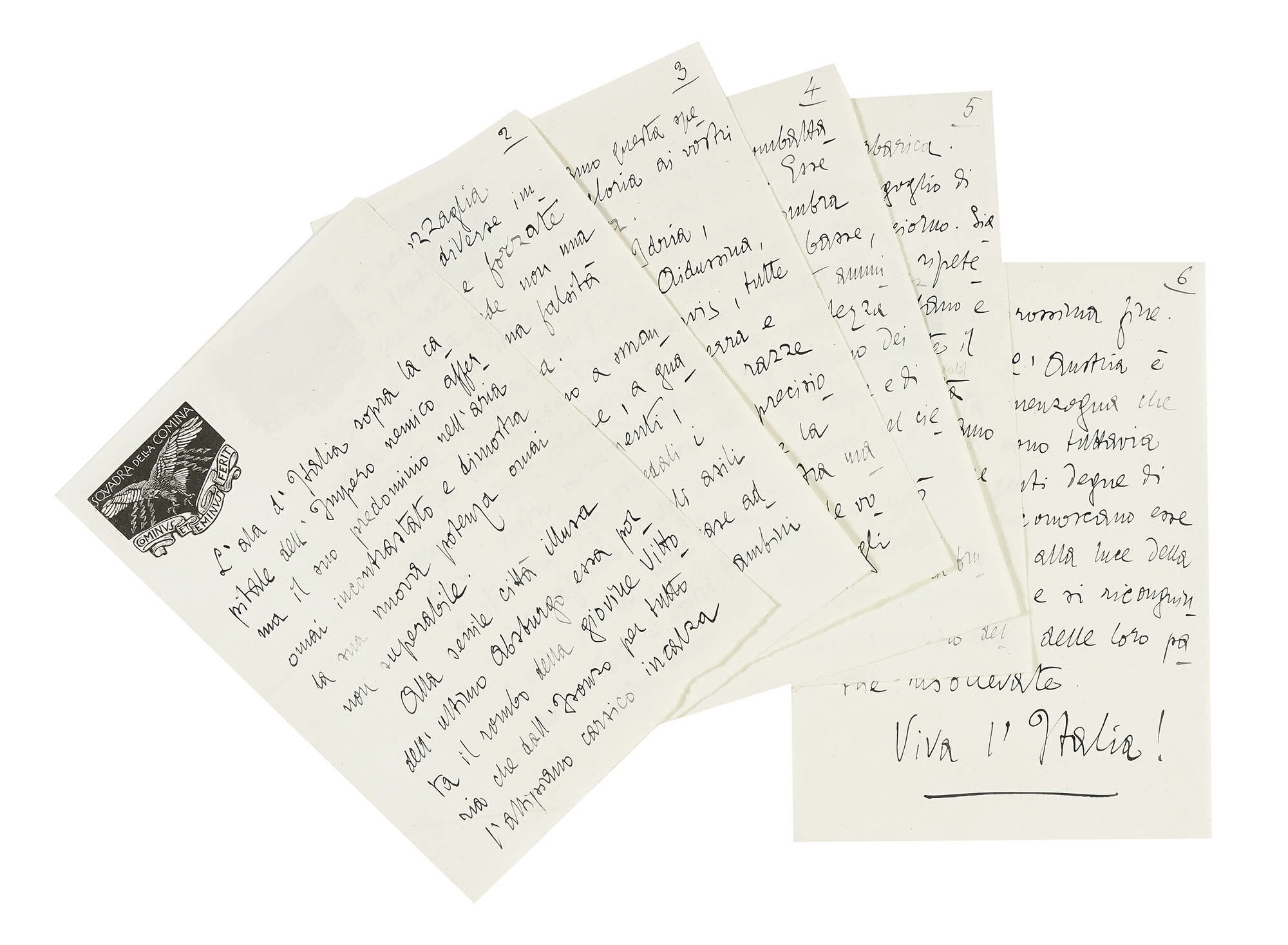 Manoscritto a inchiostro nero. 6 carte scritte al recto (numerate dall'autore). Carta con filigrana, con intestazione Squadra della Comina / Cominus et eminus ferit. Dimensioni: 270x200 mm. (1)Incipit: L'ala d'Italia sopra la capitale dell'Impero nemico afferma il suo predominio nell'aria ormai incontrastato e dimostra la sua nuova potenza ormai non superabile. Alla senile città illusa dell'ultimo Asburgo essa porta il rombo della giovine vittoria che all'Isonzo per tutto l'altipiano carsico incalza in un'accozzaglia di genti diverse imbrancate e forzate a difendere senza fede non una patria libera ma una falsità costituita in violenza [...]. Explicit: L'Austria è una decrepita menzogna che crolla. Se vi sono tuttavia nell'Impero genti degne di sopravvivere, riconoscano esse le loro origini alla luce della nostra vittoria e si ricongiungano alle vite delle loro patrie sollevate. Viva l'Italia!