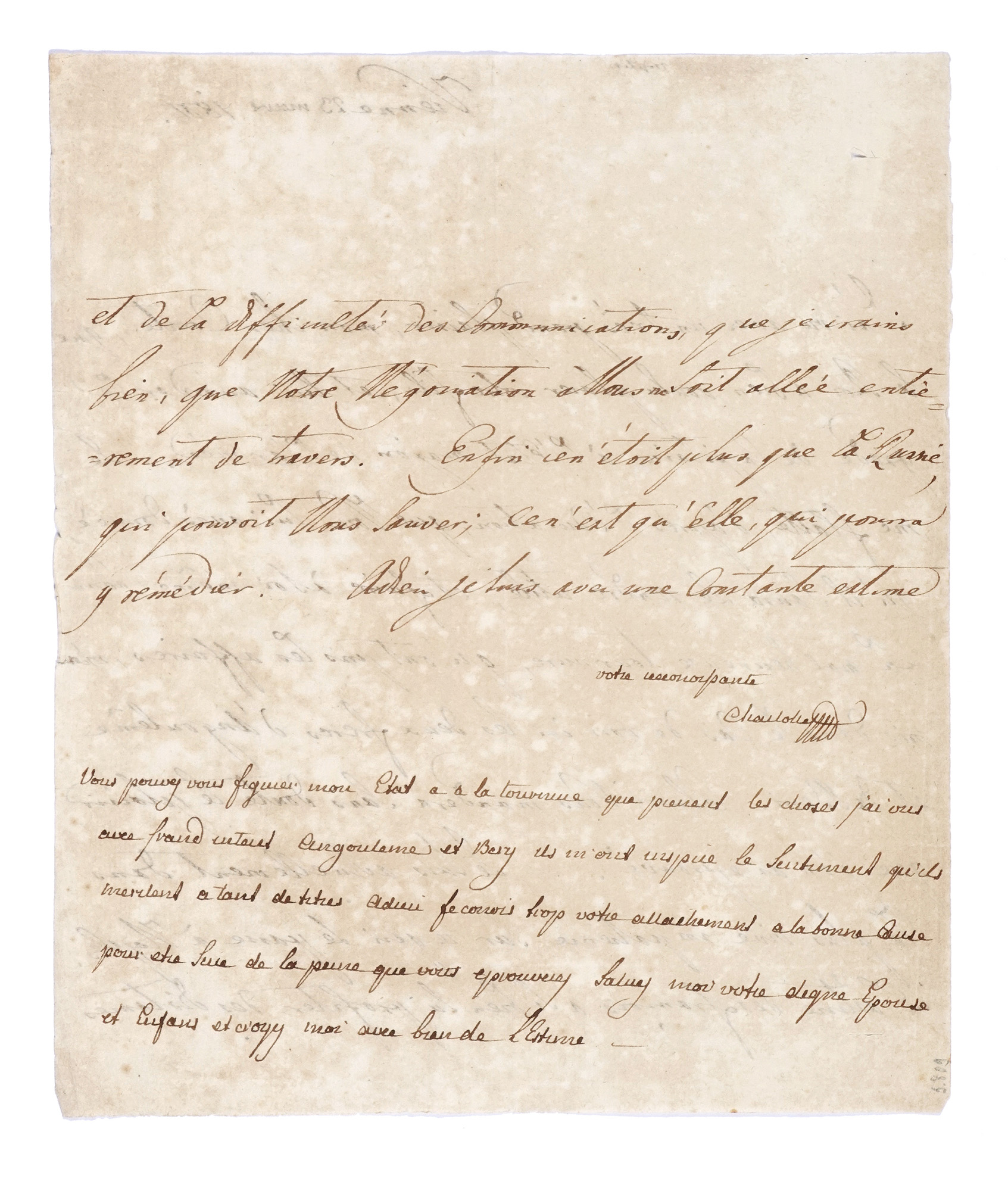 Manoscritto a inchiostro bruno. Testo in francese di mano di segretario; firma e nota finale di sette righe (sempre in francese) autografe. 1 carta, scritta recto e verso. Filigrana coronata. Conservata cartelletta intestata Librairie ancienne Georges Privat - Paris con applicato ritaglio di scheda in francese relativa al documento e nota di acquisto a penna marzo '69. Dimensioni: 190x225 mm. (1)Maria Carolina, regina di Napoli, figlia di Maria Teresa d'Austria e sorella di Maria Antonietta (regina consorte di Luigi XVI, ghigliottinata durante la Rivoluzione Francese) scrive ad un amico conte, raccontandogli delle sue preoccupazioni per Napoli, e delle sue negoziazioni con la Russia (dello Zar Paolo I), perché intermediasse nelle vicende belliche tra la Francia di Napoleone e il regno di Napoli. J'ai vu avec très grand plaisir, mon cher Comte, que le Roi a bien voulu placer votre fils, et lui accorder le grade de Capitain de l'Etat major de l'armée [...] La malhereuse tournure qu'ont pris les affaires, m'a mis dans le cas de voir ici les deux frères d'Angoulême et de Berri [...] Je suis actuellement dans la plus vive impatience sur ce qui se passe à Naples. L'astuce des Français a si bien su profiter des distances et de la difficulté des communications que je crains que notre négotiation à nous ne soit allée entièrement de travers. Enfin ce n'était plus que la Russie, qui pouvait nous sauver ; ce n'est qu'Elle, qui pourra y remédier [...] votre reconnaissante Charlotte M(arie).