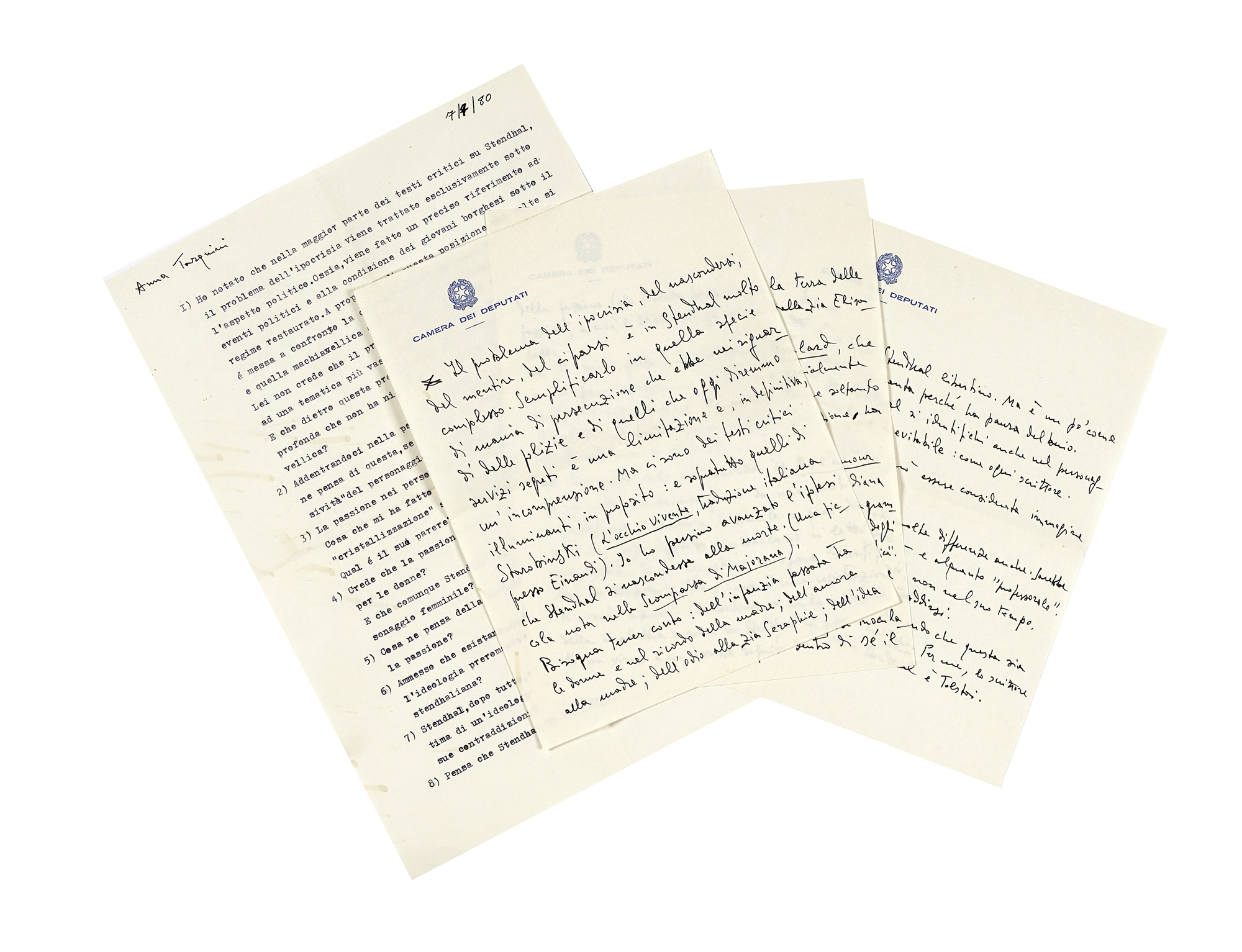 Manoscritto a inchiostro nero. 3 carte scritte al recto con intestazione Camera dei Deputati. Conservata anche la lettera dattiloscritta contenente le domande e la busta intestata, col nome della destinataria autografo di Sciascia. Dimensioni 210x295 mm. (1)Sciascia, profondo conoscitore di Stendhal, (scriverà qualche anno dopo Stendhal e la Sicilia), risponde magistralmente alle otto domande, relative alla psicologia delle passioni di Stendhal. D sull'ipocrisia: R Il problema dell'ipocrisia, del nascondersi, del cifrarsi è in Stendhal molto complesso. Semplificarlo in quella specie di mania di persecuzione che ebbe nei confronti delle polizie e di quelli che oggi diremmo servizi segreti è una limitazione e, in definitiva, un'incomprensione Ma ci sono dei testi critici illuminanti in proposito: e soprattutto quelli di Strobinski (L'occhio vivente [...]). Io ho persino avanzato l'ipotesi che Stendhal si nascondesse alla morte. (Una piccola nota nella Scomparsa di Majorana) [saggio di Sciascia del 1975]. Bisogna tener conto: dell'infanzia passata tra le donne e nel ricordo della madre; dell'amore alla madre; dell'odio alla zia Seraphie, dell'idea della passione (che diventa passione per la terra delle passioni, cioè l'Italia) [...]. D sulla censura dell'impulsività: R Ci sono passi nell'Henri Brulard, che a me pare spieghino tutto – e specialmente quelli che riguardano la madre [...]. D sul ricordo delle passioni: R Non credo solo nel ricordo. Il De l'amour io credo sia venuto fuori da una quotidiana registrazione: qualcosa di simile a quei diagrammi che negli ospedali si attaccano ai letti degli ammalati [...] come se Stendhal si fosse inoculato un virus e ne avesse seguito dentro di sé il decorso. D sulla passione per le donne: R C'è uno Stendhal libertino. Ma è un po' come il bambino che canta perché ha paura del buio [...]. D sull'Italia: R Anche l'Italia può essere considerata immagine della madre. Rispondendo alle ultime tra domande, Sciascia conclude: Per me, lo scrittore che più è da avvicinare a Stendhal è Tolstoi.