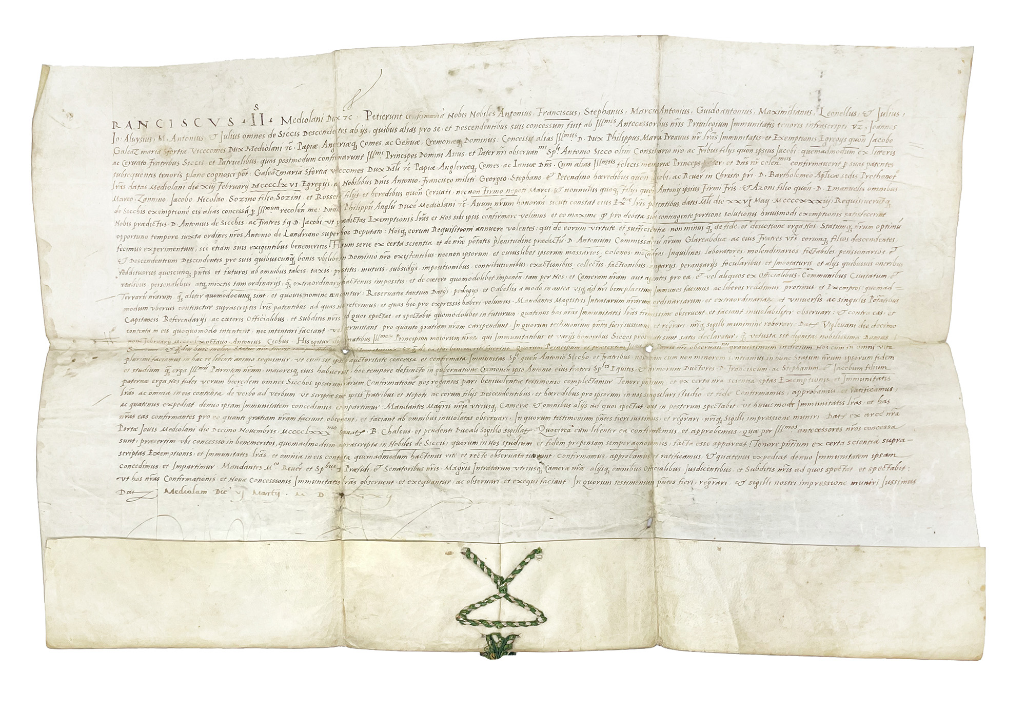 Manoscritto pergamenaceo a inchiostro bruno. Testo in latino. Dimensioni: 370x460 mm. SI AGGIUNGE: Documento pergamenaceo firmato con intestazione Francesco II Sforza Mediolani Dux. Datato 7 marzo 1532, Milano. Grande pergamena a inchiostro bruno e firma al piede del foglio. Lacci conservati in seta verde, bianca e dorata. Testo in latino. Dimensioni: 480x630. (2)I DOCUMENTO: Privilegio conferito da Ferdinando, dal 1468 re di Sicilia, Gerusalemme etc., al nobiles viros Oderiusim de Ugno et fratres de Guardia grelis [...]. II DOCUMENTO: Conferma di privilegio in favore della famiglia De Siccis. Francesco II Sforza fu l'ultimo duca di Milano. Con la sua morte senza eredi, nel 1535, si estingueva la dinastia degli Sforza di Milano. L'imperatore Carlo V, per evitare altre pretese, decise di annettere il Ducato di Milano ai suoi domini, passandolo poi al figlio Filippo che divenne re di Spagna. Il ducato passò così in mano spagnola.