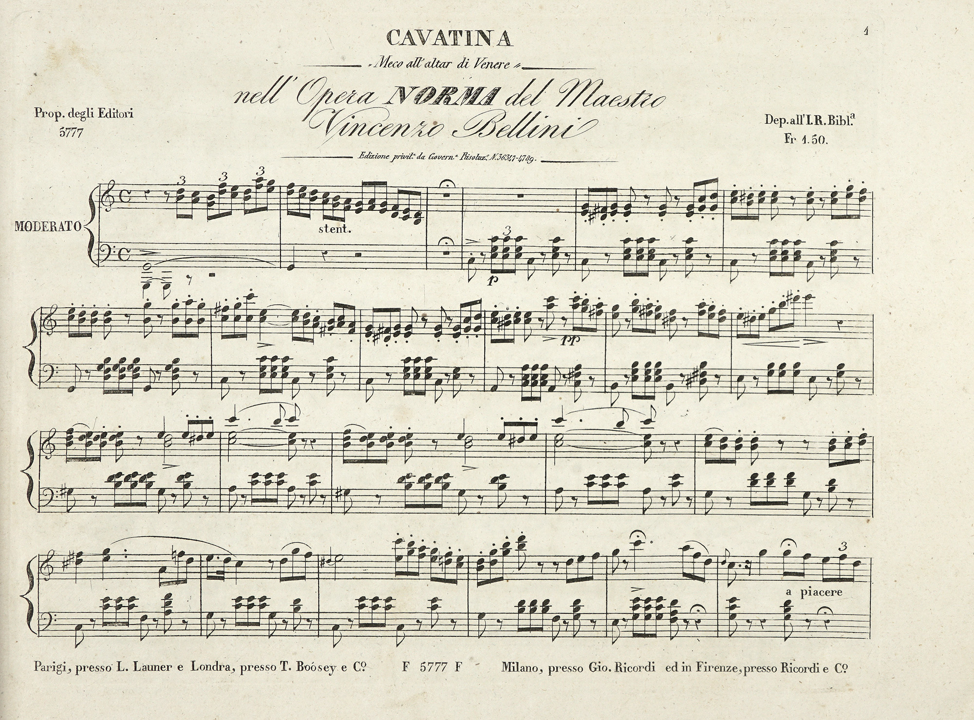 In folio oblungo (245x330 mm ca.). Frontespizio entro cornice stampata in rosso. Fascicoli legati tra loro e protetti da una brossura bianca moderna. Stato di conservazione delle carte molto buono. SI AGGIUNGE: Bellini Vincenzo. Norma. Milano, Giovanni Ricordi 1832. Numeri di lastra 5777-5786. (2)I DOCUMENTO: Prima edizione della versione per pianoforte solo stampata da Ricordi tra settembre e ottobre 1842. Nabucodonosor – opera quaresimale - venne rappresentata la prima volta al Teatro alla Scala di Milano il 9 marzo 1842. L'opera venne dedicata da Verdi all'Arciduchessa Adelaide d'Austria. II DOCUMENTO: Prima edizione della versione per pianoforte solo di Norma stampata da Ricordi tra gennaio e marzo 1832. Non è presente il frontespizio. Carte molto ben conservate. Brossura in carta rosa.