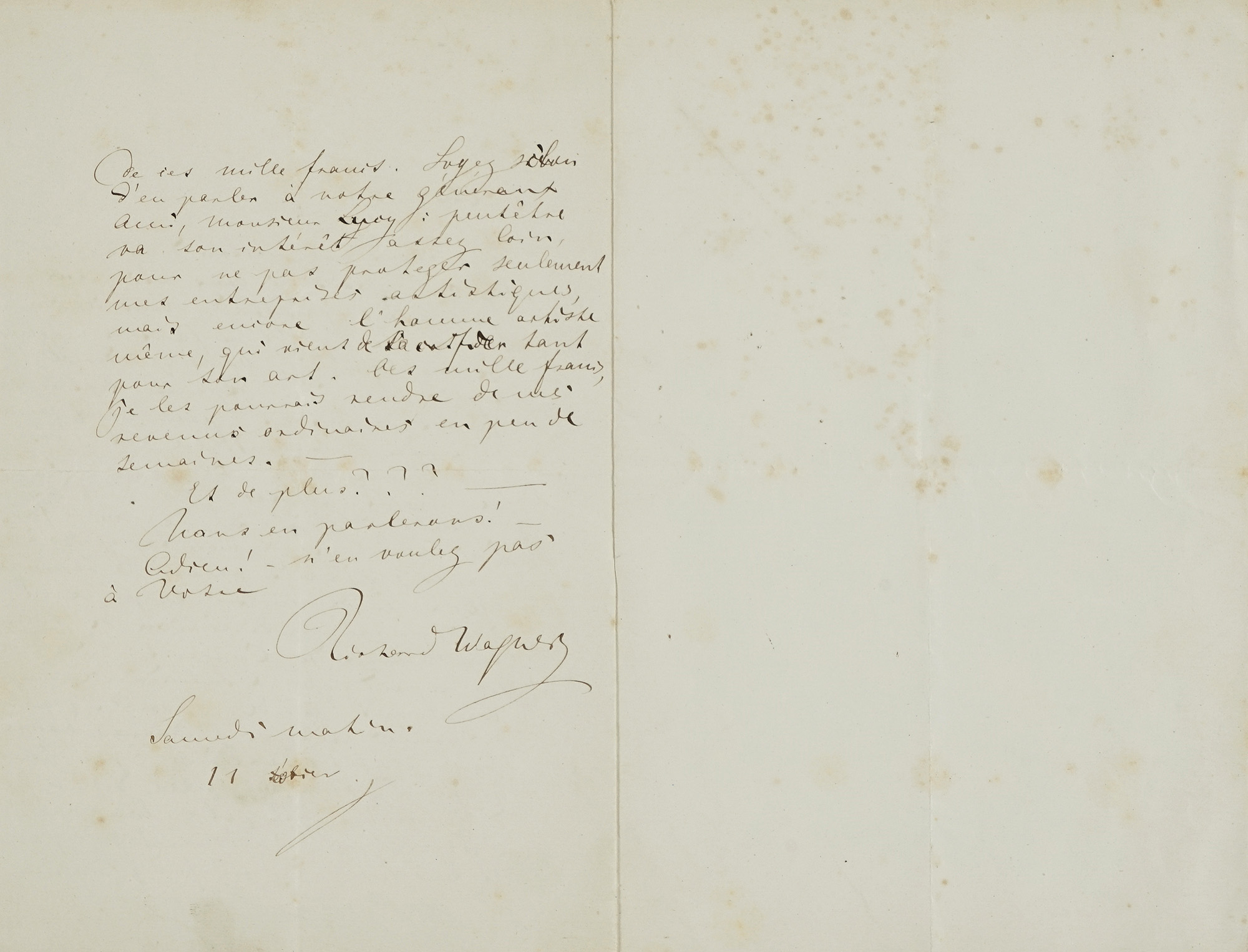 Manoscritto a inchiostro bruno. Un bifolio, 2 pagg. scritte. Al bordo superiore piccola nota a matita di altra mano: A son ami Gasperini. Ottime condizioni. Dimensioni 135x210 mm. (1)Cher ami, ô que vous avez raison de m'appeler léger! Mais si vous étiez un peu plus profond, vous devriez vous dire qu'il ne faut se moquer de ma légèreté, vous, qui devriez savoir, que j'ai dépensé sept mille francs comptant, pour vous faire entendre ma musique, et que je me trouve dans ce moment tellement au sec que... Mon ami, je cherche mille francs : j'ai un billet de mon tapissier à payer [...] j'ai pressé la direction de Vienne de m'envoyer de l'argent ; hier elle, me répond, que l'intendance impériale ne permet pas des avances par des bonnes raisons. Cela me cause un embarras extrême [...] en tout cas l'Allemagne m'aidera. Mais pour le moment il me faut impérieusement de ces mille francs. Soyez si bon d'en parler à votre généraux ami, monsieur Lucy: peut-être va son intérêt assez loin, pour ne pas protéger seulement mes entreprises artistiques mais encore l'homme artiste même qui vient de sacrifier tant pour son art. Ces mille francs, je les pourrais rendre de mes revenues ordinaires en peu de semaines. Et de plus??? ... Nous en parlerons! Adieu ! n'en voulez pas à votre Richard Wagner - samedi matin. 11 février.
