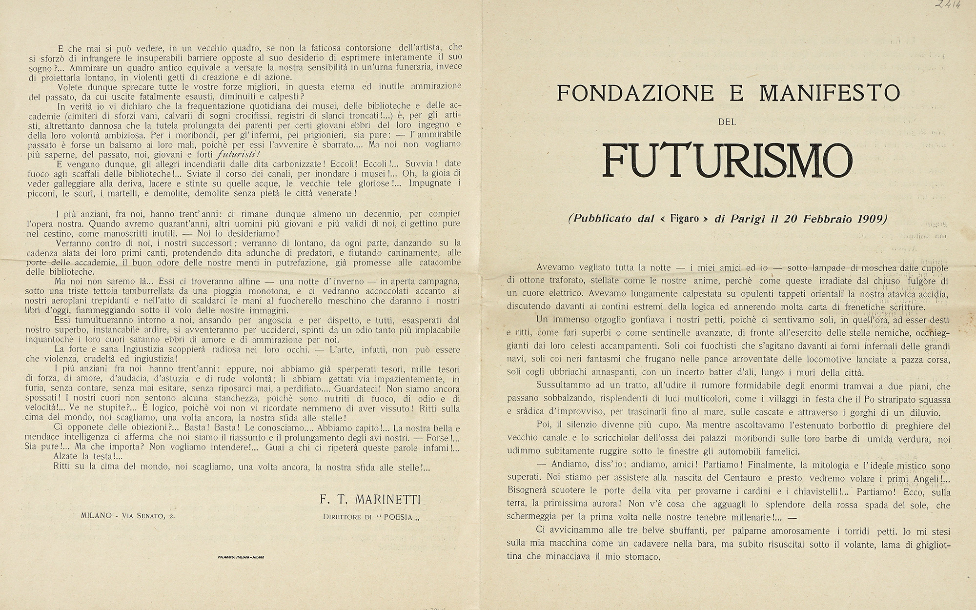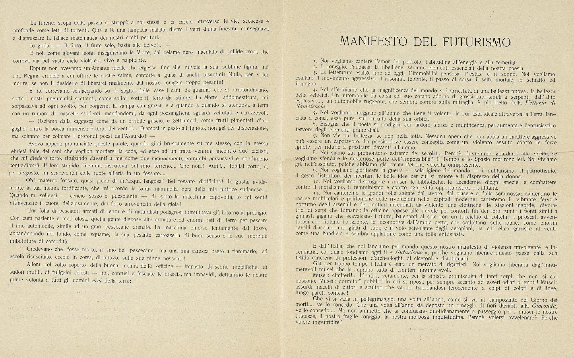 In-4° (mm 290x232). Carte [2]. Segno centrale di precedente piegatura, minimi strappetti marginali e rarissime fioriture al recto della prima carta, ma nel complesso buona copia. (1)Rara prima edizione integrale in volantino, versione italiana, completa di Prologo e Programma in 11 punti. Futurismo (catalogo di vendita n. 100). Firenze: Libreria Salimbeni, 1991, 285; Futurismo (catalogo di vendita n. 43). Gussago (BS): L'Arengario Studio Bibliografico, 2001, 36; Echaurren Pablo, Futurismo. Collaudo 1909-2009 (catalogo di vendita). Milano: Libreria Antiquaria Pontremoli, 2009, 2.