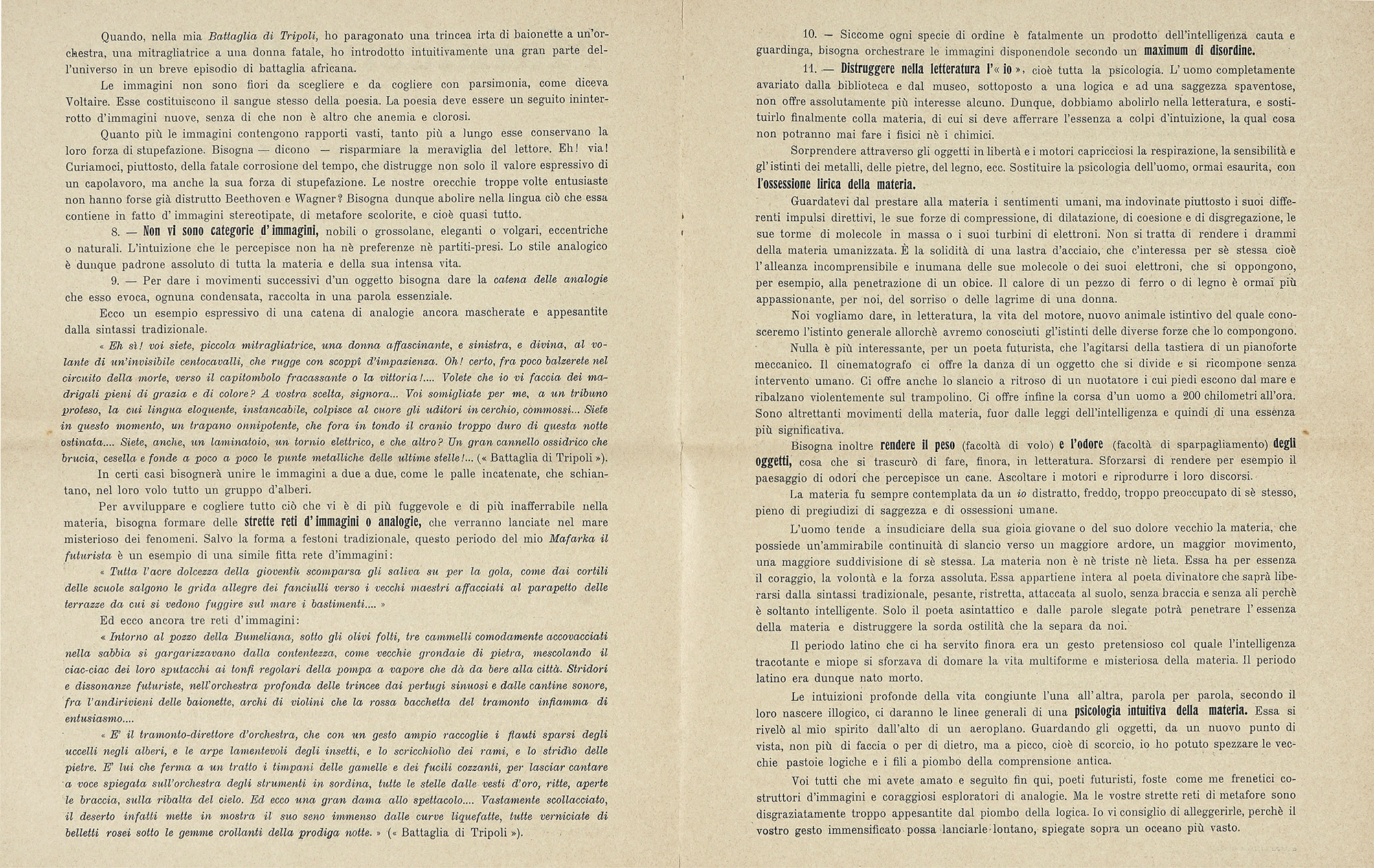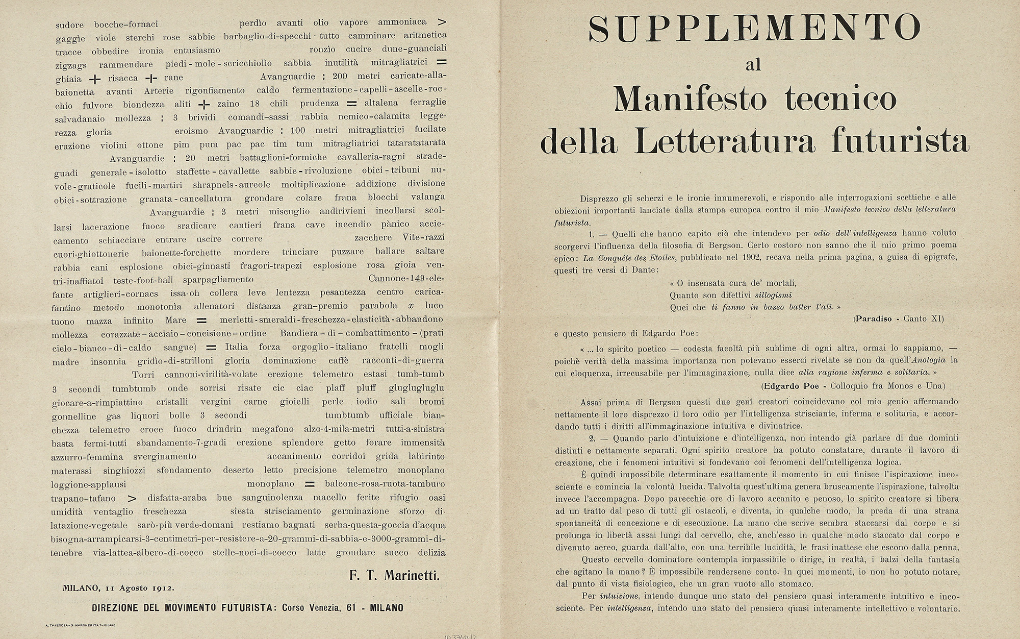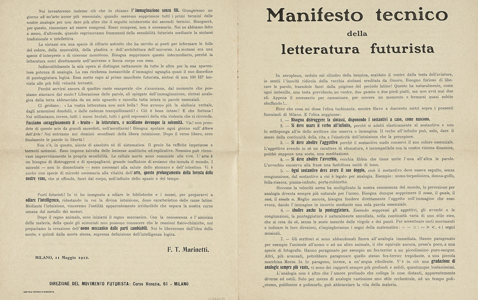 Marinetti Filippo Tommaso, Manifesto tecnico della letteratura futurista. Milano: Direzione del Movimento futurista, 11 maggio 1912.
