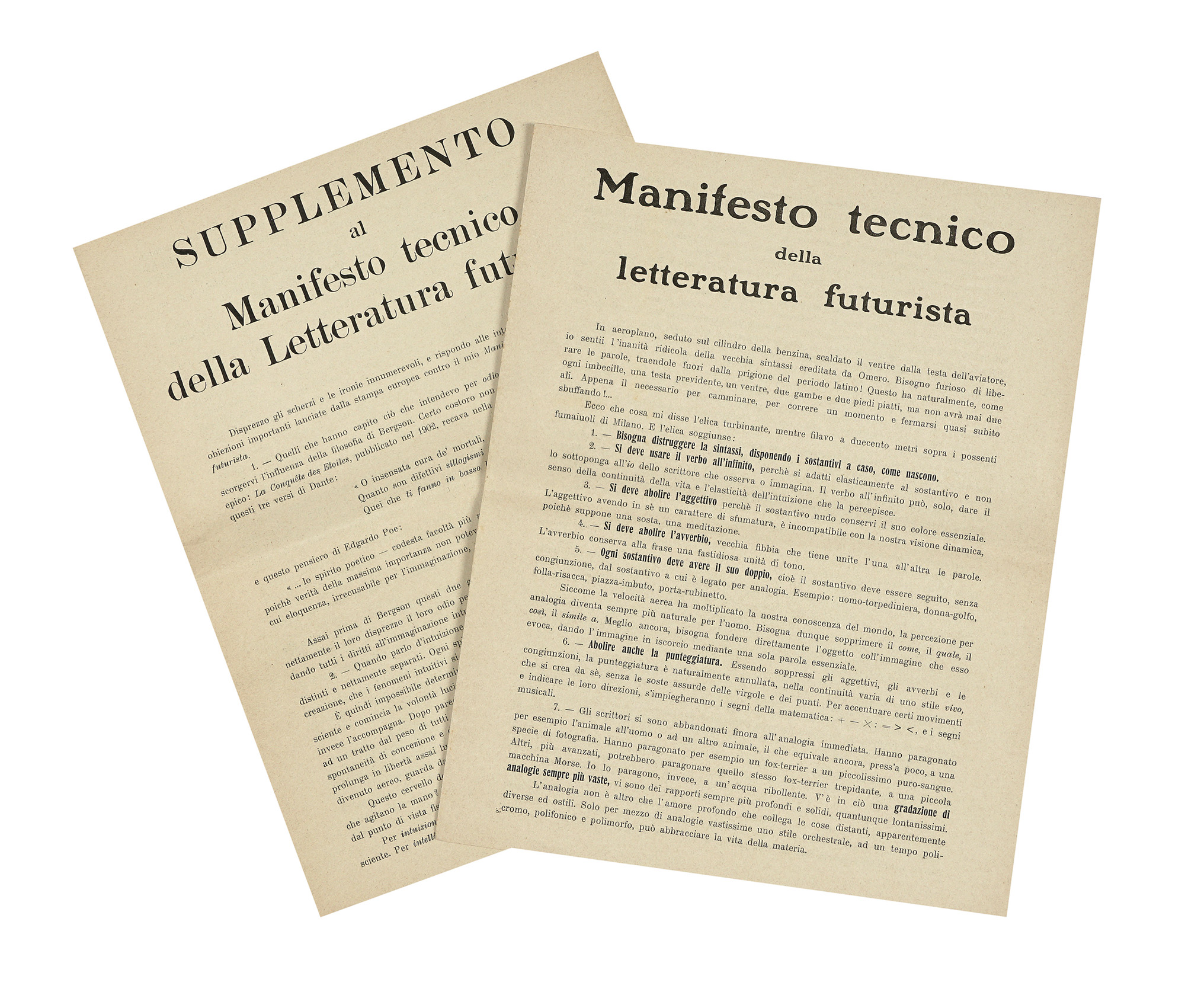 In-4° (mm 290x230). Carte [2]. Segno centrale di precedente piegatura e piccolissimi strappetti marginali, altrimenti ottima conservazione. SI AGGIUNGE: Id., Supplemento al Manifesto tecnico della Letteratura futurista. Milano: Direzione del Movimento futurista, 11 agosto 1912. In-4° (mm 290x230). Carte [2]. Segno centrale di precedente piegatura, altrimenti ottima conservazione. (2)I OPERA: Rara edizione originale, particolarmente importante dal punto di vista letterario, in cui Marinetti precisa gli strumenti con cui il futurismo vuole scardinare lo stile del passato e creare la letteratura dell'avvenire, teorizzando l'uso ardito dell'analogia e abolendo le congiunzioni. Futurismo (catalogo di vendita n. 100). Firenze: Libreria Salimbeni, 1991, 306; Futurismo (catalogo di vendita n. 43). Gussago (BS): L'Arengario Studio Bibliografico, 2001, 42; Echaurren Pablo, Futurismo. Collaudo 1909-2009 (catalogo di vendita). Milano: Libreria Antiquaria Pontremoli, 2009, 50. II OPERA: Raro manifesto di risposta alle critiche suscitate dal precedente, che «oltre agli otto punti di supplemento, [...] ospita la parolibera Battaglia. Peso + odore» (Echaurren Pablo, Futurismo. Collaudo 1909-2009 (catalogo di vendita). Milano: Libreria Antiquaria Pontremoli, 2009, 55); Cammarota, 16; Futurismo (catalogo di vendita n. 100). Firenze: Libreria Salimbeni, 1991, 307; Futurismo (catalogo di vendita n. 43). Gussago (BS): L'Arengario Studio Bibliografico, 2001, 44.