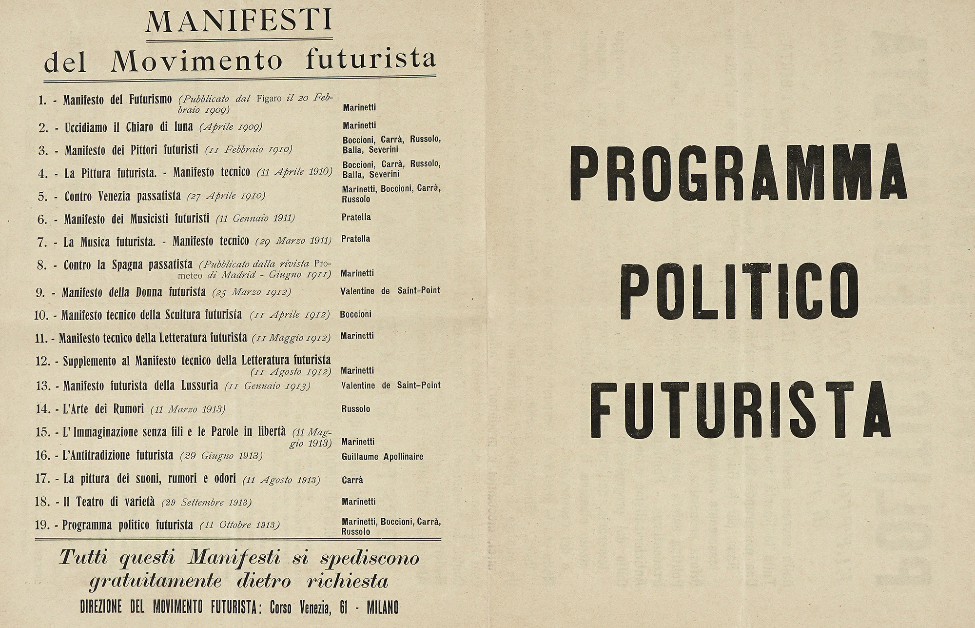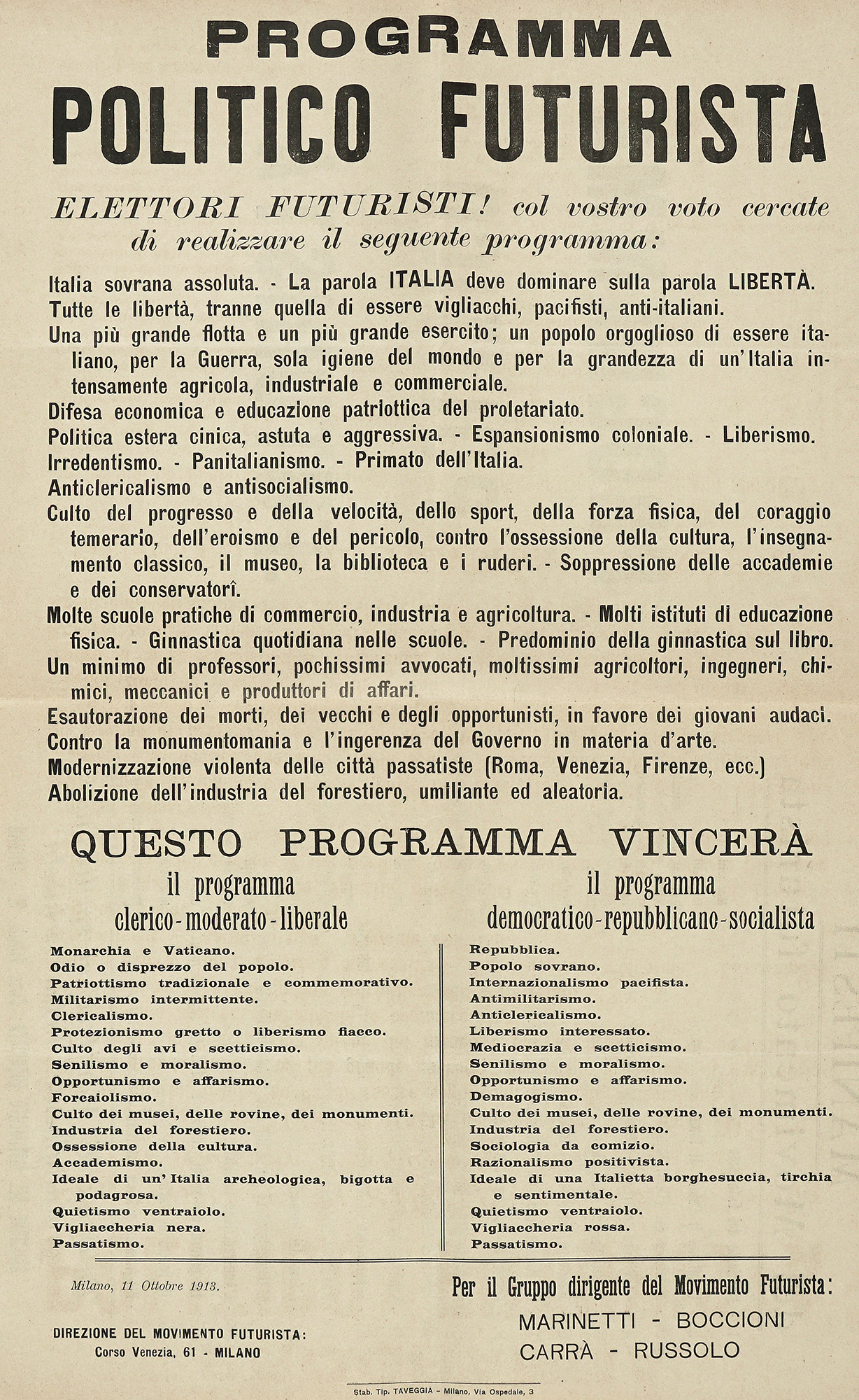 Marinetti Filippo Tommaso e altri, Programma politico futurista. Milano: Direzione del Movimento Futurista, 11 ottobre 1913.
