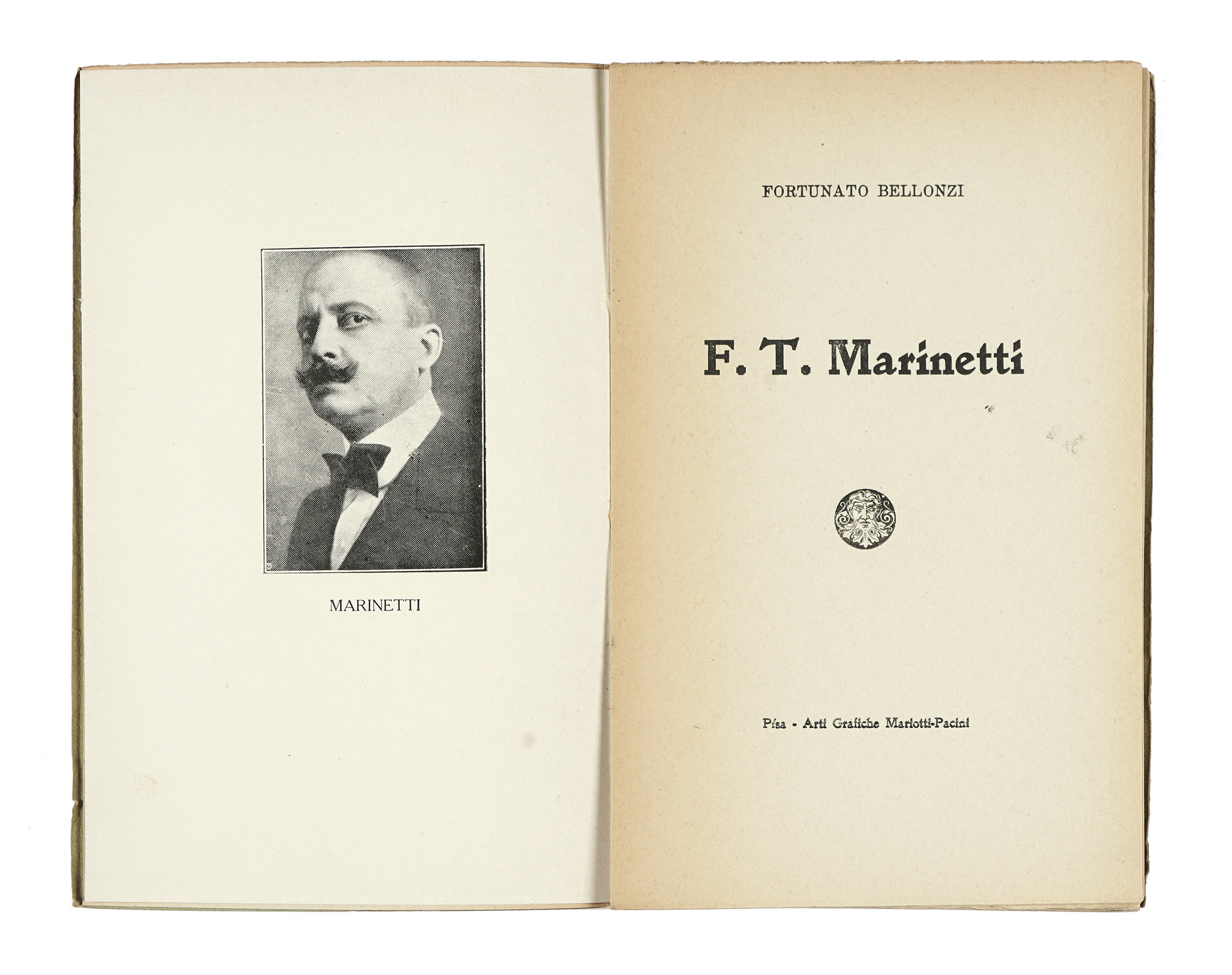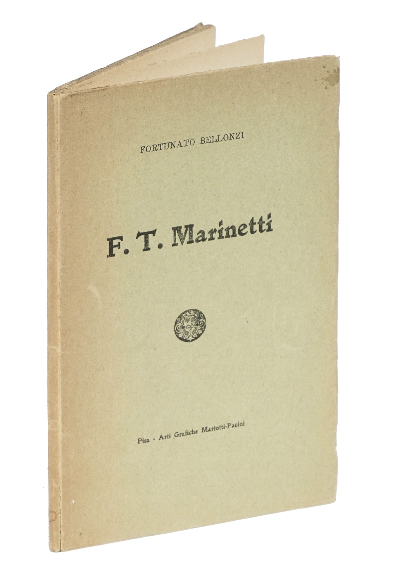 In-8° (mm 193x120). Pagine [2], 36. Con 1 ritratto di Marinetti in antiporta fuori testo. Ottimo esemplare in barbe. Brossura originale con titoli in nero al piatto anteriore. Lievi bruniture marginali da esposizione, ma nel complesso buone condizioni. (1)Rarissima opera prima ed esordio futurista dell'Autore. Con una breve nota dell'editore Emilio Pacini che circostanzia la pubblicazione: «Caro Bellonzi, Quest'articolo che hai scritto in tre puntate per 'L'Idea Fascista' ho voluto raccoglierlo qui, in estratto, perché possa varcare meglio i limiti entro i quali è letto il giornale [...]. Mi hanno spinto a pubblicarlo anche la schietta amicizia che mi lega a te [...]. Pisa, Agosto 1929 - VII.».