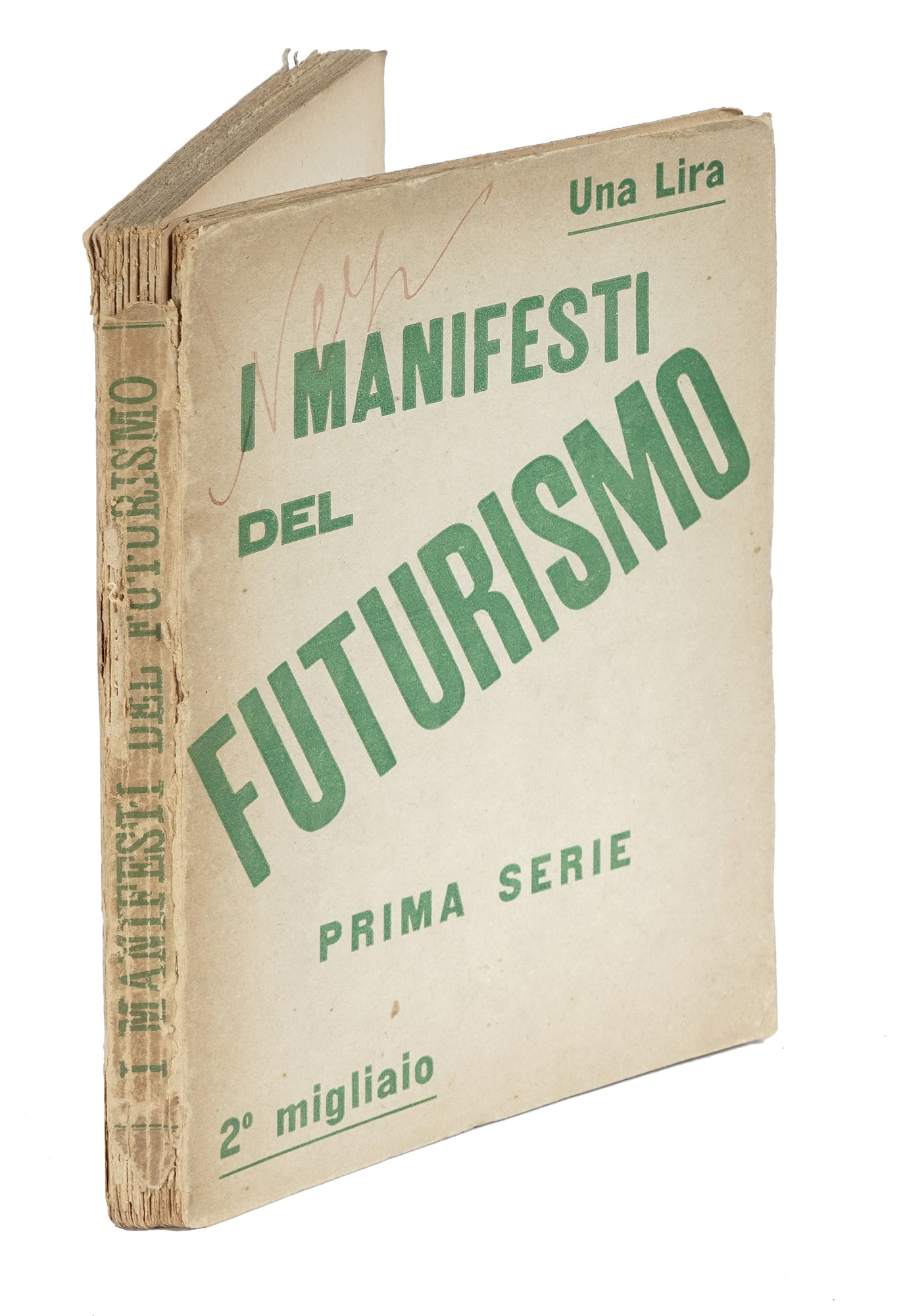 In-8° (mm 197x140). Pagine 182. Esemplare in barbe, con le prime 48 pagine staccate, ma presenti e ben conservate; rari strappetti marginali senza perdite, per il resto buono stato. Brossura editoriale originale con i titoli impressi in verde a piatti e dorso. Mancanze alle cuffie e strappetti al dorso. Nota di appartenenza al piatto anteriore. (1)Edizione originale, con la menzione 2° migliaio al piatto anteriore, di questa raccolta di scritti e proclami del movimento futurista, la prima ad essere presentata in forma organica.