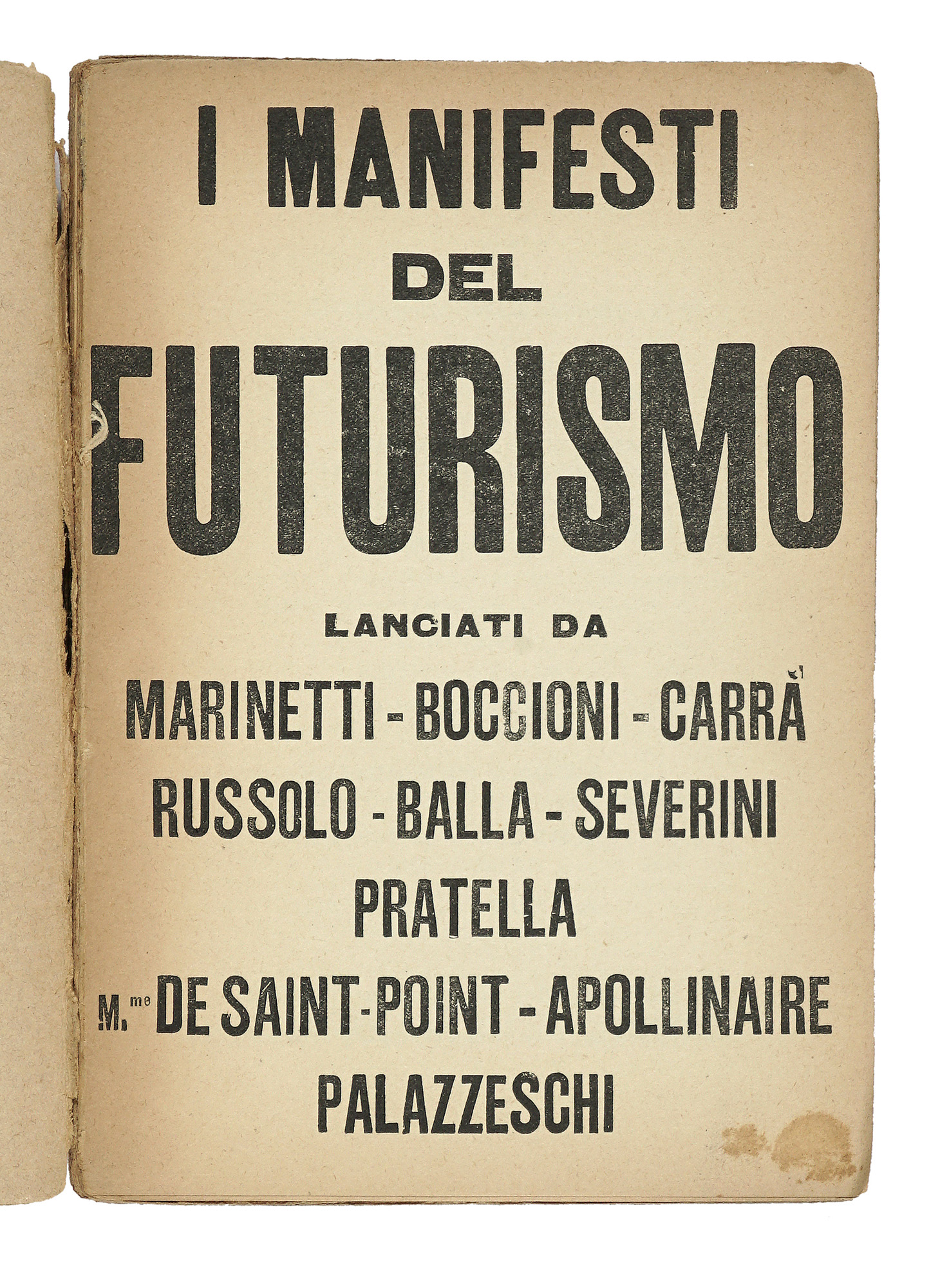 Marinetti Filippo Tommaso, I manifesti del futurismo. Lanciati da Marinetti-Boccioni-Carrà-Russolo-Balla-Severini-Pratella [...] Prima serie. 2° migliaio. [Firenze: Lacerba, 1914].