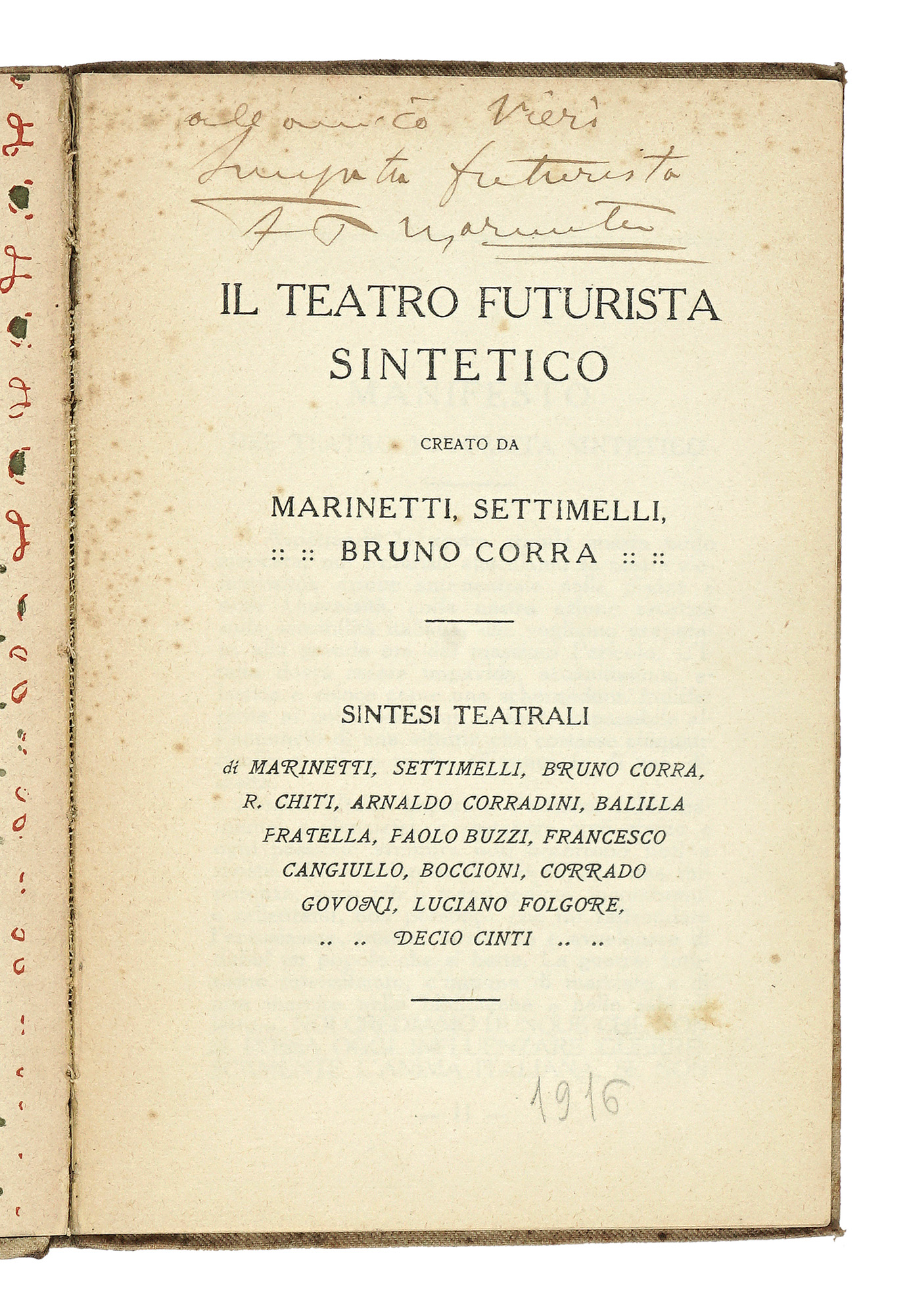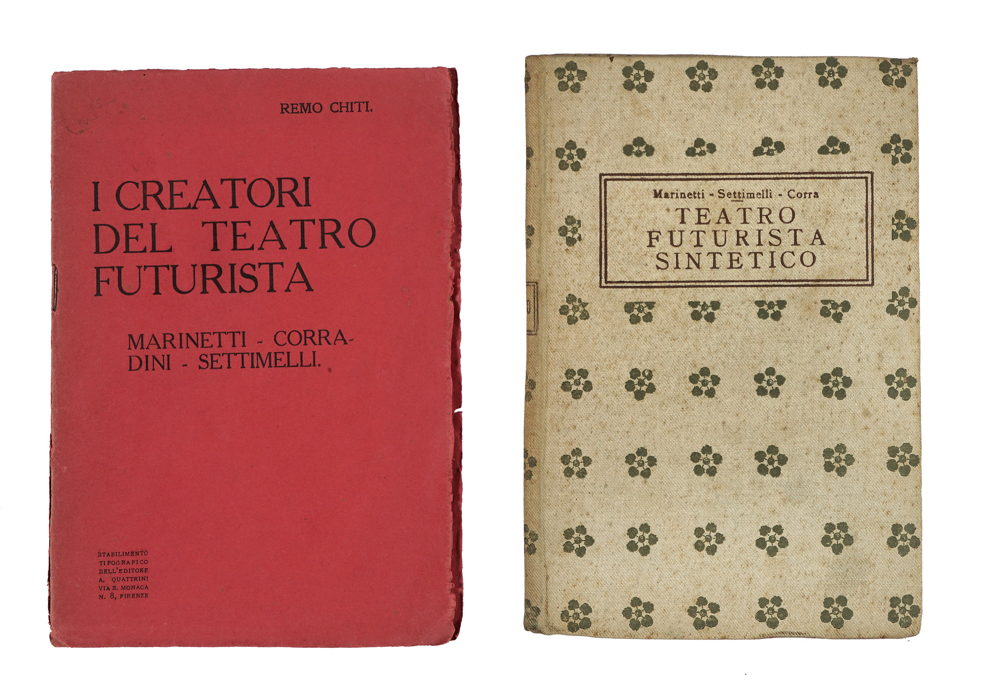 In-16° (mm 178x157). Pagine 99, [1]. Ottima copia. Legatura editoriale in piena tela avorio, con piccoli fiori impressi in verde e riquadro con titolo e numero della collana impresso al piatto e al dorso; sguardie decorate. Lievi fioriture e tracce di polvere. SI AGGIUNGE: Chiti Remo, I creatori del teatro futurista. Marinetti-Corra-Dini-Settimelli. Firenze: A. Quattrini, s.d. [i.e. 1915]. In-8° piccolo (mm 180x130). Con 3 tavole fotografiche in bianco e nero fuori testo, con i ritratti di Marinetti, Corradini e Settimelli. Brossura originale con titoli in nero al piatto anteriore. Difetti al dorso. (2)I OPERA: Primo volume della collezione, con le sintesi teatrali di Marinetti, Settimelli, Bruno Corra, Remo Chiti, Arnaldo Corradini, Balilla Pratella, Paolo Buzzi, Francesco Cangiullo, Boccioni, Corrado Govoni, Luciano Folgore, Decio Cinti, precedute dal Manifesto del teatro futurista sintetico. La collezione fu preceduta dall'edizione degli stessi contenuti in due rarissime plaquette (pubblicate come allegato alla rivista Gli Avvenimenti, diretta da Umberto Notari) che uscirono tra il dicembre 1915 e l'aprile del 1916, data che fa da terminus post quem per l'edizione dei due volumetti della Biblioteca teatrale. Esemplare nella rara tiratura rilegata in tela, con titolo 'Teatro futurista sintentico' in riquadro al piatto anteriore (esistono esemplari privi dell'aggettivo sintetico). II OPERA: Prima edizione, con la brossura originale nella variante rossa.