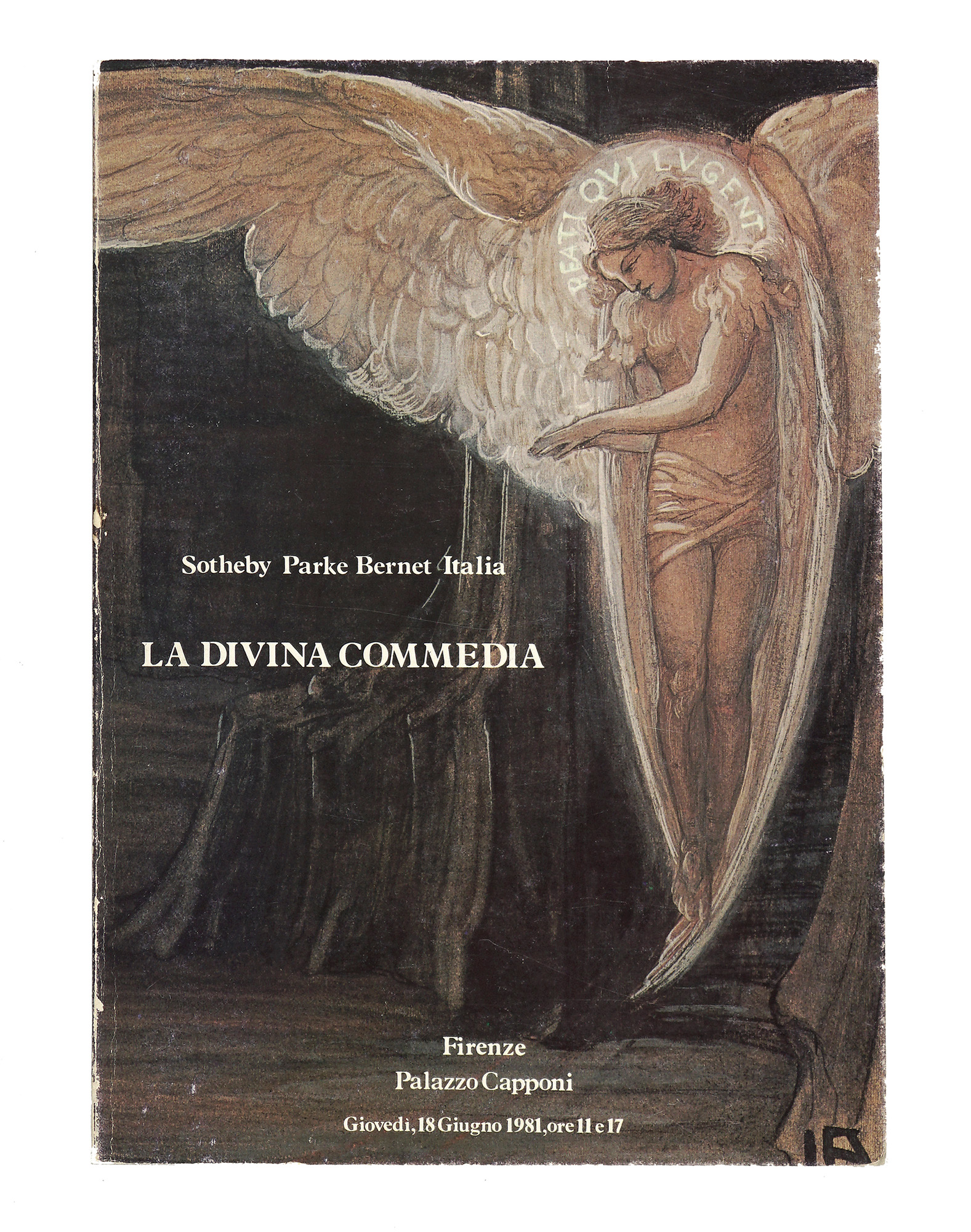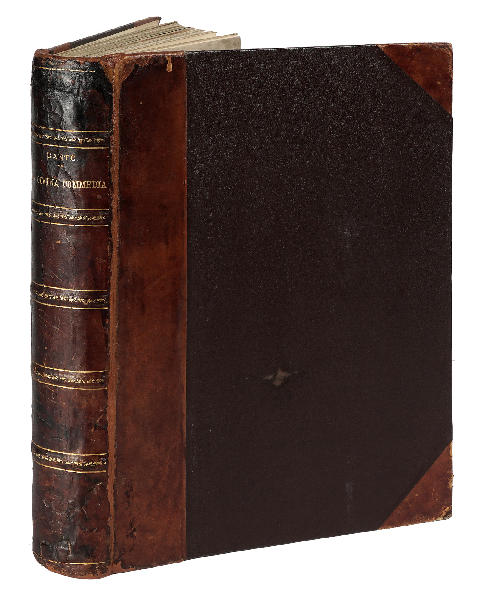 3 parti in 1 volume in folio (mm 365250). Pagine XVI, [2], 140 + 27 tavole fuori testo; [4],146, 2 bianche; +16 tavole fuori testo; [4], 166, 2 bianche + 10 tavole fuori testo. Con numerosissime illustrazioni in fotoincisione, anche a piena pagina, nel testo e 53 tavole fuori dalla numerazione (anch'esse in parte fotoincise). Assenti le carte bianche a fine delle prime due parti, un restauro con pecetta cartacea ai tre occhietti, per il resto minimi difetti ma buona copia. Legatura in mezza pelle con punte e piatti in percallina, titoli in oro al dorso. Mancanze reintegrate lungo cuffie e cerniere. SI AGGIUNGE: Catalogo di disegni e dipinti per La Divina Commedia - vendita Sotheby Parke Bernet Italia s.r.l. Firenze, 1981. (2)Bella edizione illustrata con i contribuiti dei migliori artisti italiani del primo Novecento, tra cui A. Martini, D. Cambellotti, L. Balestrieri, G. Costetti, P. Nomellini, A. Spadini, G. M. Mataloni, A. De Carolis, A. Sartorio, G. Fattori. In testa al volume una prefazione di G. Vandelli. Mambelli, 501.