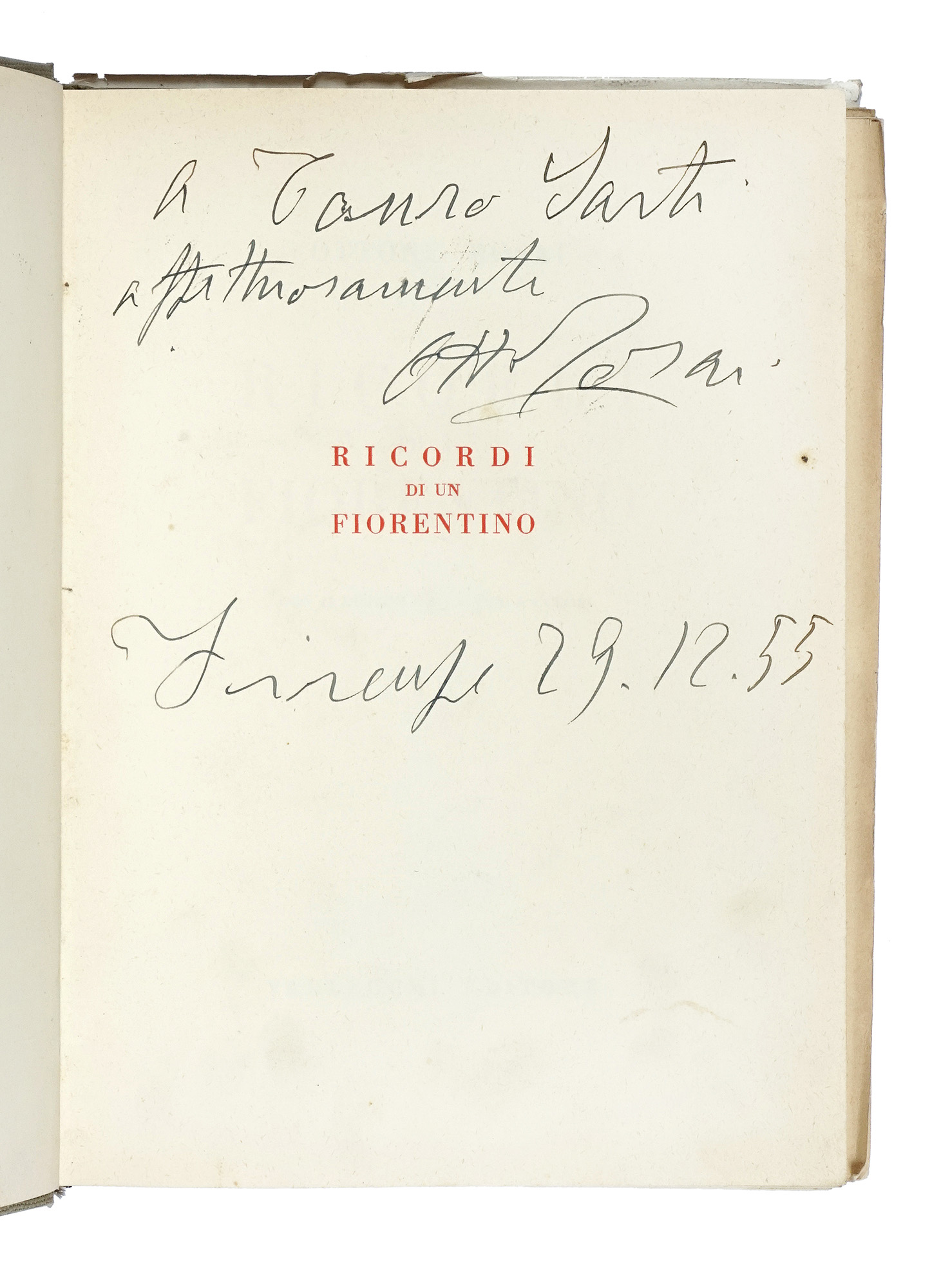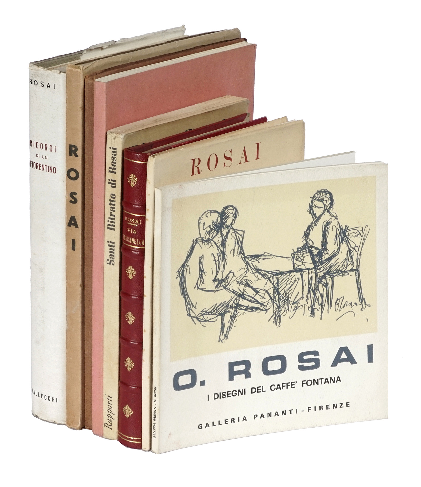 Compongono il lotto: 1) Rosai Ottone, Ricordi di un fiorentino. Firenze: Vallecchi, 1955; 2) Masciotta Michelangelo, Ottone Rosai. Firenze: Parenti, 1940; 3) Tinti Mario, L'architettura delle case coloniche in Toscana. Con 32 disegni di Ottone Rosai. Firenze: Rinascimento del libro, 1935; 4) Rosai Ottone, Via toscanella. Firenze: Vallecchi, 1930. Elenco completo disponibile su richiesta. (8)I OPERA: Con la dedica autografa manoscritta dell'Autore all'occhietto, datata Firenze 29.12.55. II OPERA: Edizione originale; esemplare 69 su una tiratura di 355 copie numerate. IV OPERA: Prima edizione, illustrata da Mino Maccari, in cui «[...] il titolo e la copertina richiamano la via dove si trovava il primo studio del pittore» (Gambetti-Vezzosi, 782).