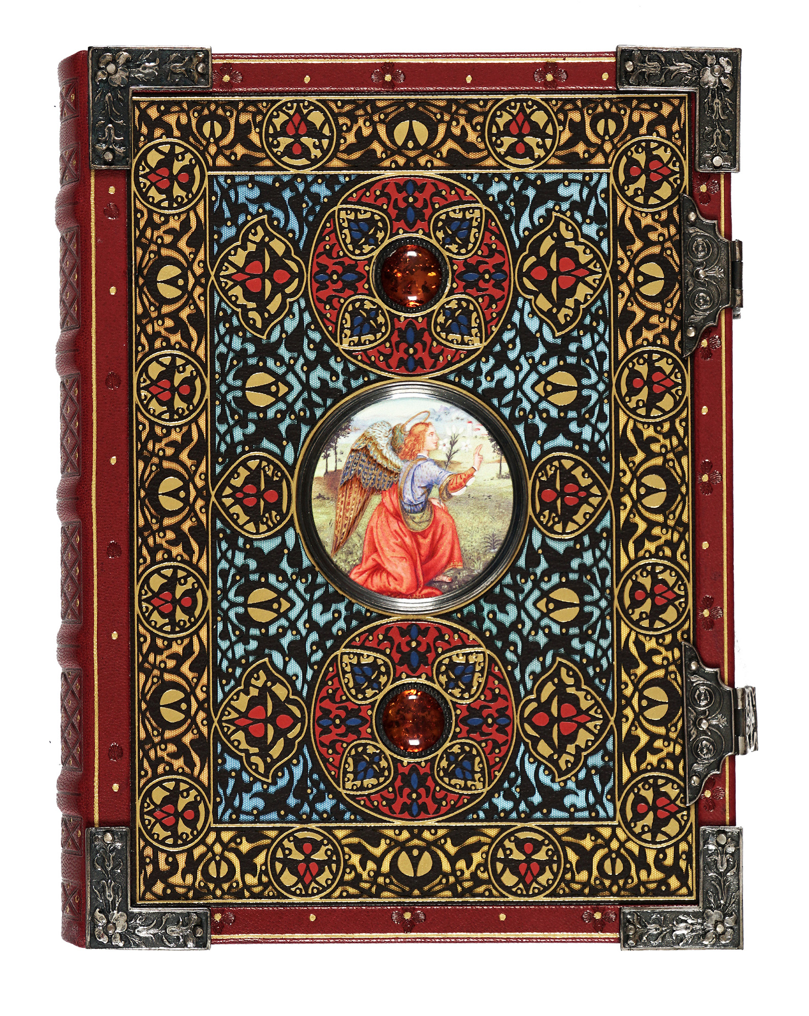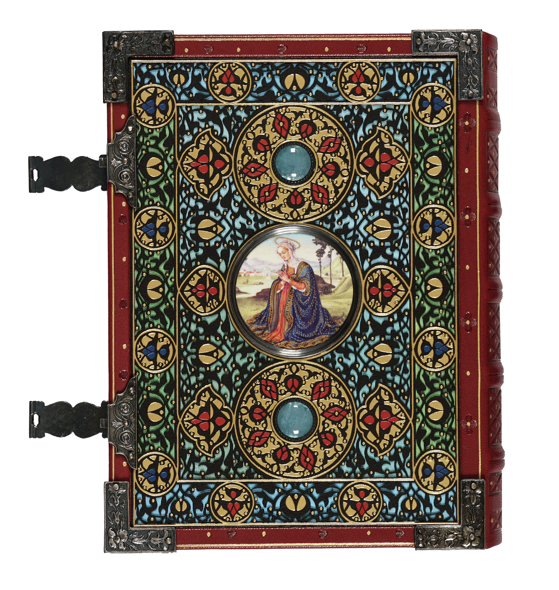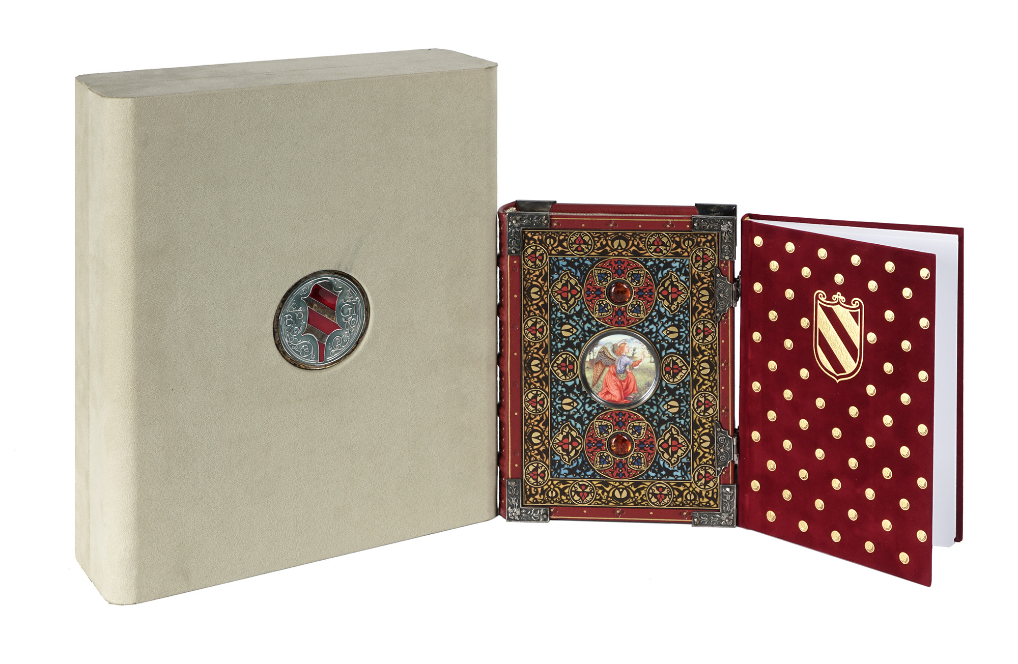 In-8° (mm 202x150). Ottimo stato di conservazione. Legatura editoriale in marocchino con due castoni di pietre dure e due medaglioni centrali ai piatti raffiguranti l'Annunciazione (piatto anteriore) e la Vergine (piatto posteriore); fermagli, tagli dorati e sguardie decorate. Entro cofanetto editoriale in velluto, con medaglione smaltato al piatto. Uno dei 980 esemplari in numeri arabi. Presente il volume di Commentario, in legatura editoriale in pieno velluto rosso, con decorazioni in oro al piatto. (2)Splendida riproduzione dettagliata a colori del libro d'ore realizzato, agli inizi del XVI secolo, per il nobile bolognese Bonaparte Ghisleri. Nel commissionare questo codice, il Ghislieri volle riunire alcuni dei migliori artisti italiani del periodo, nell'intento di offrire una piccola antologia del meglio che la scuola bolognese di miniatura poteva offrire in quegli anni. Vediamo così succedersi, tra gli altri, la mano del Perugino nel San Sebastiano (la sola miniatura esistente del grande pittore), di Amico Aspertini nell'Adorazione dei pastori, di Lorenzo Costa e di Matteo da Milano.