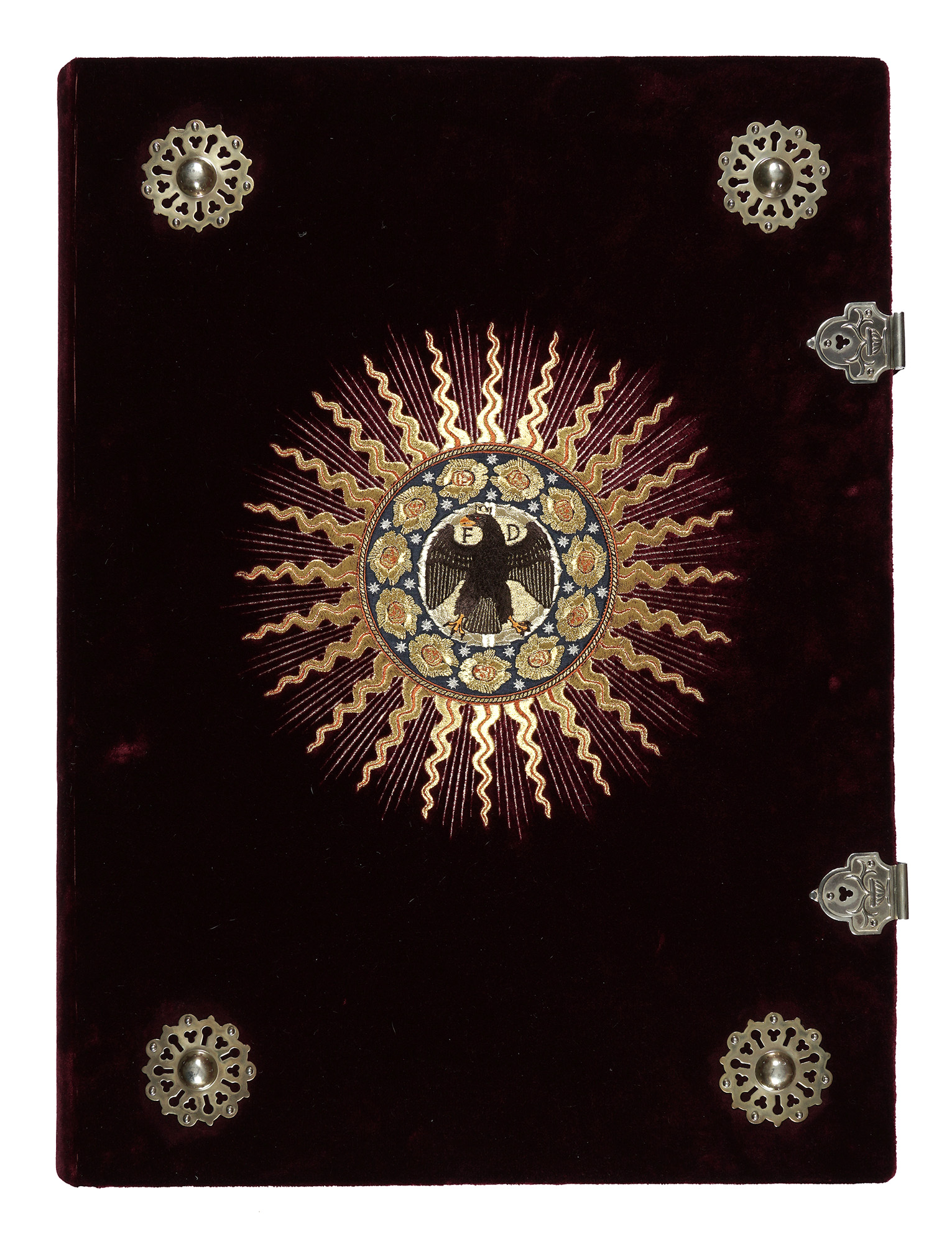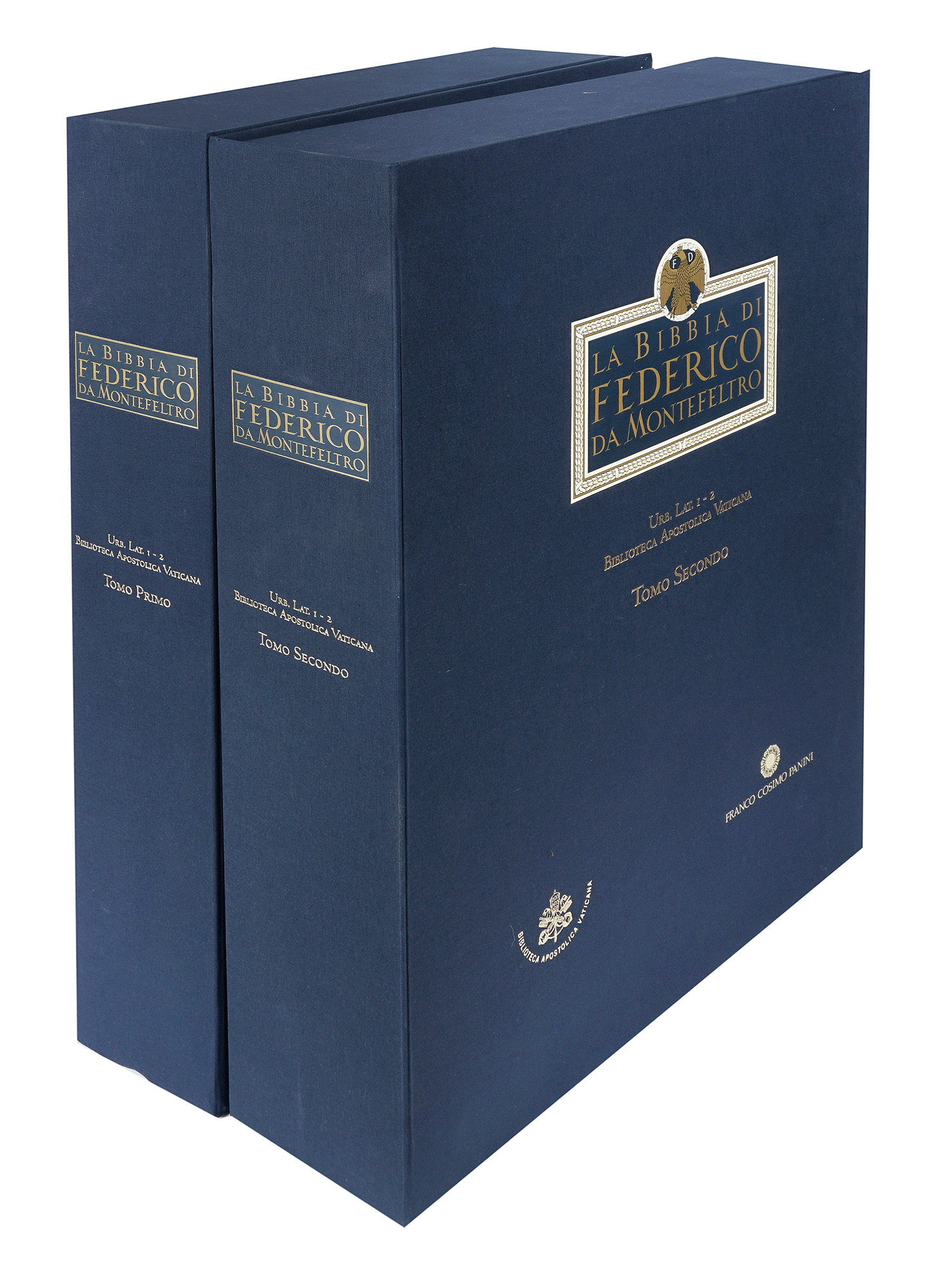 2 volumi in-folio atlantico (mm 600x450). Ottimo esemplare, in sontuosa legatura in velluto bordeaux ricamato, con borchie metalliche ai piatti e fermagli; entrambe protette da panni decorati entro cofanetti editoriali in tela blu, con titoli entro tassello al piatto. Minime tracce d'uso. Presenti i due volumi di Commentario, con legatura in piena tela e sovraccoperta editoriale illustrata, conservati entro cofanetto editoriale in cartonato, illustrato ai piatti. Tracce d'uso. (4)Riproduzione dettagliata a colori del sontuoso codice realizzato tra il 1476 e il 1478 per Federico da Montefeltro duca di Urbino e ora conservato presso la Biblioteca Apostolica Vaticana. L'opera venne realizzata nello scriptorio di Ugo Comminelli da Mézières e miniata da Francesco di Antonio de Chierico a Firenze, pittore della famiglia Medici. Vi collaborarono, inoltre, nomi illustri nella storia della miniatura come Attavante degli Attavanti, Francesco Rosselli, e probabilmente anche Davide Ghirlandaio; vi si contano 35 miniature di grande formato tra le più pregevoli del Rinascimento.