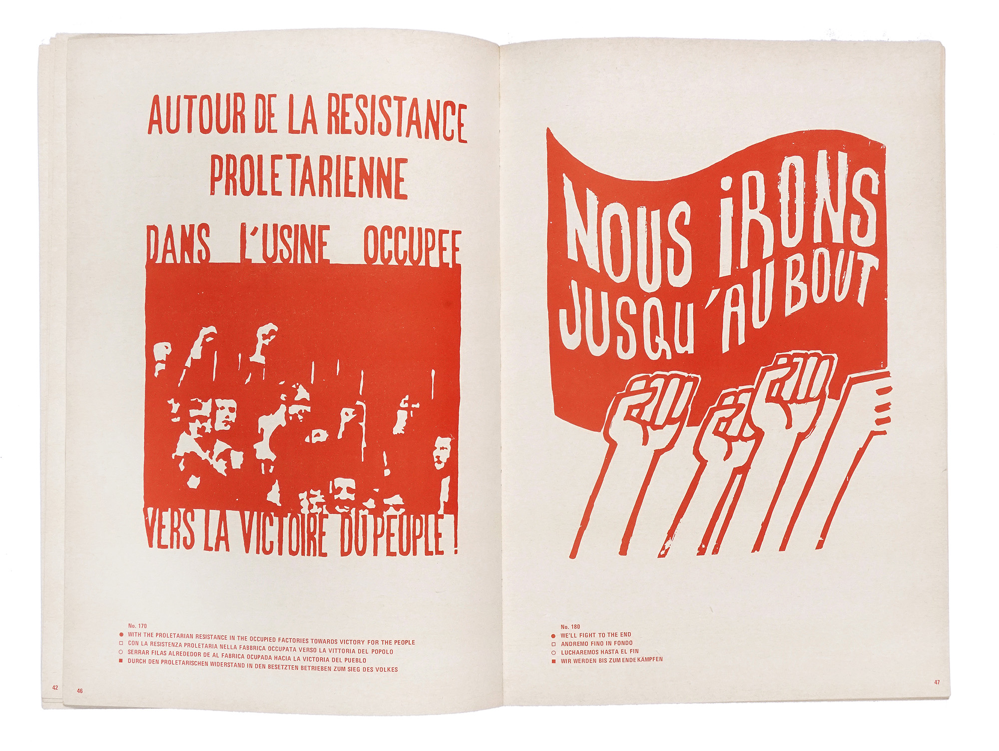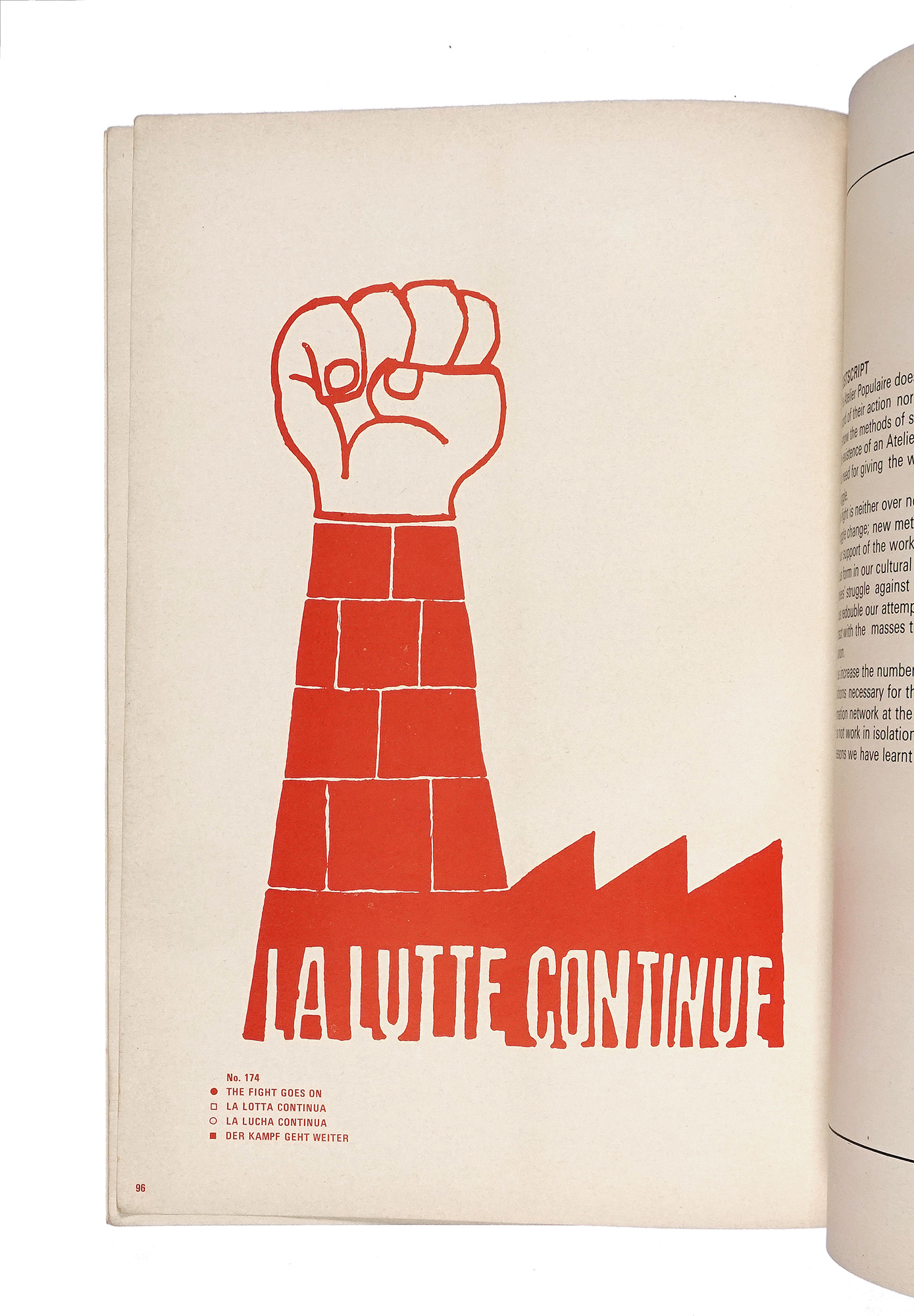 In-folio (mm 406x280). Con numerose riproduzioni a colori delle affiches realizzate nel 1968 dall'Atelier Populaire. Ottimo stato di conservazione. Brossura editoriale con titoli in rosso e nero al piatto anteriore. Segni di usura e qualche mancanza al dorso e una piega centrale al piatto posteriore. (1)Ampia e rara opera di documentazione, in inglese, sui manifesti realizzati dall'Atelier Populaire nel 1968. In testa, una lunga parte introduttiva; segue una classificazione dei manifesti per tema e, in fine, i 96 manifesti, a piena pagina e a colori, ciascuno con didascalia in 4 lingue (inglese, spagnolo, italiano e tedesco).