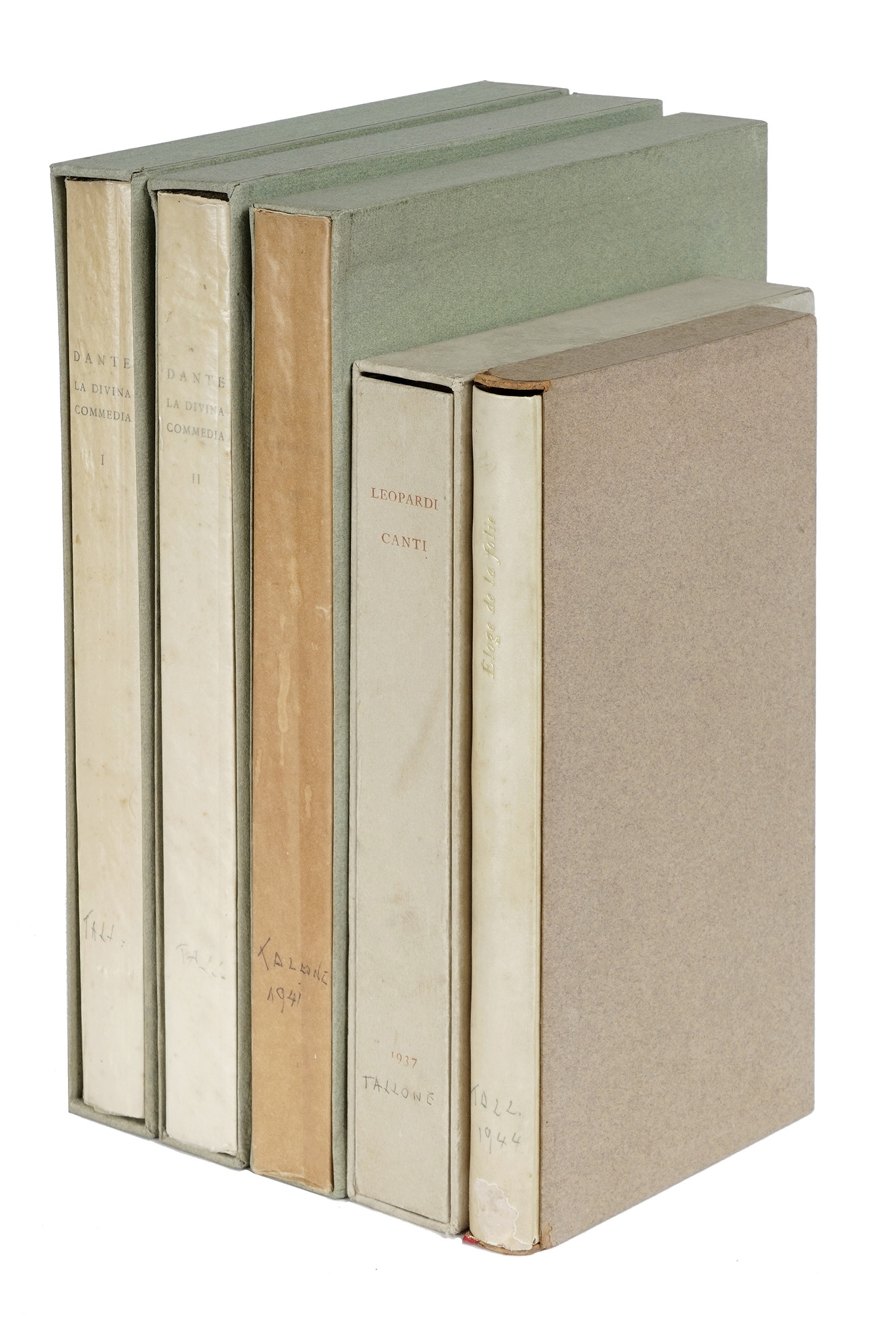 3 volumi in-4° (mm 305x205). Brossura editoriale originale con titoli impressi in nero a piatto anteriore e dorso, ciascun volume contenuto entro cartella editoriale in cartonato. Es. n. 180 su una tiratura complessiva di 520 copie. SI AGGIUNGONO: Erasmus Roterodamus, Eloge de la folie. Paris: editions A. Tallone, 1944. Leopardi Giacomo, Canti. Tallone: 1937. Tutti i volumi del lotto presentano fioriture, anche intense, alle carte. (5)-