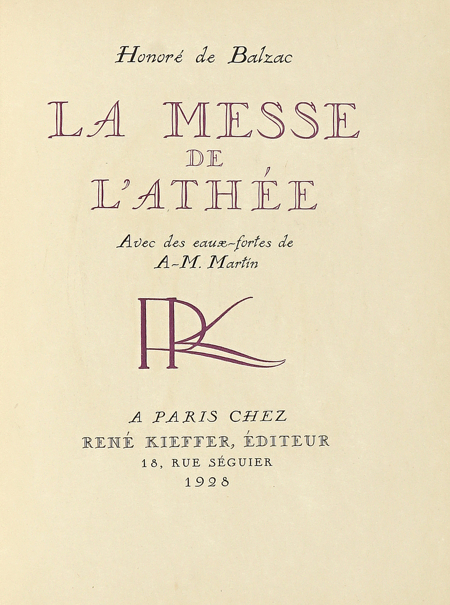 In-4° (mm 248x160). Carte [6], 51, 1 bianca; carte [4], 51 di suite in nero con 1 acquerello originale rilegato in principio. Frontespizio inciso, carte con illustrazioni a colori nel testo. Copia perfetta. Es. n. 5 su una tiratura di 500 esemplari, uno dei 50 corredato di acquerello originale e suite delle illustrazioni in nero. Bella legatura Kieffer in pieno marocchino nero con ampie impressioni in oro ai piatti, titolo dorato ai dorsi, sguardie in carta decorata. Minime spellature lungo le cerniere. Conservata all'interno la brossura editoriale, impressa a colori. SI AGGIUNGE: Id., La messe de l'athée. Avec des eaux-fortes de A-M. Martin. A Paris: chez René Kieffer, 1928. In-4° (mm 232x175). Es. n. 30, uno dei 50 tirati su papier imperial du Japon con le acqueforti in 3 stati. Legatura coeva in mezzo marocchino con punte e piatti in carta decorata, titolo impresso in oro al dorso, sguardie in carta. Conservata all'interno la brossura originale. (2)-