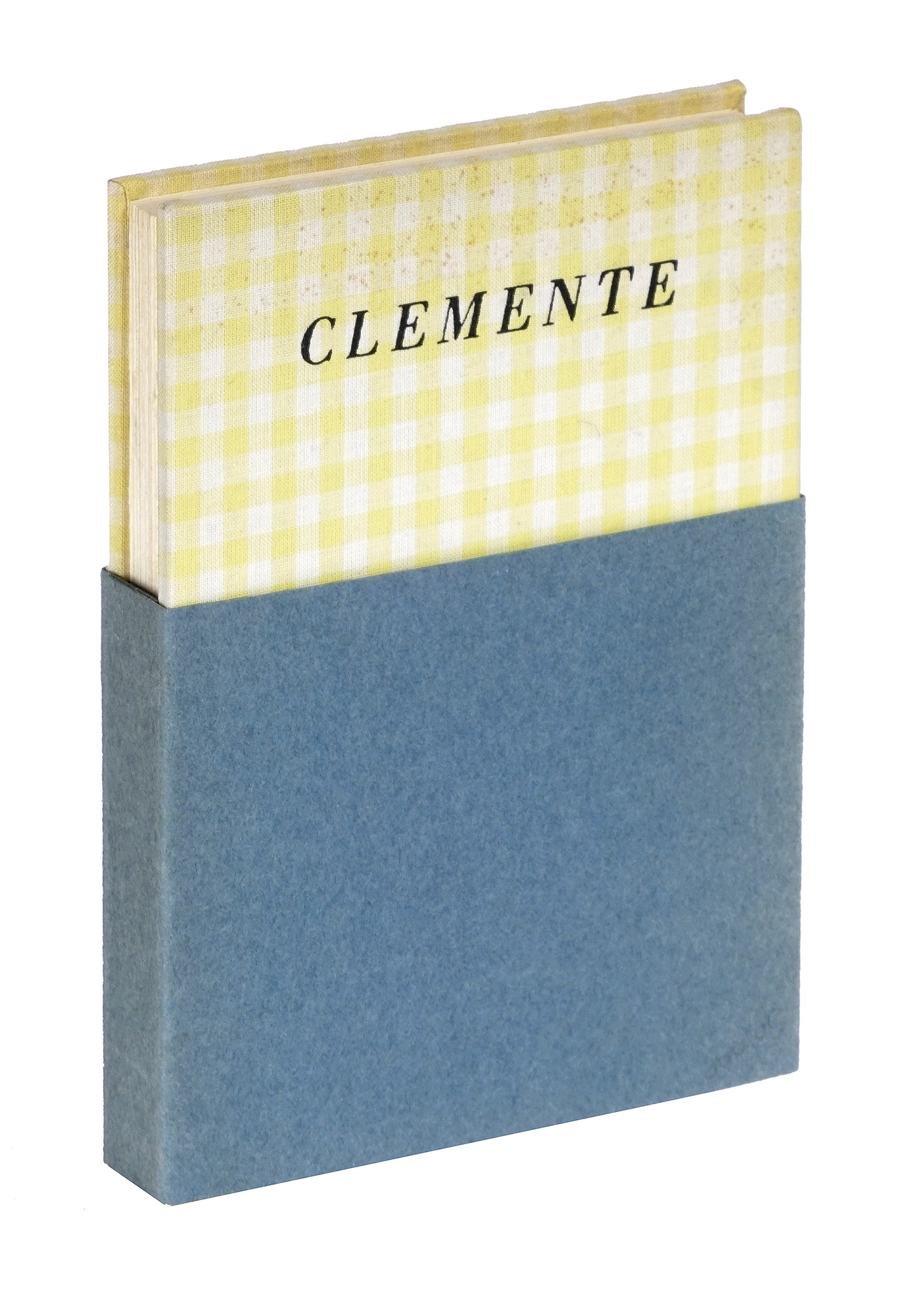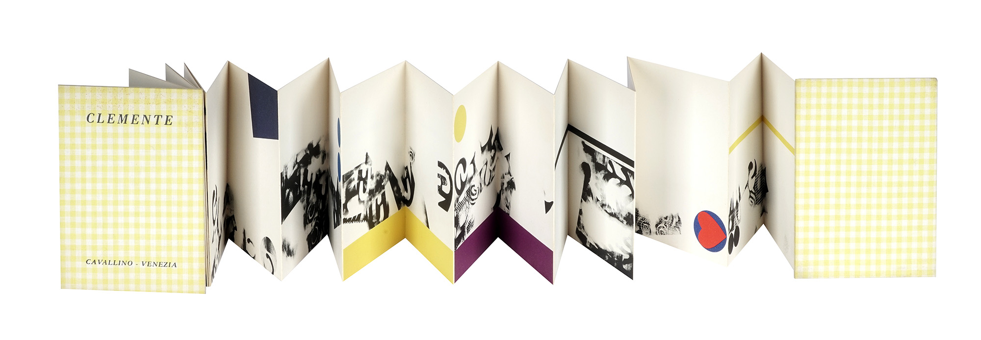 In-8° (chiuso: mm 147x100; aperto: mm 147x2400 ca.). 1 carta di frontespizio, 1 di colophon e 20 carte interamente litografate, applicate su cartoncino. Legatura editoriale con piatti in cartonato rigido rivestiti in tela, con sguardie decorate e fascetta editoriale in cartoncino. Edizione in 200 esemplari, numerati e firmati a matita da Jack Clemente. (1)Jack Clemente, dopo un proficuo soggiorno parigino, sbarca a Milano chiamato da Guido Le Noci e frequenta il fermento artistico meneghino degli anni '50, entrando in contatto con artisti del calibro di Jorn, Baj e Fontana.