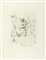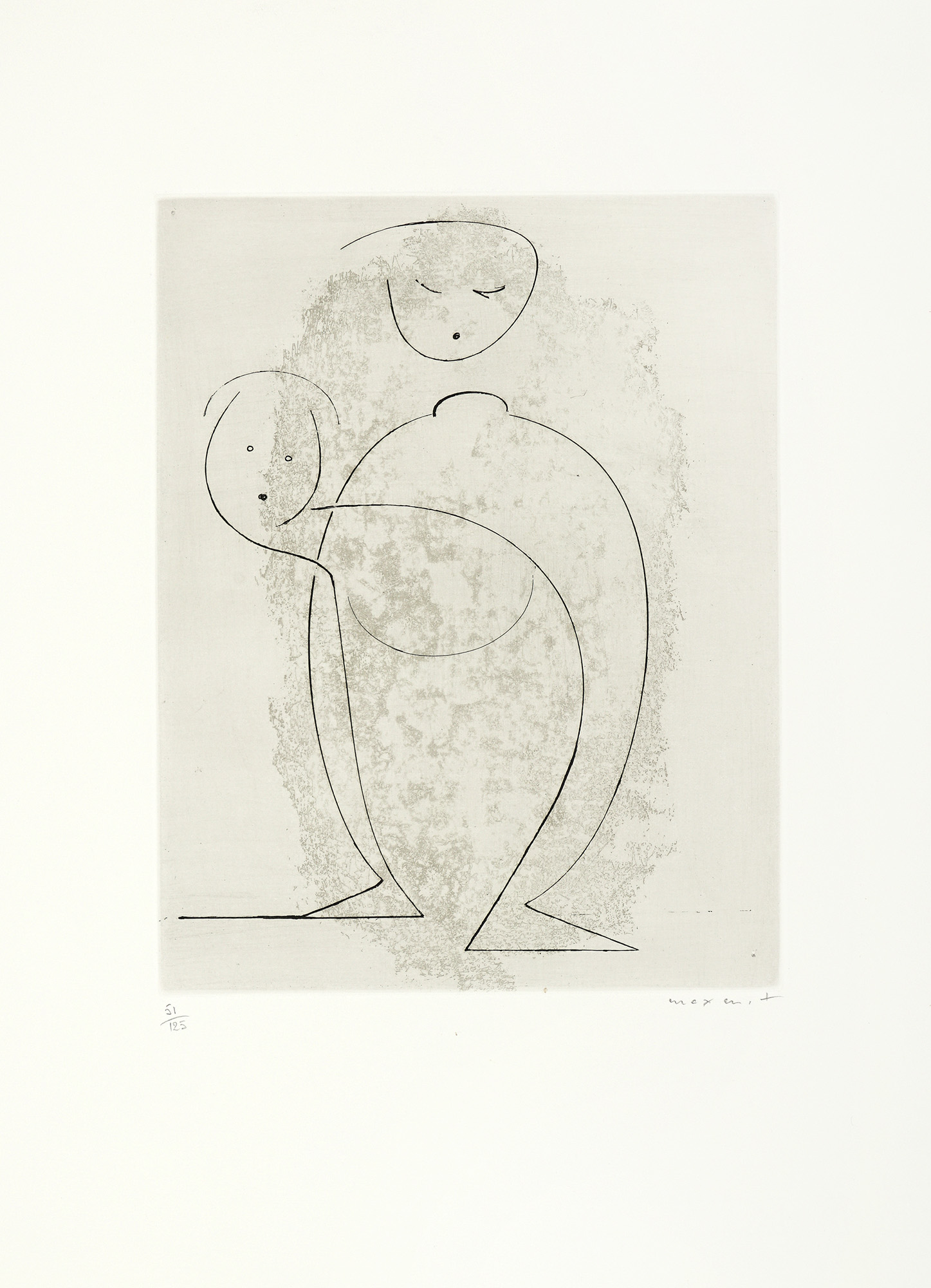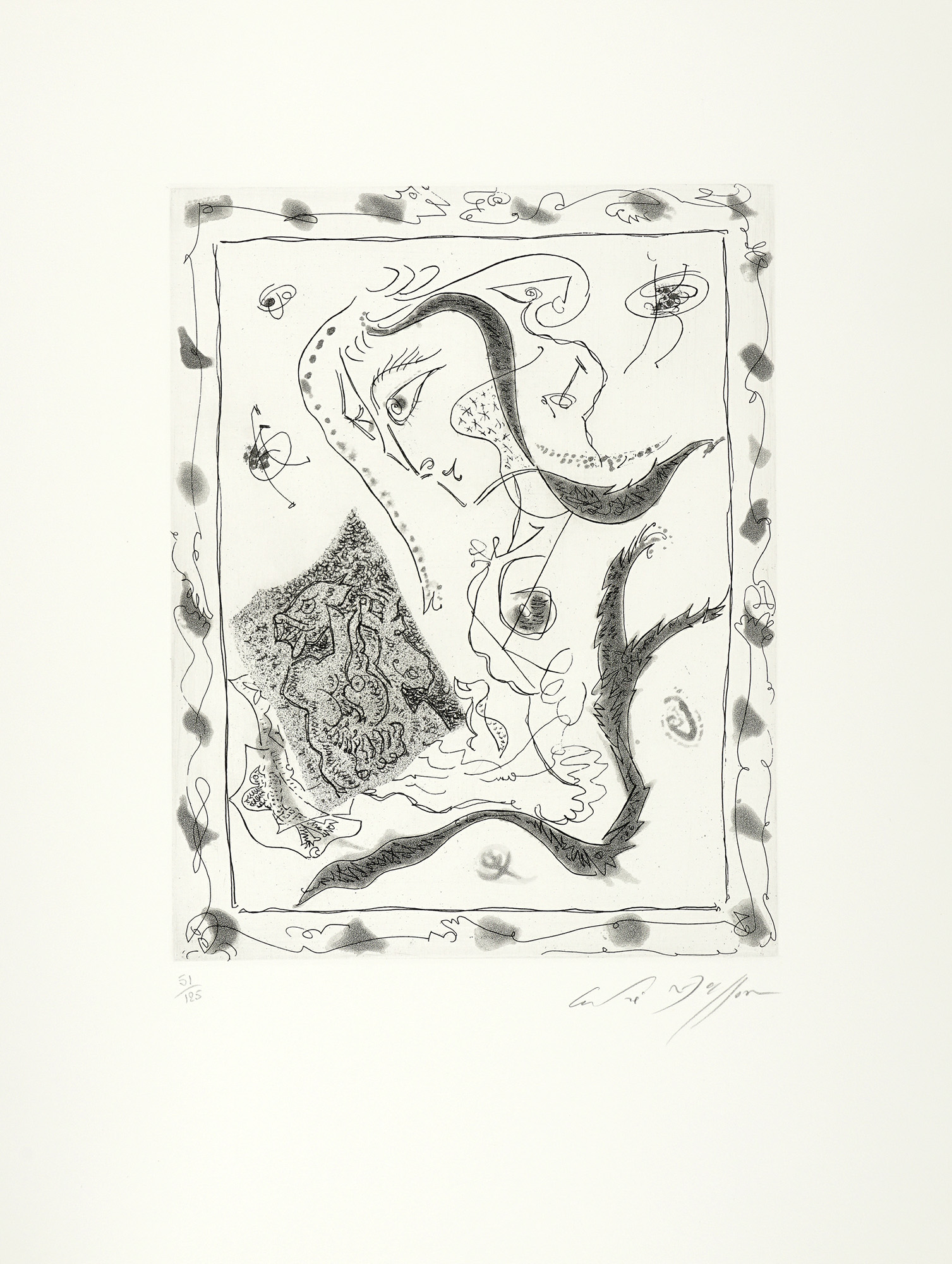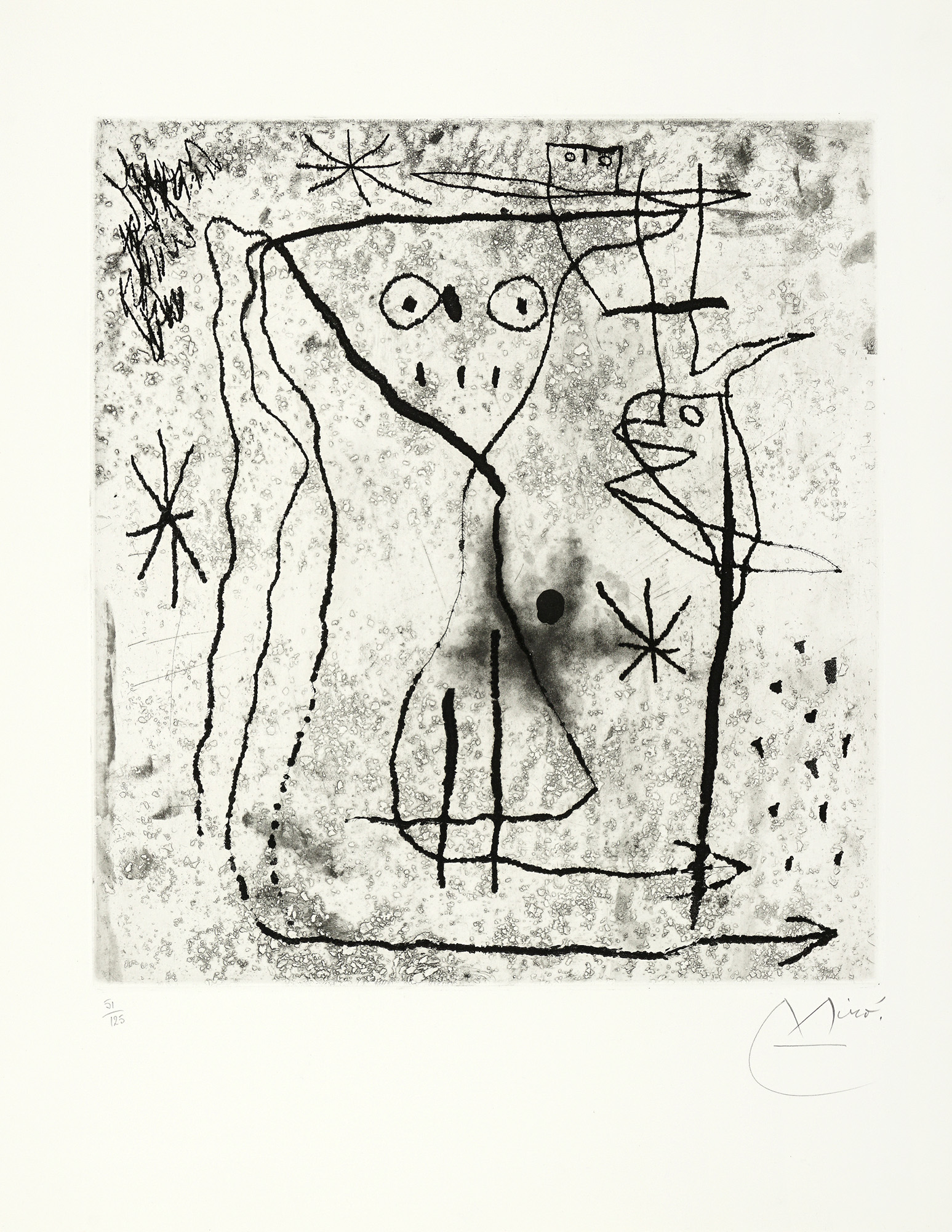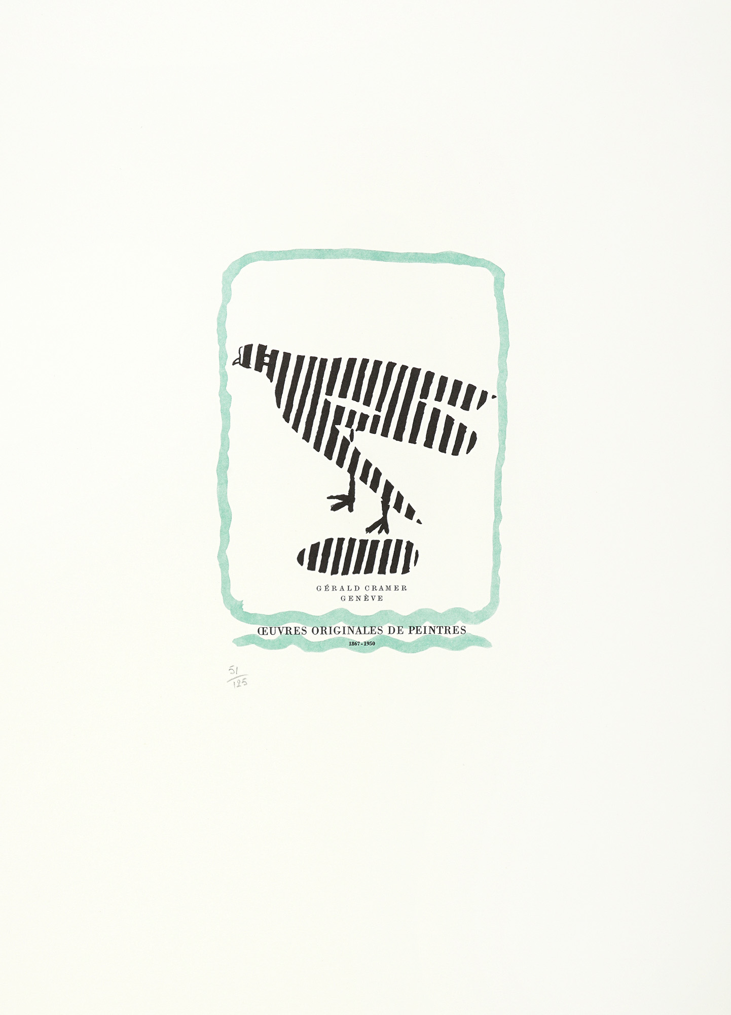 In-folio (mm 530x425). Pagine 14, [16] con, complessivamente, 9 acqueforti di Pablo Picasso, Henry Moore, Joan Miró, André Masson, Marino Marini, Max Ernst, André Dunoyer de Segonzac, Marc Chagall e Zao Wou-Ki, 2 litografie originali a colori di Lynn Chadwick e David Siqueiros firmate dagli Artisti e 4 riproduzioni a colori non firmate di Jean Arp, Georges Braque, Henri Matisse e Jacques Villon. Ciascuna numerata e protetta da velina, contenuta sciolta entro bifolio didascalico. Lievi ed uniformi bruniture ad alcune delle veline e all'incisione di Chagall, altrimenti ottimo esemplare a bifoli sciolti, perfettamente conservato entro brossura originale muta, protetta da velina, in splendida cartella editoriale in lino con piatti in legno e fermaglio di chiusura in metallo realizzato da Alexander Calder. Tiratura in 125 esemplari numerati, una delle 85 copie adibite alla vendita. (1)Opera realizzata per i trent'anni di attività di Gérald Cramer, libraio ed editore ginevrino, che ha prodotto alcuni dei libri d'artista più importanti del suo tempo.