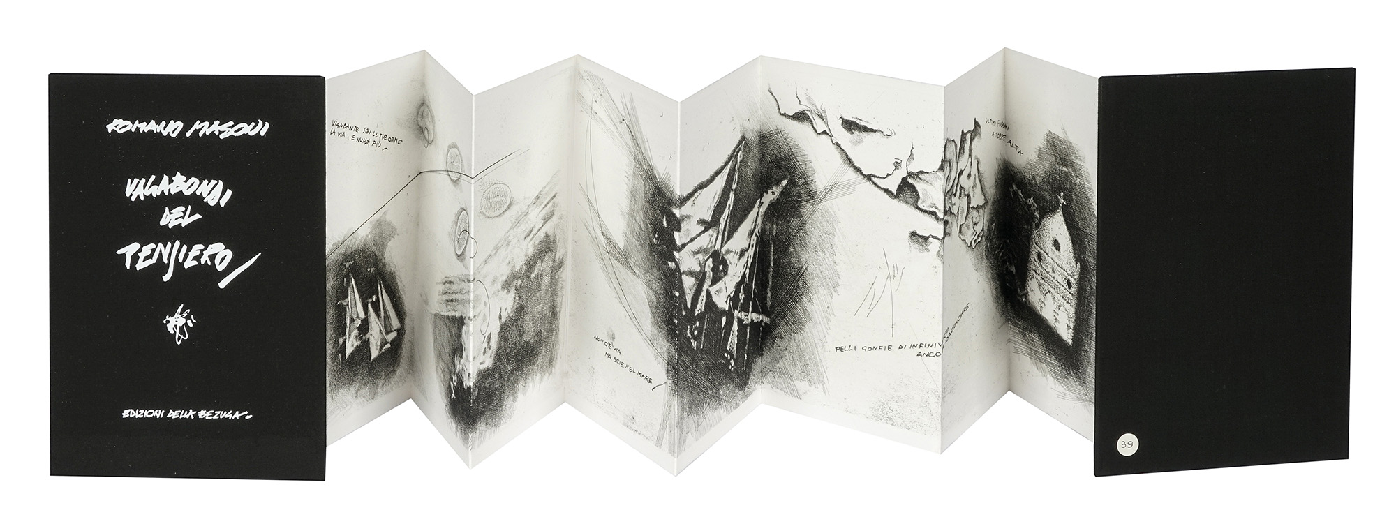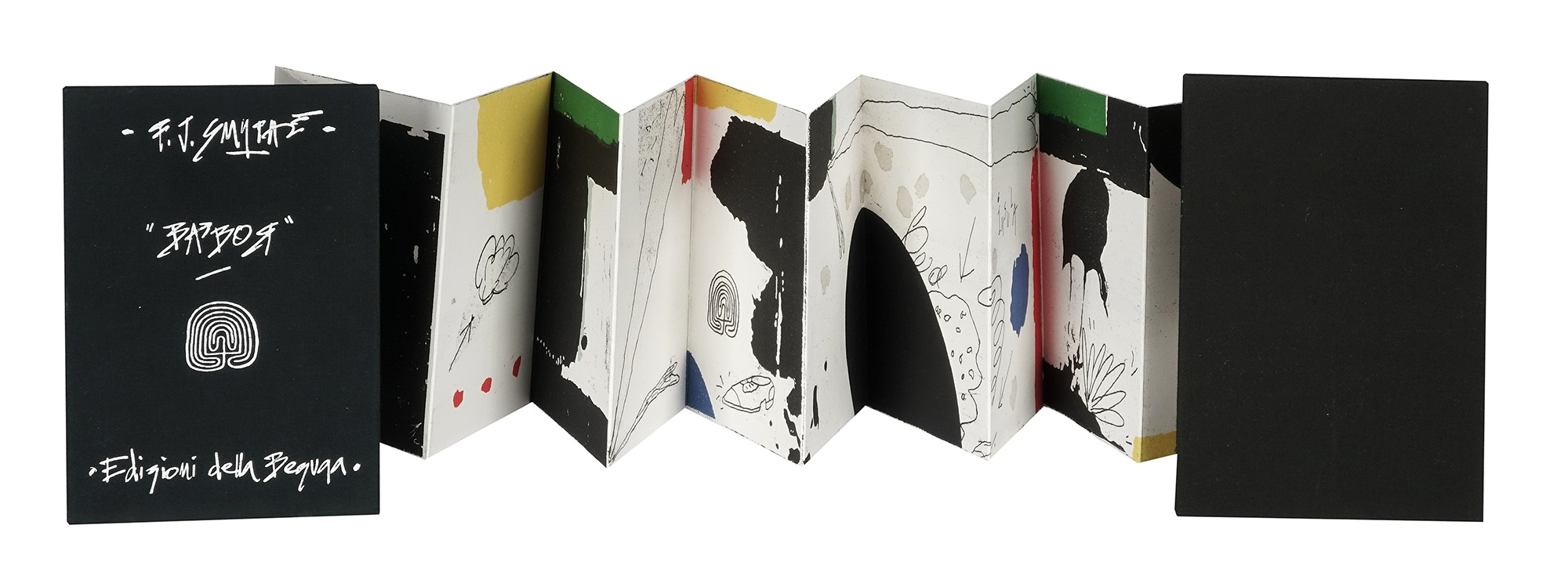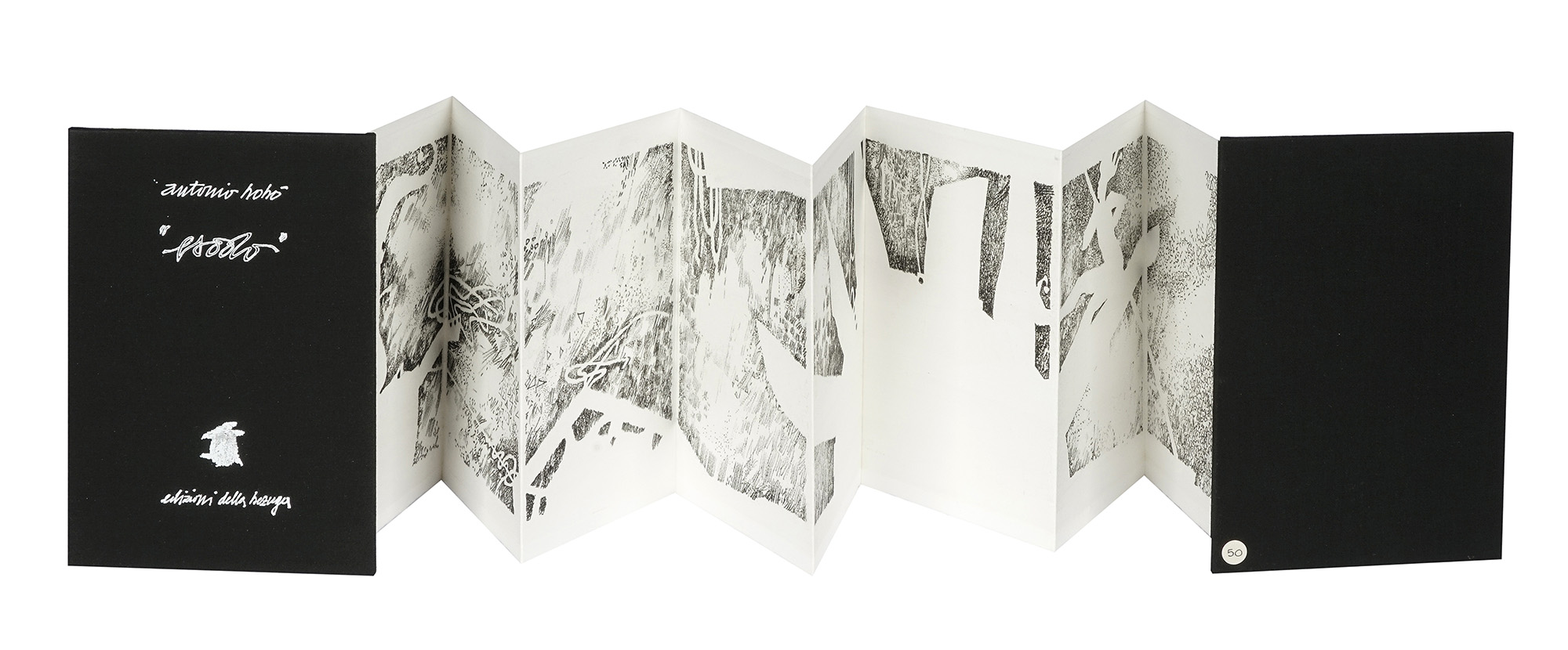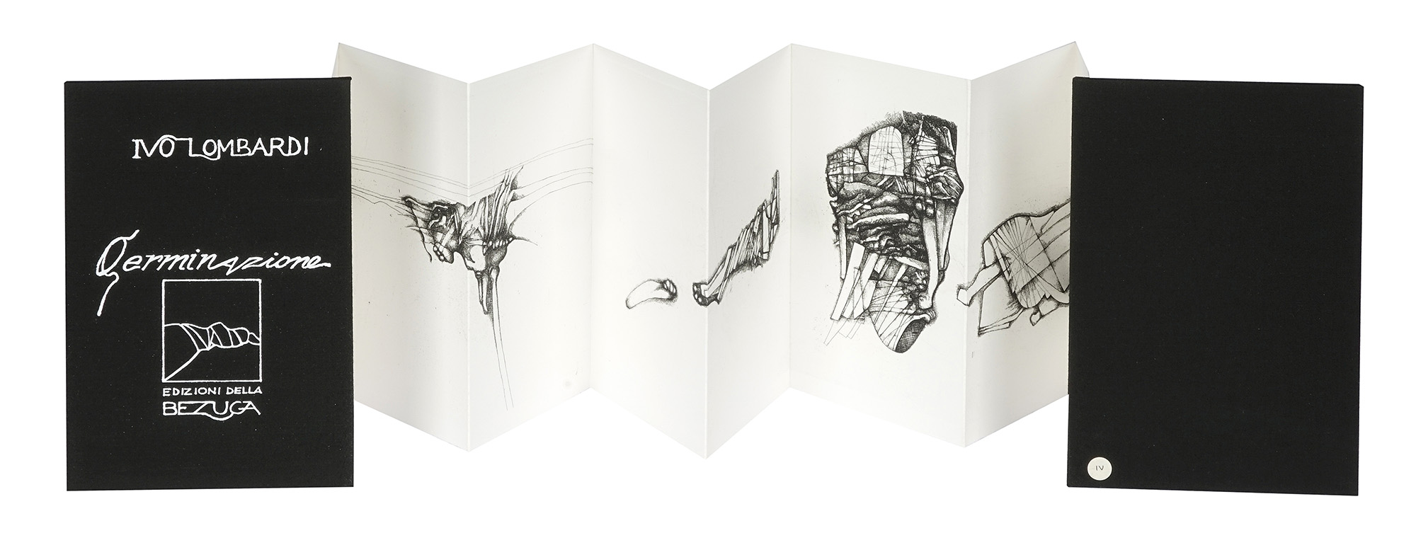 Compongono il lotto: 1) Lombardi Ivo, Germinazione. Firenze: Edizioni della Bezuga, 1989. In-8° (chiuso: mm 170x100; aperto: mm 170x1400 ca.). Leporello interamente illustrato a ceramolle. Legatura editoriale in piena tela, con titoli al piatto. Uno dei 25 esemplari in numeri romani, numerati e firmati a matita dall'Artista al colophon, su una tiratura complessiva di 75 copie. 2) Bobò Antonio, Esodo. Firenze: Edizioni della Bezuga, 1989. In-8° (chiuso: mm 170x100; aperto: mm 170x1400 ca.). Leporello interamente illustrato a ceramolle. Legatura editoriale in piena tela, con titoli al piatto. Uno dei 50 esemplari in numeri arabi, numerati e firmati a matita dall'Artista al colophon, su una tiratura complessiva di 75 copie. 3) Smythe Francisco Javier, Babor. Firenze: Edizioni della Bezuga, 1989. In-8° (chiuso: mm 170x100; aperto: mm 170x1600 ca.). Leporello interamente illustrato all'acquaforte, ritoccata a mano dall'Artista. Legatura editoriale in piena tela, con titoli al piatto. Uno dei 100 esemplari in numeri arabi, numerati e firmati a matita dall'Artista al colophon, su una tiratura complessiva di 125 copie. 4) Masoni Romano, Vagabondi del pensiero. Firenze: Edizioni della Bezuga, 1989. In-8° (chiuso: mm 170x100; aperto: mm 170x1400 ca.). Leporello interamente illustrato a ceramolle. Legatura editoriale in piena tela, con titoli al piatto. Uno dei 50 esemplari in numeri arabi, numerati e firmati a matita dall'Artista al colophon, su una tiratura complessiva di 75 copie. (4)