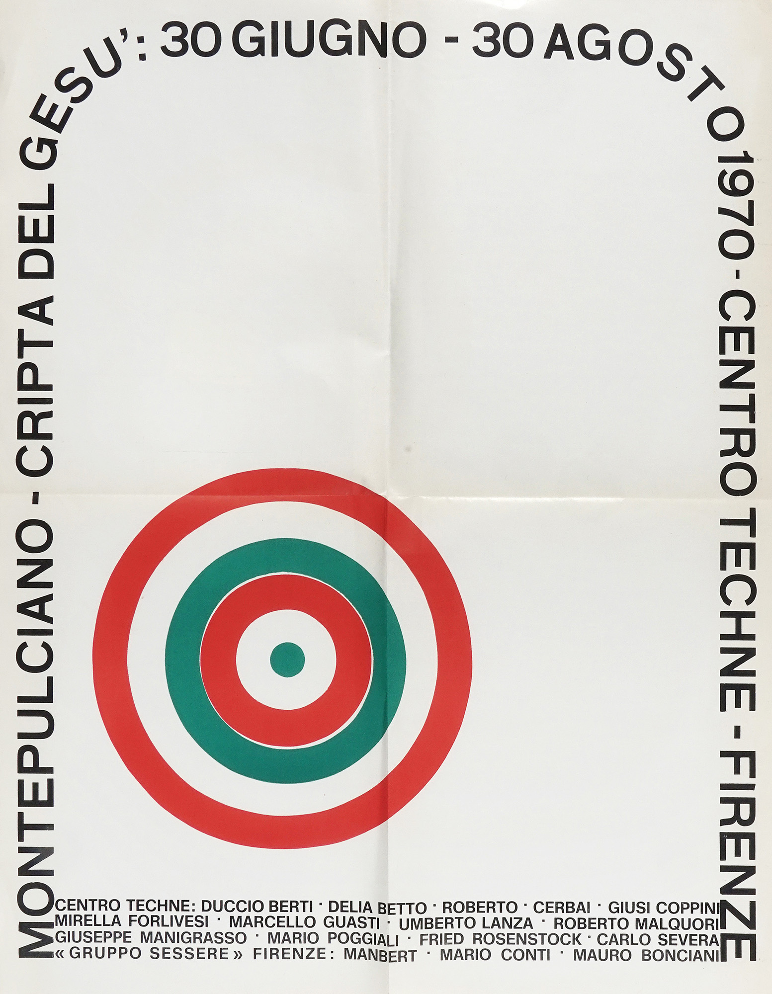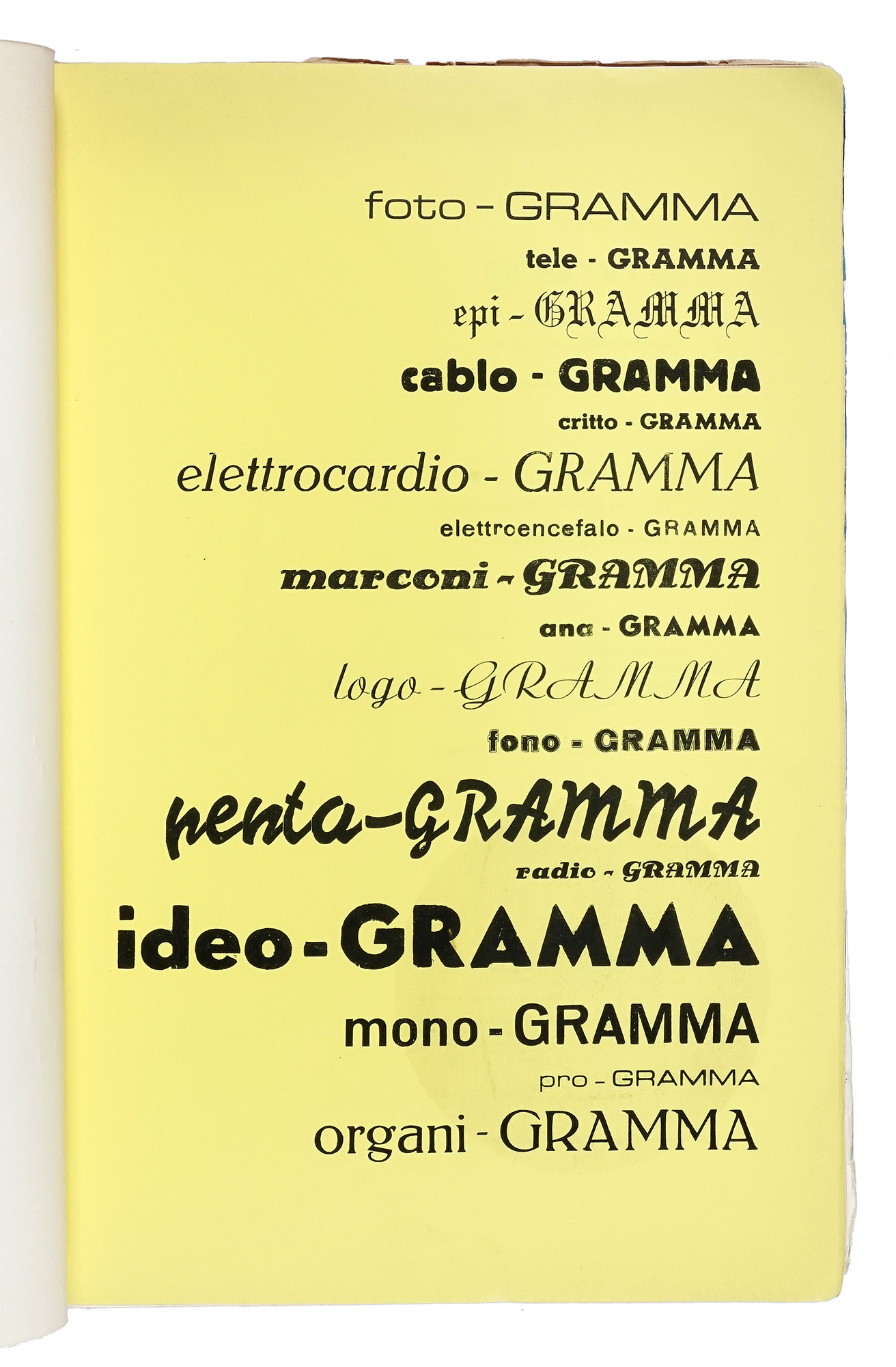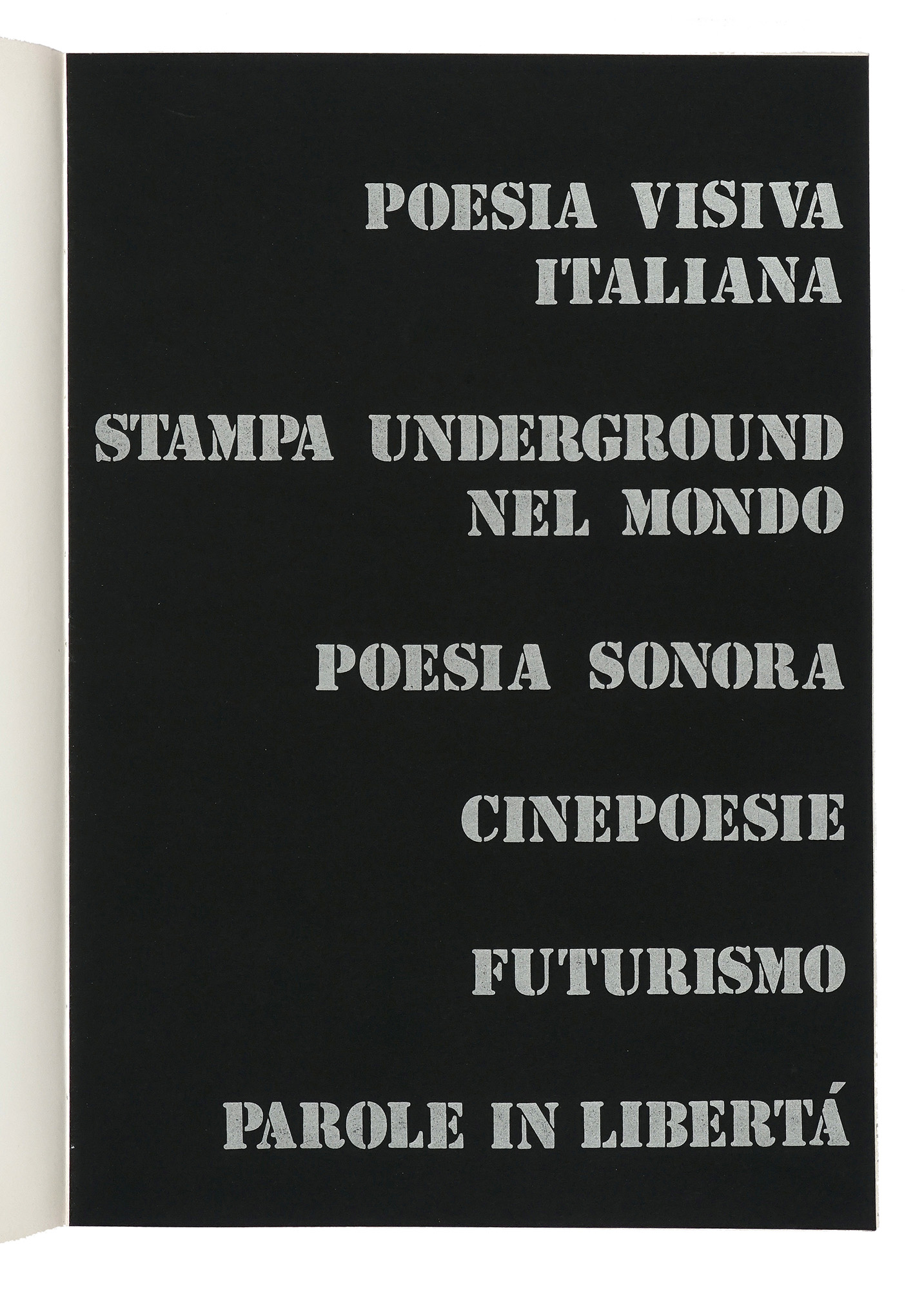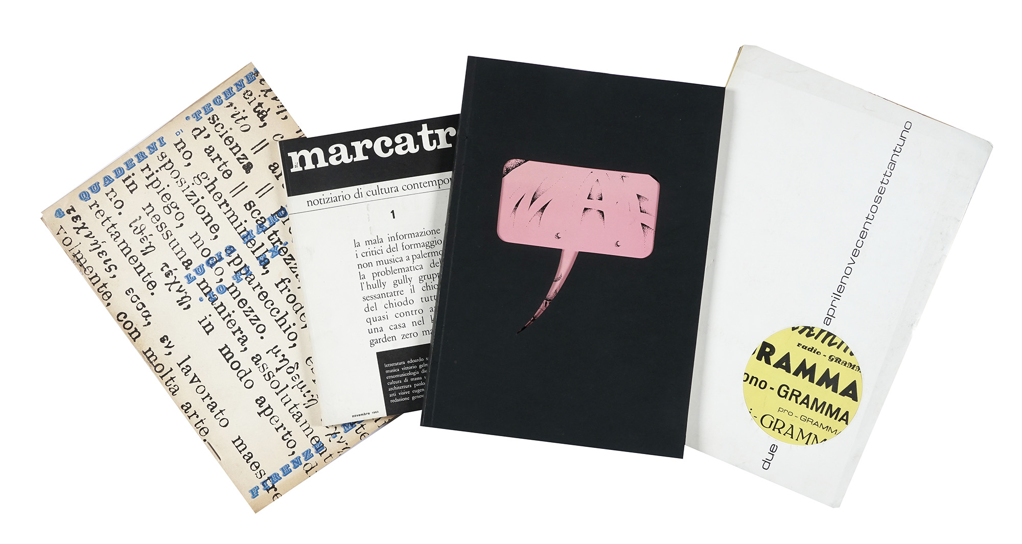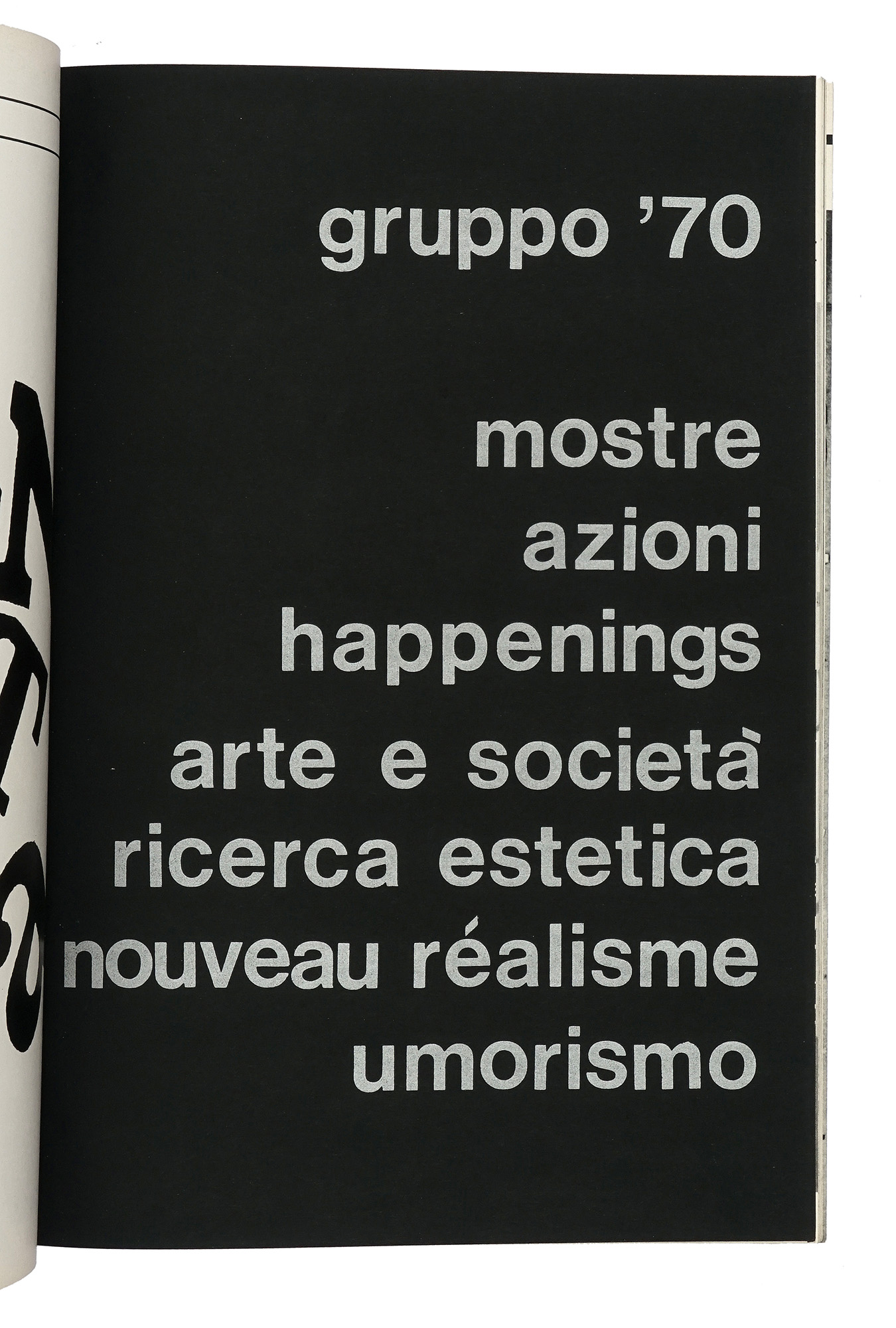 Ciclostile spillato in-4° (mm 310x215). Carte [60]. Brossura editoriale originale impressa a due colori. Staccato, ma perfettamente conservato, il piatto anteriore, altrimenti ottima copia. SI AGGIUNGE: Manifestazioni Artistiche Fiorentine. Editore: Techne, 1971. In-4° (310x215). Ottima copia, profusamente illustrata. Brossura originale illustrata, in perfetto stato di conservazione. SI AGGIUNGE: Gramma n. 2. Lecce: Gramma, 1971. In-4° (mm 334x225). Con interventi originali di Miccini, Coppini, Corallo, Saviolo e altri. Brossura originale ben conservata. SI AGGIUNGE: Marcatrè. Notiziario di cultura contemporanea. N. 1 novembre 1963. SI AGGIUNGE: Delia Betto. S.d.e [i.e. 1970 ca.]. In-4° (mm 315x231). Con [1] carta di testo e 3 opere originali dell'Artista. Difetti. SI AGGIUNGE: Manifesto Montepulciano - Cripta del Gesù: 30 Giugno-30 Agosto 1970 - Centro Techne - Firenze (mm 580x450). (6)II OPERA: Catalogo della rassegna, che vedeva coinvolti artisti come Eugenio Miccini, Ketty La Rocca, Mirella Bentivoglio, Giuseppe Chiari, Lamberto Pignotti, Giuliano Scabia, Sebastiano Vassalli, Giorgio Ulivi e molti altri. III OPERA: Raro numero di questa rivista collettiva diretta da Salvatore Vergari, composta di testi critici e contributi visuali di artisti in gran parte italiani. IV OPERA: Raro primo numero di questa rivista di arte contemporanea, letteratura, architettura e musica, fondata e diretta da Eugenio Battisti, attiva dal 1963 al 1970.
