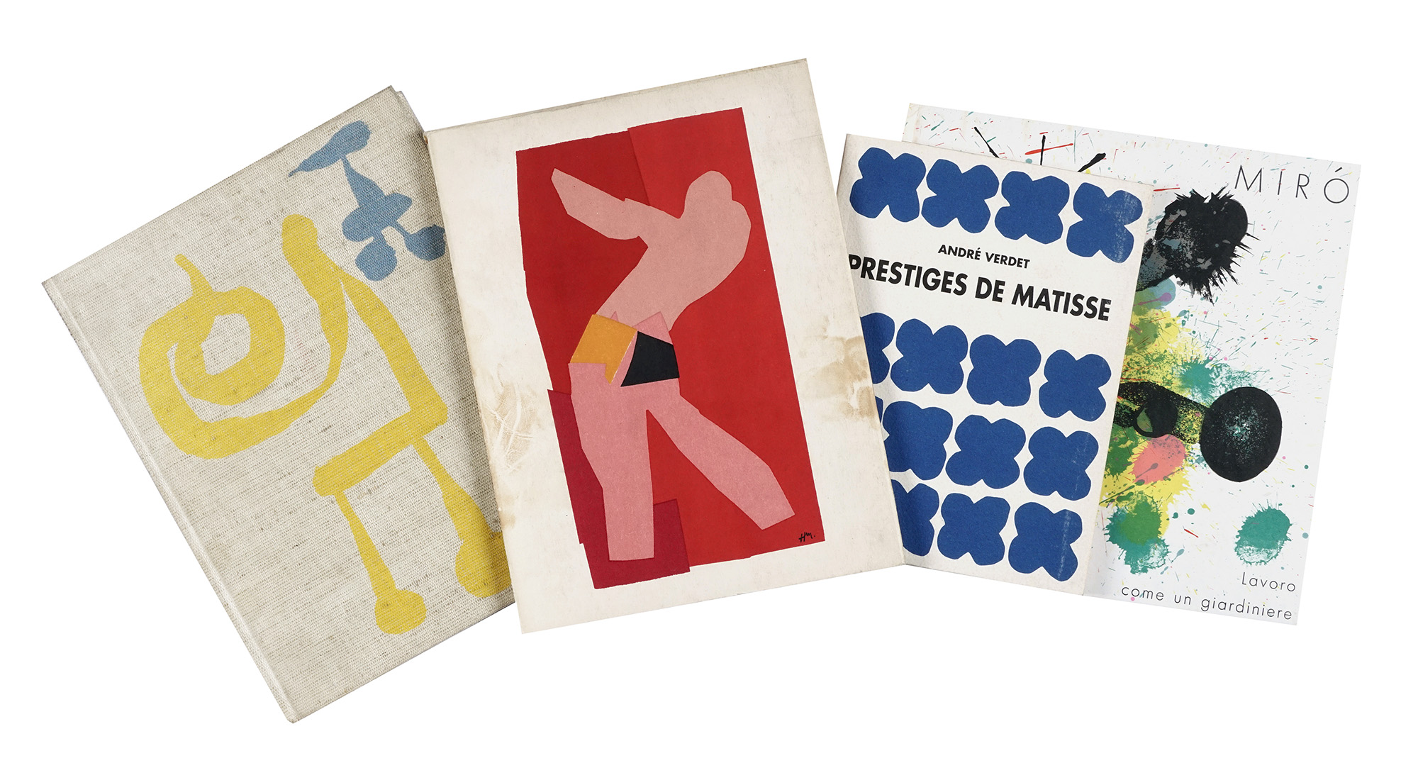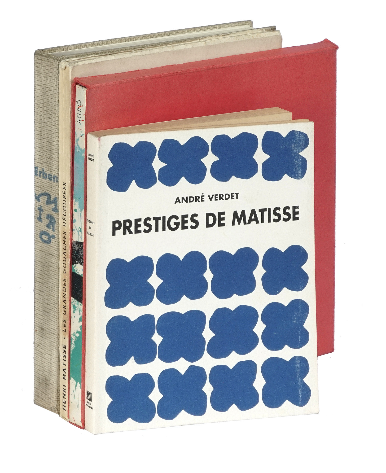 In-8° (mm 240x180). Pagine 74, [4]. Con 13 litografie a colori delle opere di Henri Matisse, di cui 3 a doppia pagina nel testo, tirate da Mourlot. Esemplare perfettamente conservato, con sovraccoperta editoriale litografata al piatto anteriore dall'Artista. Macchie. SI AGGIUNGE: Verdet André, Prestiges de Matisse. Nice: Editions Dromadaire, s.d. [i.e. 1990 ca.]. SI AGGIUNGE: Miró Joan, Lavoro come un giardiniere... Venezia: Edizioni del Cavallino, 1964. SI AGGIUNGE: Erben Walter, Joan Miró. Milano: Silvana editore, 1959. Con la firma autografa di Miró alla seconda carta bianca.