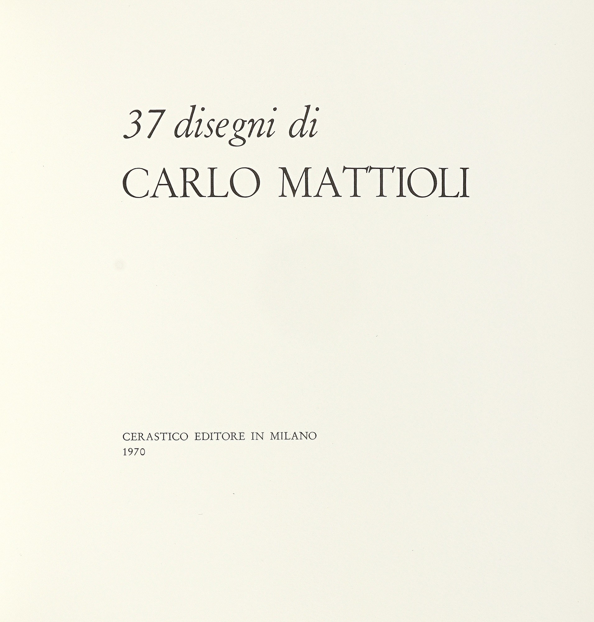 1 cartella in-folio grande (mm 660x470). [1] carta di testo, [1] di colophon e 5 splendidi ritratti litografici a colori di Carrà, Longhi, Guttuso, Morandi e Rosai realizzati da Carlo Mattioli, tutti numerati e firmati a matita dall'Artista. Minime tracce d'uso, altrimenti ottima conservazione. Cartella editoriale in piena tela, con titoli al piatto anteriore. Tiratura in 50 esemplari, il nostro (I/XV come si evince dalle tavole) probabilmente appartenente all'Autore o all'Editore. SI AGGIUNGE: Id., 37 disegni di Carlo Mattioli. Milano: Cerastico, 1970. In-4° (mm 280x260). Carte [3], 1 bianca e 37 tavole in fotolito a colori di disegni dell'artista. Sciolta, 1 bella tavola litografica a colori di Carlo Mattioli, numerata e firmata a matita. Ottima copia. Legatura originale in pieno cartonato, con la riproduzione della firma dell'Artista al piatto anteriore; entro custodia in cartonato, con lievi difetti. Uno dei primi 200 esemplari con la litografia originale a colori, su una tiratura complessiva di 1500 copie. (2)II OPERA: Ricercata ed interessante raccolta di schizzi, prove di colore e forme di Carlo Mattioli, nata da un'idea di Gino Cerastico.