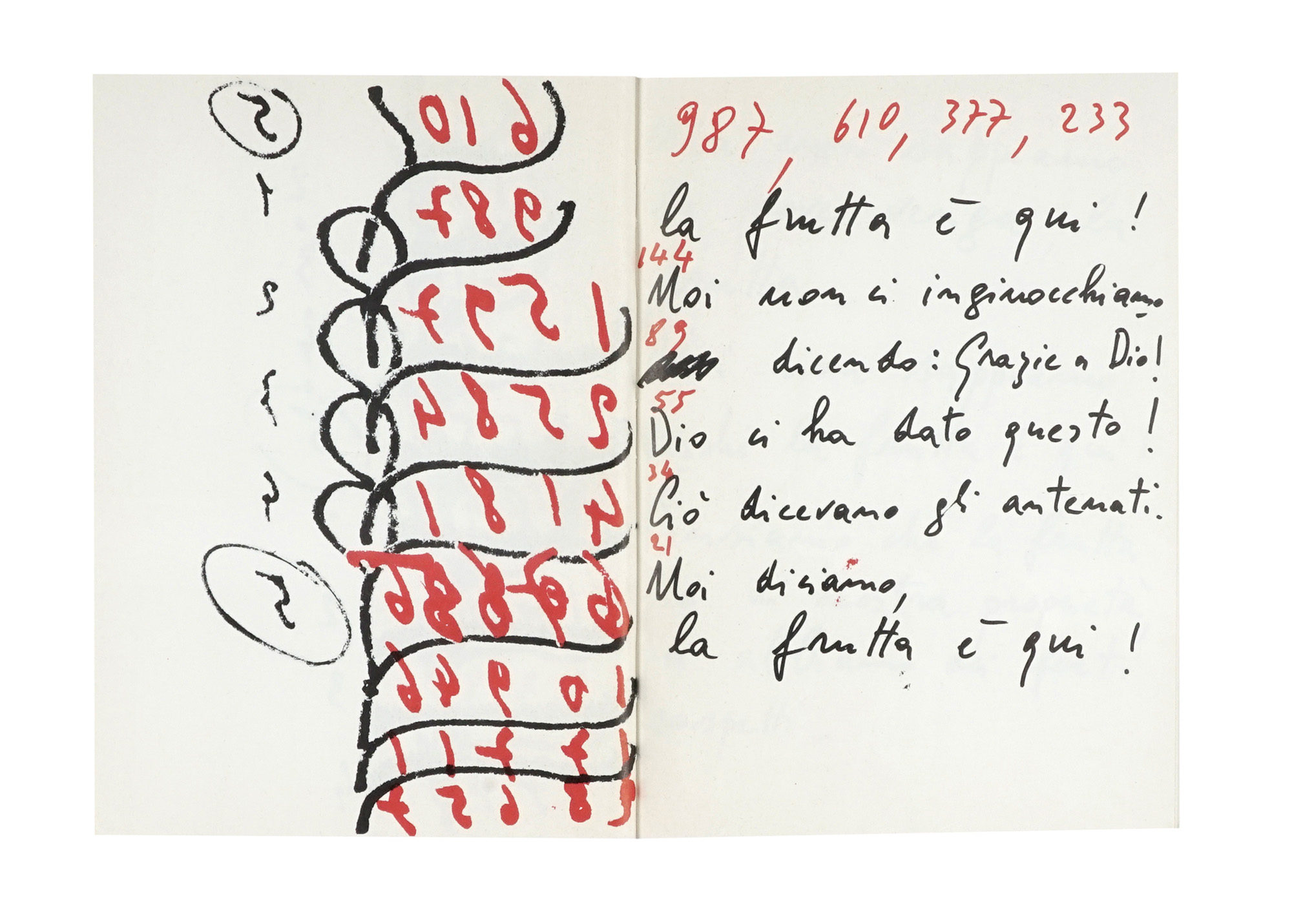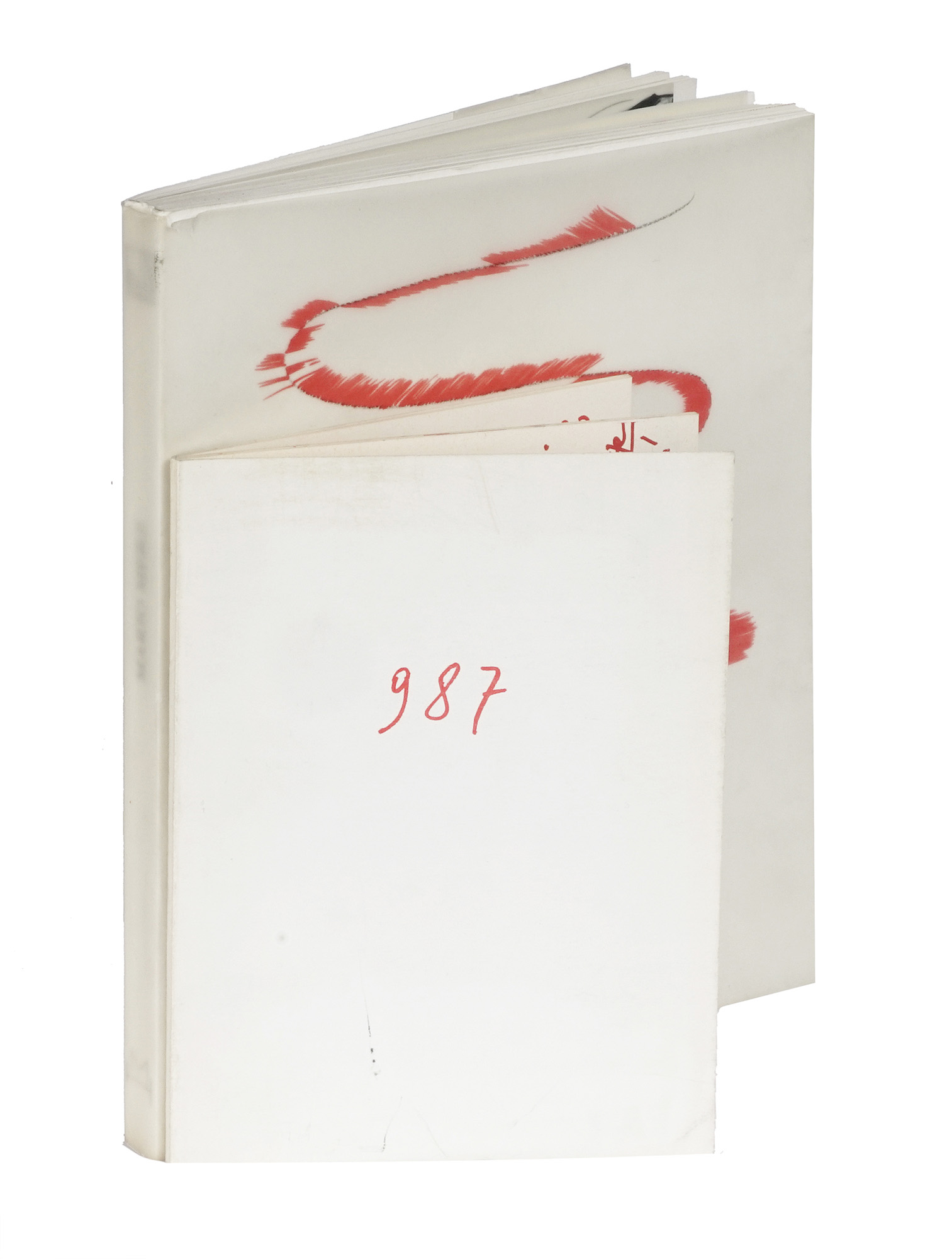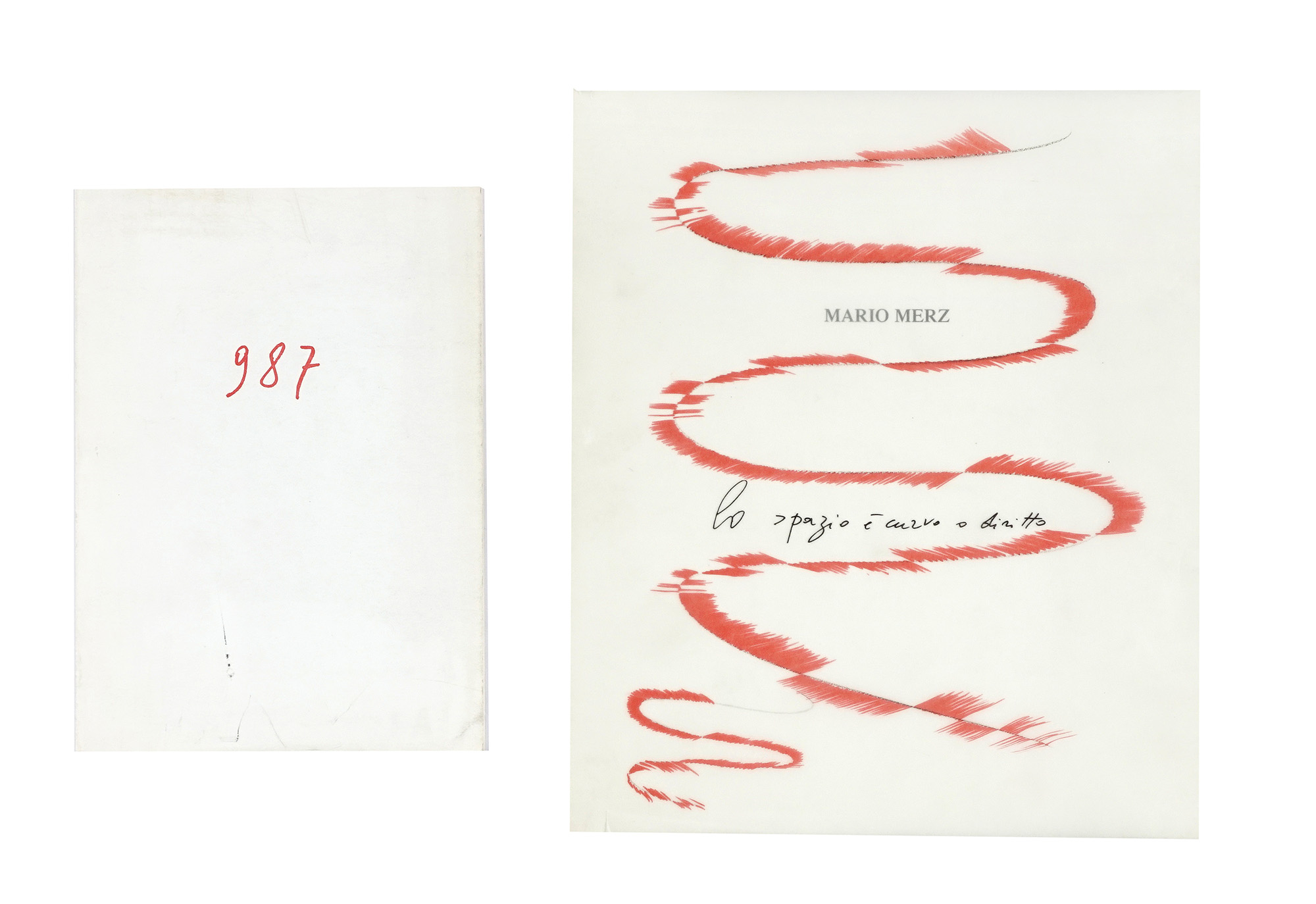 In-8° (mm 205x150). Carte [20]. Con segni, numeri, disegni e testo stampati alternativamente in rosso e nero. Brossura editoriale con titolo in rosso al piatto. Trascurabile macchia al piatto, altrimenti ottima copia. Esemplare con numerazione non apposta, su una tiratura di 987 copie. SI AGGIUNGE: Mario Merz. Firenze: Hopeful Monster, 1990. (2)I OPERA: Prima edizione di quest'opera, la cui sfrontatezza visuale è accentuata da un uso preponderante del rosso e del nero, colori che spesso ricorrono nei libri di Merz. La scrittura e il disegno si susseguono tra le pagine senza gerarchie, relegando il nome dell'Autore al colophon ed esautorando ogni altro elemento costitutivo del libro. Il testo, disposto verticalmente e orizzontalmente, in modo che per leggerlo si debba ruotare il libro di 90 gradi, ripete più volte una serie di frasi che ruotano intorno al concetto di proprietà. II OPERA: Bel catalogo della mostra di Mario Merz al Centro per l'Arte Contemporanea Luigi Pecci del 1990.