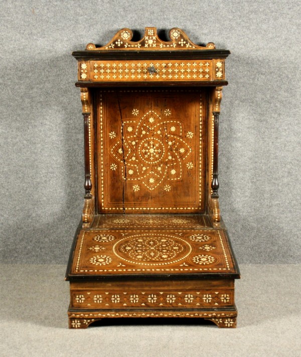 Inginocchiatoio in legno intarsiato in osso. Inizi XIX secolo. Mis. Lung. cm. 55 Alt. cm. 92 Prof. cm. 62 ca.