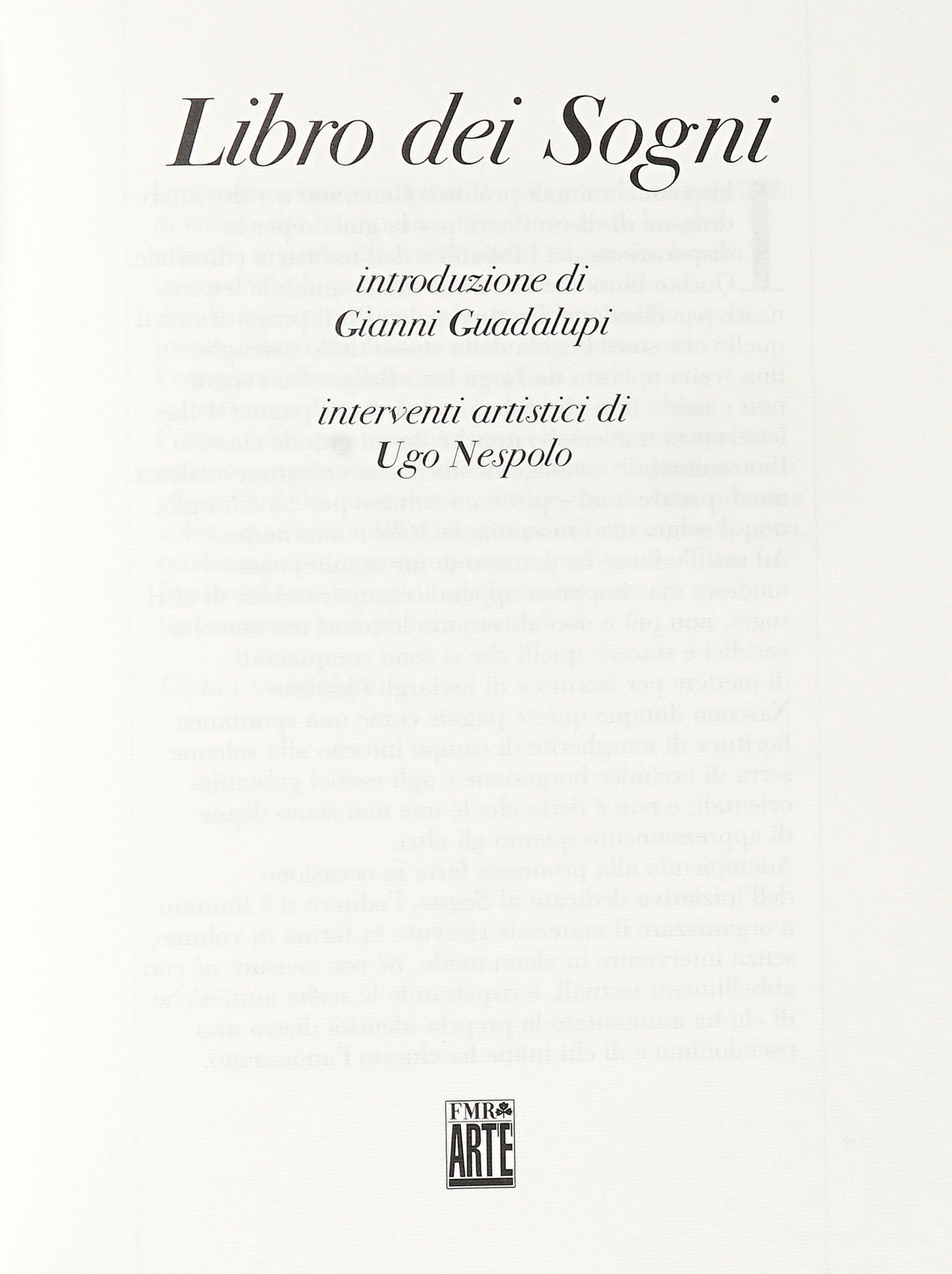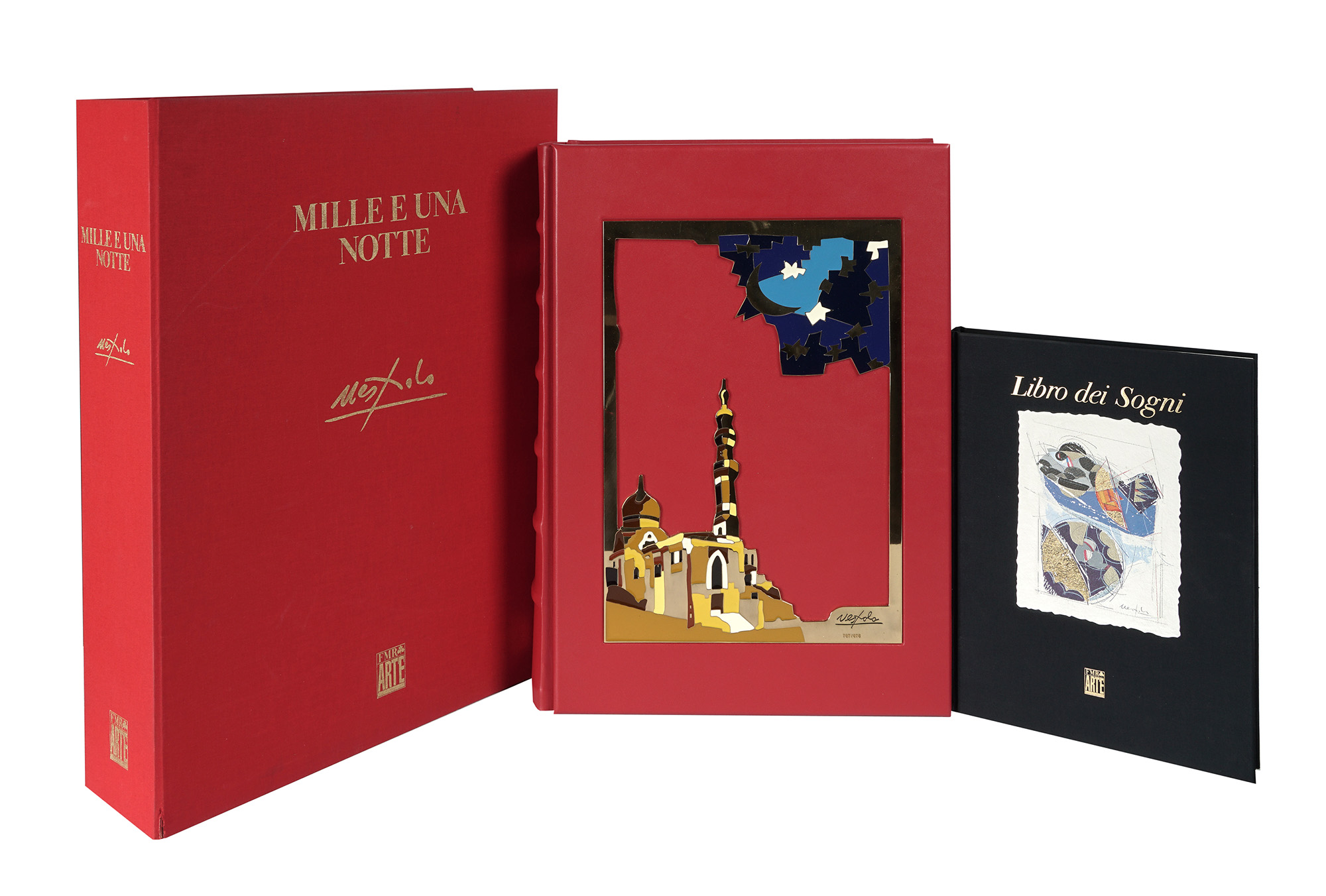 In-folio (mm 450x325). Splendido esemplare in barbe, con 10 tavole litoserigrafiche di Ugo Nespolo. Legatura in pelle rossa con titoli in oro al dorso a 6 nervi e un esemplare dell'opera Sogno d'Oriente dell'Artista, in otto colori a smalto su lastra di ottone trattata a specchio, ricoperta in oro 24 k mediante procedimento galvanico, numerata e firmata. Uno dei 975 esemplari in numeri arabi, su una tiratura complessiva di 1050, firmati a matita dall'Artista. SI AGGIUNGE: Libro dei sogni [...] interventi artistici di Ugo Nespolo. Milano: FMR - Art'è, 2006. In-4° (mm 299x230). (2)II OPERA: Speciale edizione fuori commercio impreziosita da un'opera di Nespolo al piatto anteriore e da otto illustrazioni dell'Artista nel testo. Uno dei 1000 esemplari in cifre arabe, destinati ai sottoscrittori FMR-ART'è che hanno aderito all'iniziativa Sogno e realizzati raccogliendo oltre centosessanta sogni inviati dai partecipanti.
