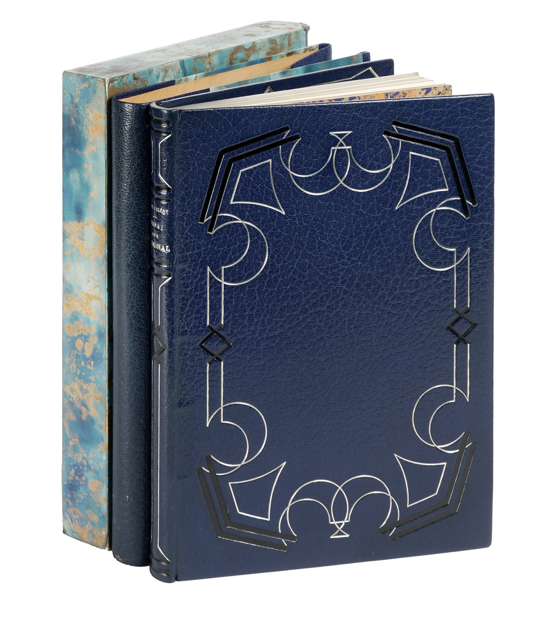 In-4° (mm 240x170). Pagine 102, [8], 4 bianche. Testo impresso in nero e blu, lievissima brunitura omogenea, per il resto copia perfetta. Es. n. VIII, uno dei 30 esemplari fuori commercio su Vélin a la Cuve. Bella legatura coeva in pieno marocchino blu con impressioni in nero e argento ai piatti, titolo in argento al dorso, tagli argento, sguardie in carta marmorizzata, con camicia corredata in mezza pelle e carta marmorizzata, il tutto contenuto entro custodia editoriale in pieno cartonato con unghiature in pelle. Legatura firmata "Canpe by Corriez". Conservata all'interno la brossura editoriale dell'opera. Alla prima carta bianca dedica manoscritta di Paul Valery a Canape. Ex-libris Georges Canape applicato in principio. (1)Edizione originale.