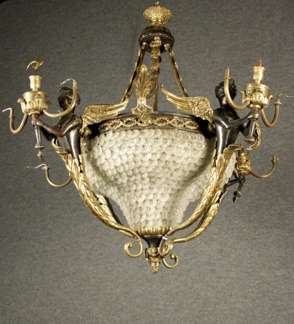 Lampadario a cesto in bronzo dorato formato da quattro bracci a guisa di figure feminili alate brunite, guarnito con fiori in vetro. Inizi XX secolo. Mis. Alt. cm. 80 Diam. cm. 85 ca.
