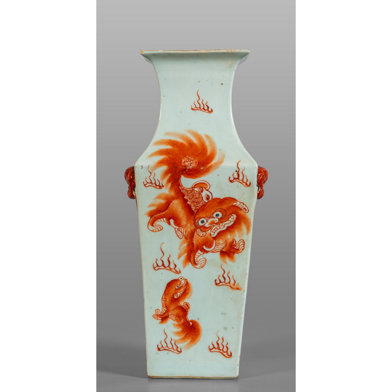 Vaso in porcellana di forma quadrata decorato con cane di Pho arancione Cina sec.XIX