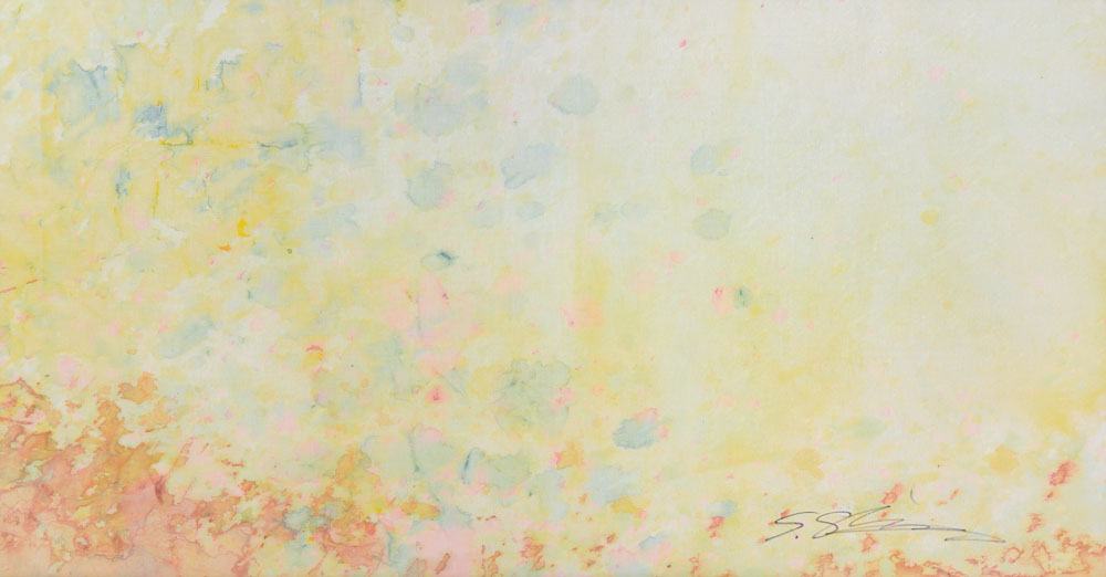 olio, acquerello ed inchiostro su tela applicata su tavola cm. 83x164, firma in basso a destra, opera realizzata durante una performance fatta sopra ad una gru in Itami (Giappone) nel 2000, certificato di autenticità della Galleria Arte Tivù (VE) allegato, certificato di autenticità e archivio dell'Associazione Shozo Shimamoto (RE) su foto.