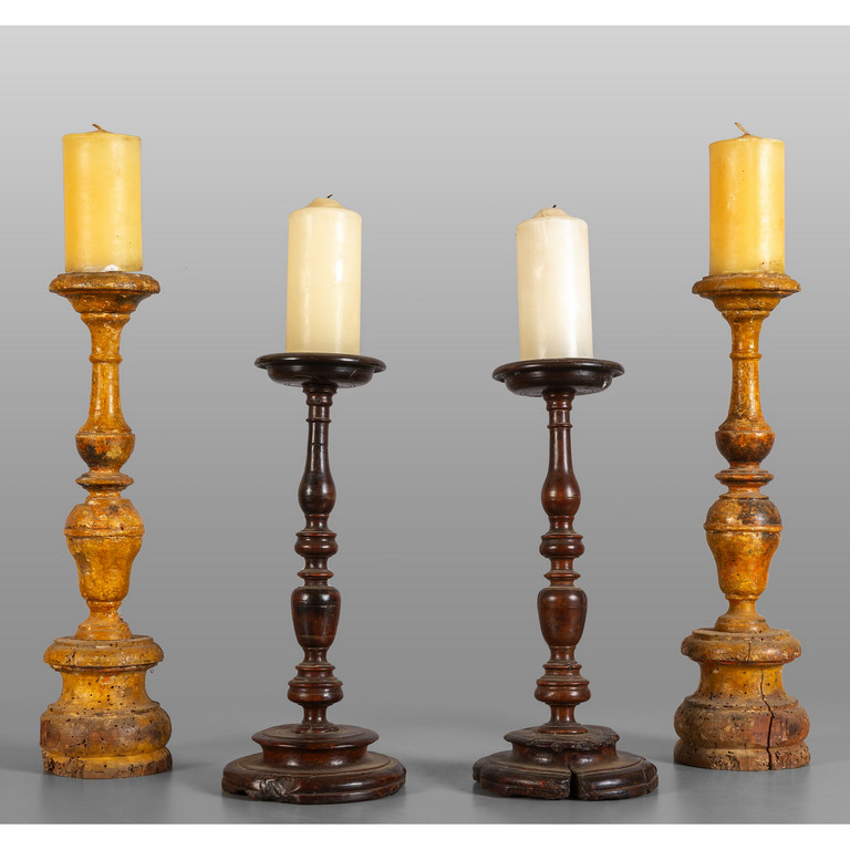 Coppia di candelieri in legno e coppia di candelieri laccati sec.XVIII