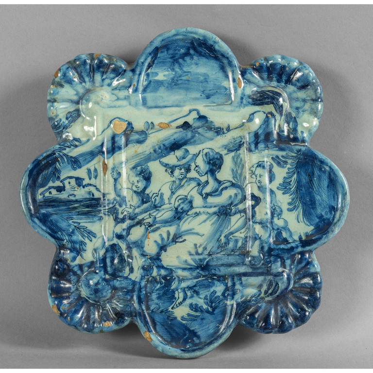 Tagliere in ceramica decorata in blu su fondo berrettino marca Lanterna Savona sec.XVIII