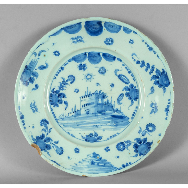 Piatto in ceramica blu su fondo berrettino decorato con castello centrale marca Stemma Savona sec.XVIII