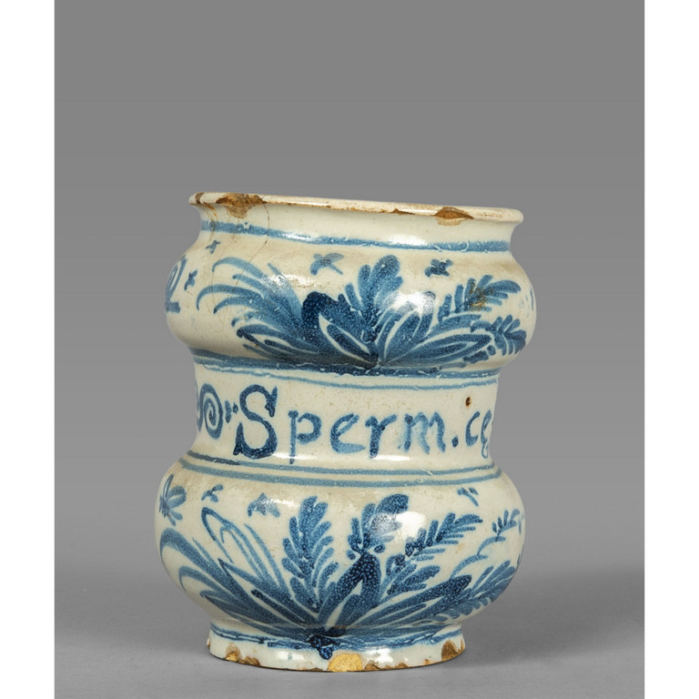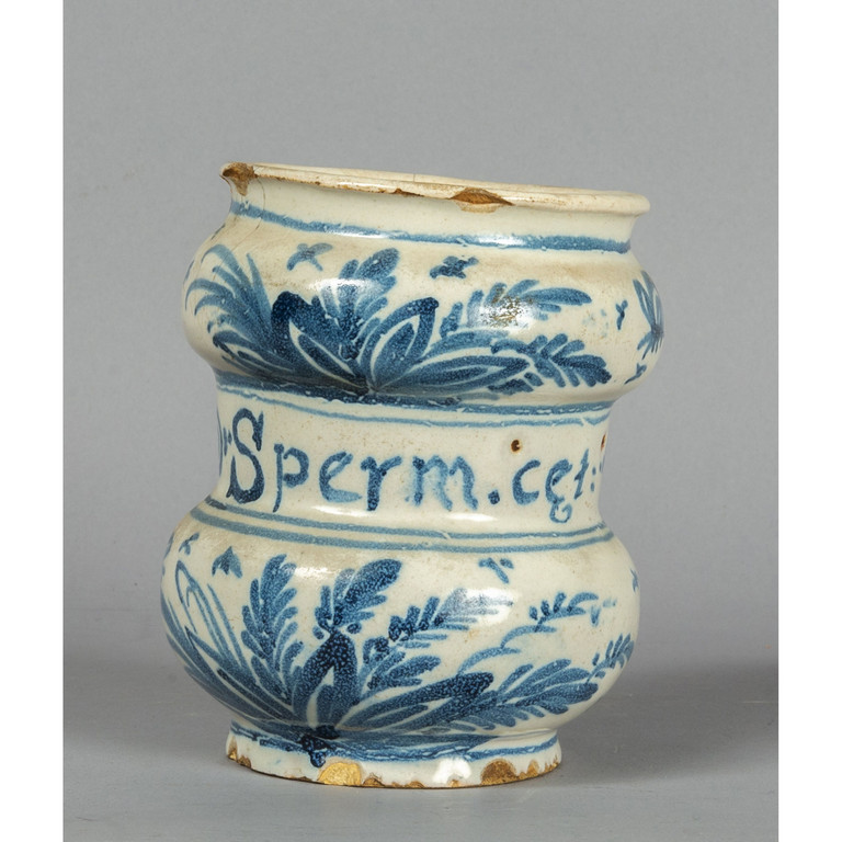 Piccolo albarello in maiolica bianca e blu s.to P.B. Savona sec.XVIII