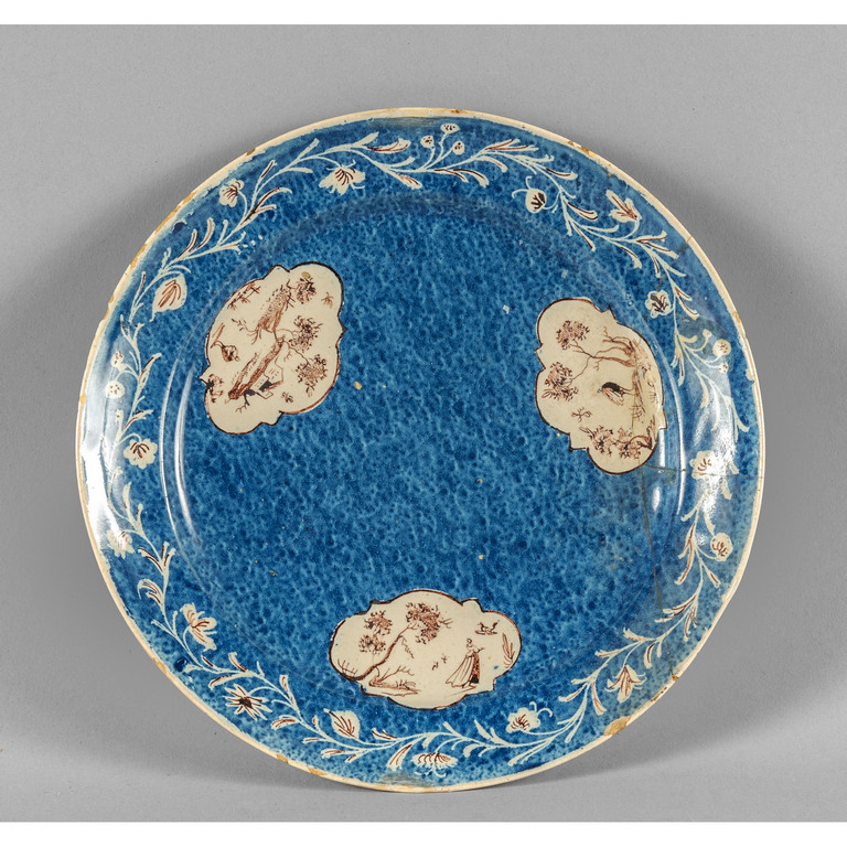Piatto in maiolica marmorizzato a fondo blu con riserve raffiguranti figure in un paesaggio Savona sec.XVIII