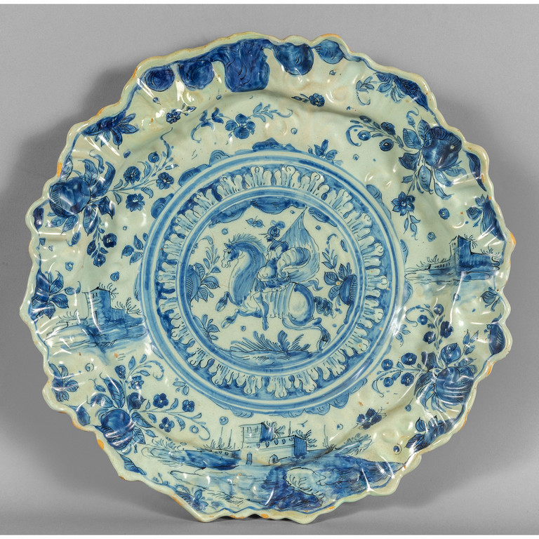Piatto da parata modello argenteria decorazione bianca e blu nel cavetto raffigurazione di San Giorgio marca Salomone Savona sec.XVIII