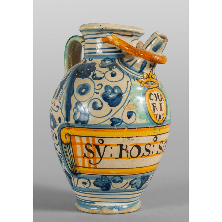 Brocca in maiolica policroma con scritta medicinale Montelupo sec.XVIII